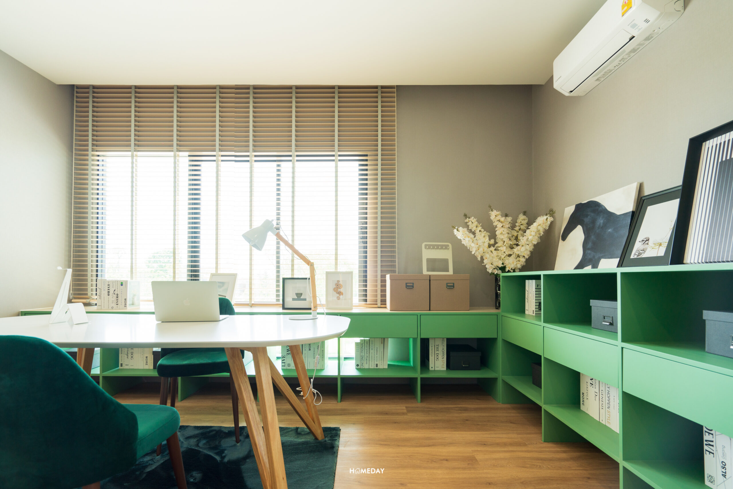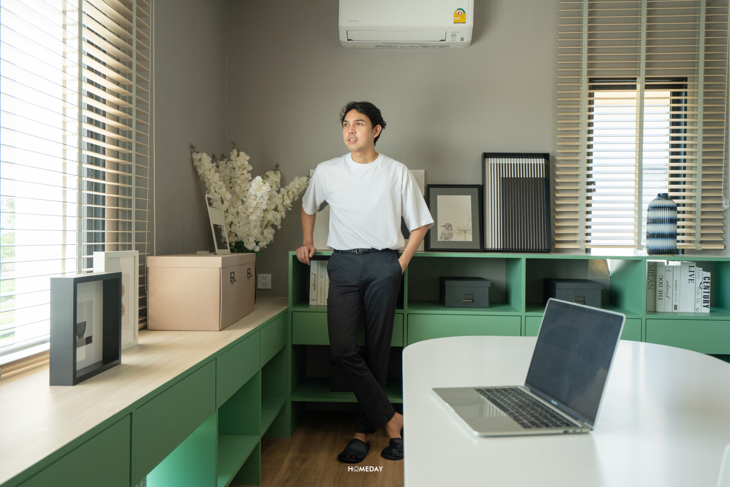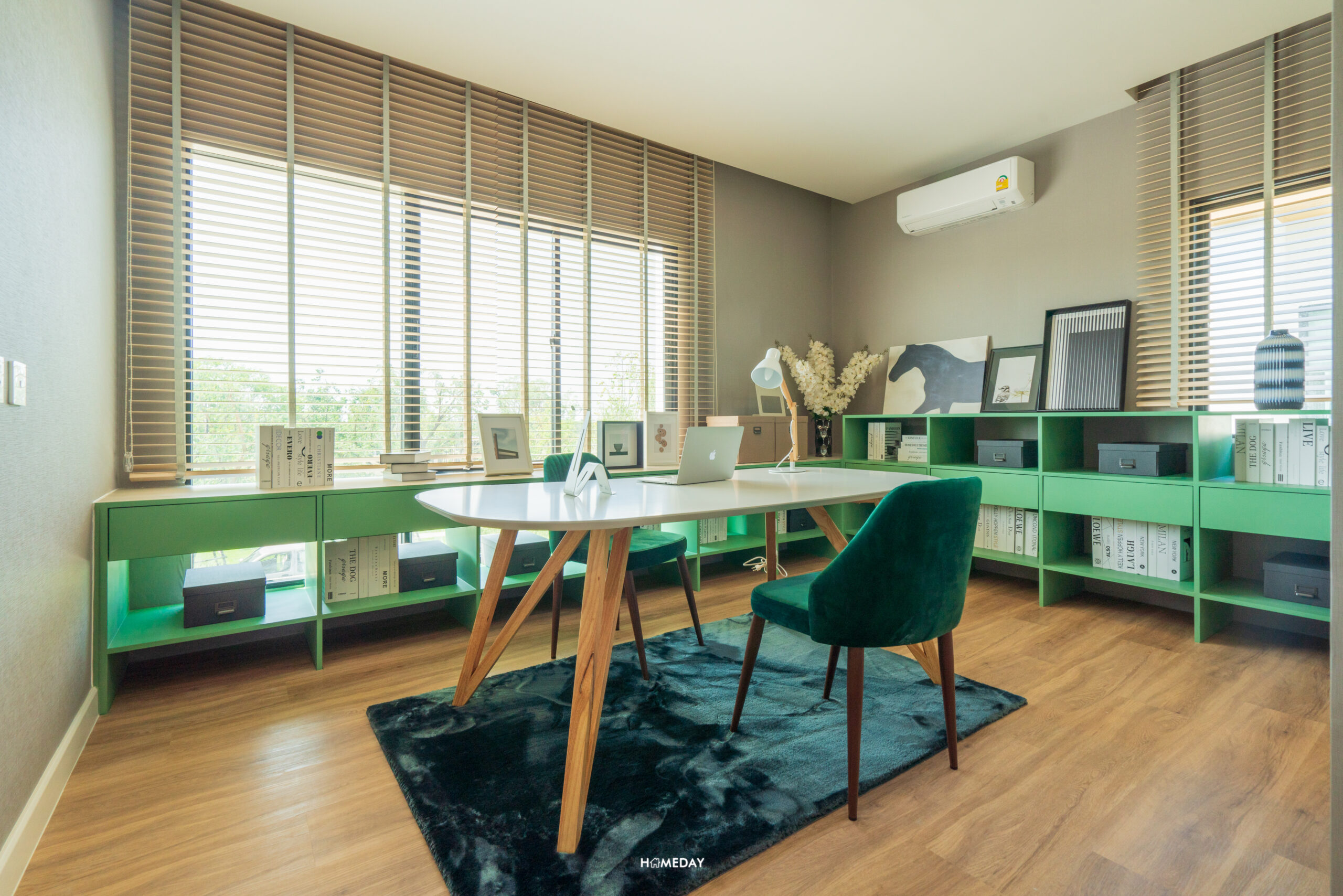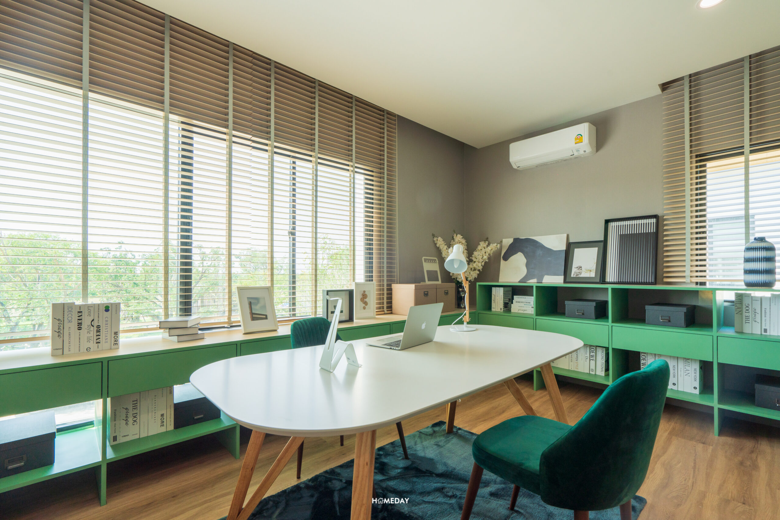 จากการออกแบบพื้นที่ให้เป็นห้องทำงาน จะเห็นได้เลยว่าภายในห้องสามารถใส่โต๊ะทำงานขนาดใหญ่ ไว้นั่งประชุมได้เลย รอบพื้นที่สามารถวางชั้นและตู้เก็บของได้แบบจัดเต็ม เหมาะกับคนที่ต้องการแยกพื้นที่ทำงานออกจากพื้นที่พักผ่อน และอยากได้พื้นที่ขนาดใหญ่ที่รองรับห้องน้ำในตัวเพื่อความสะดวกในการใช้งาน