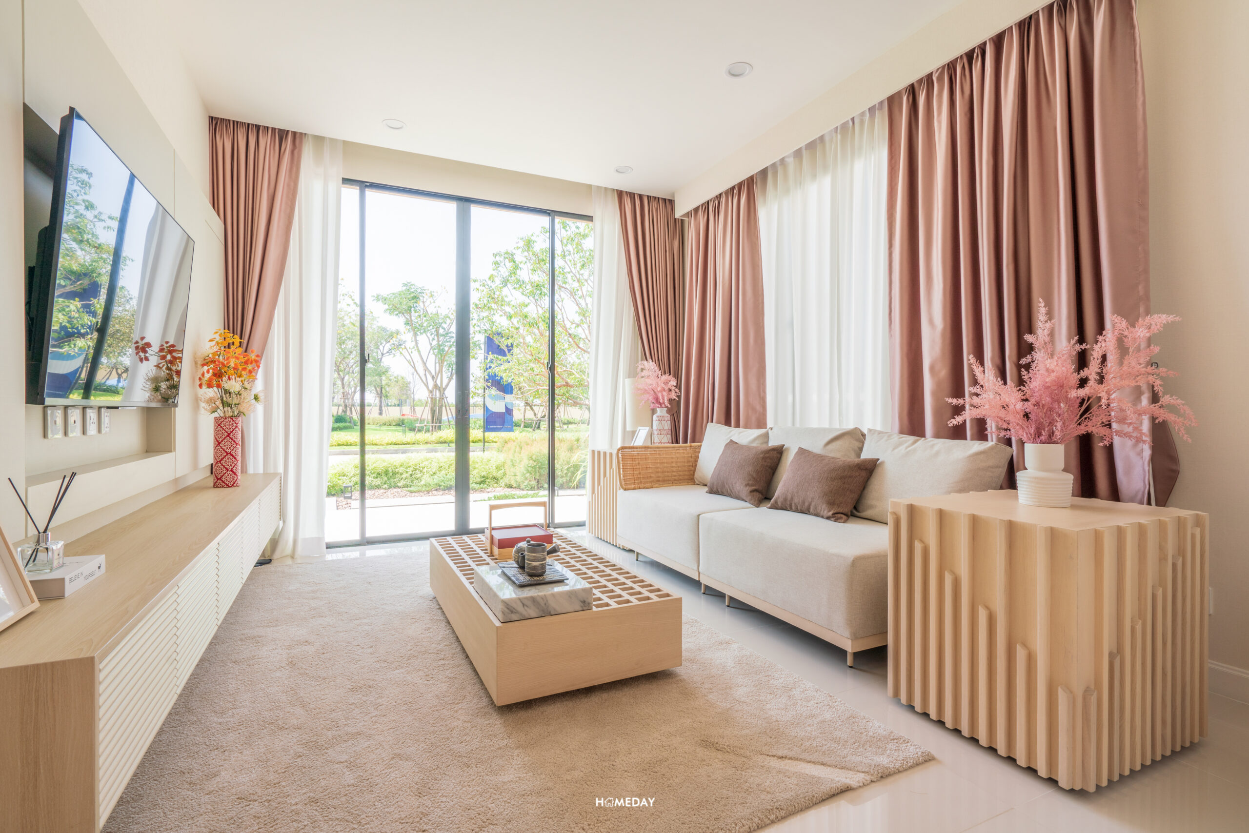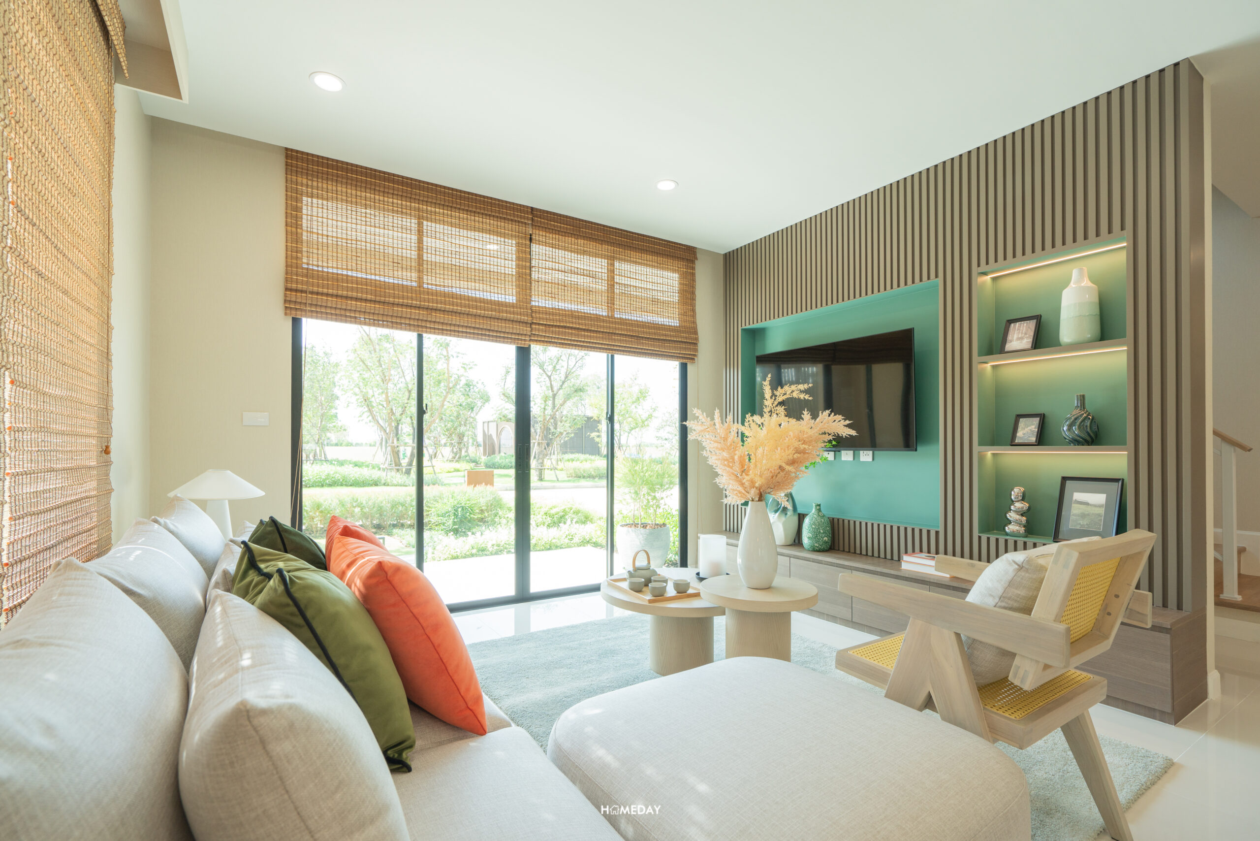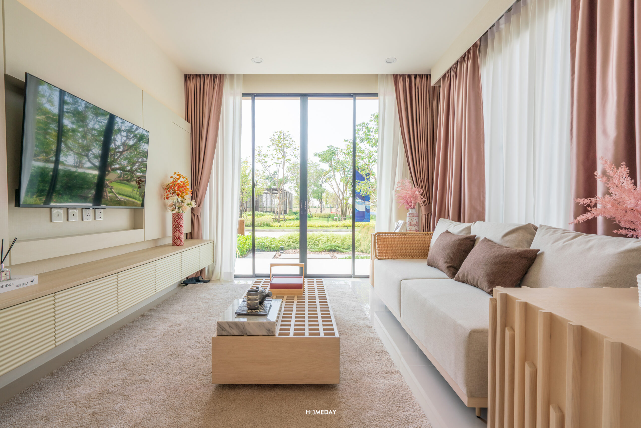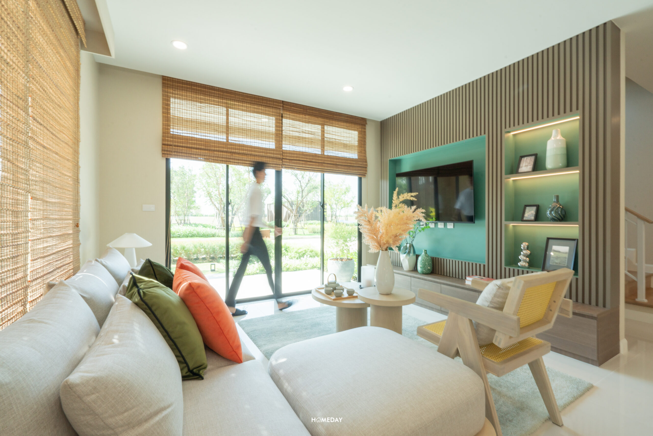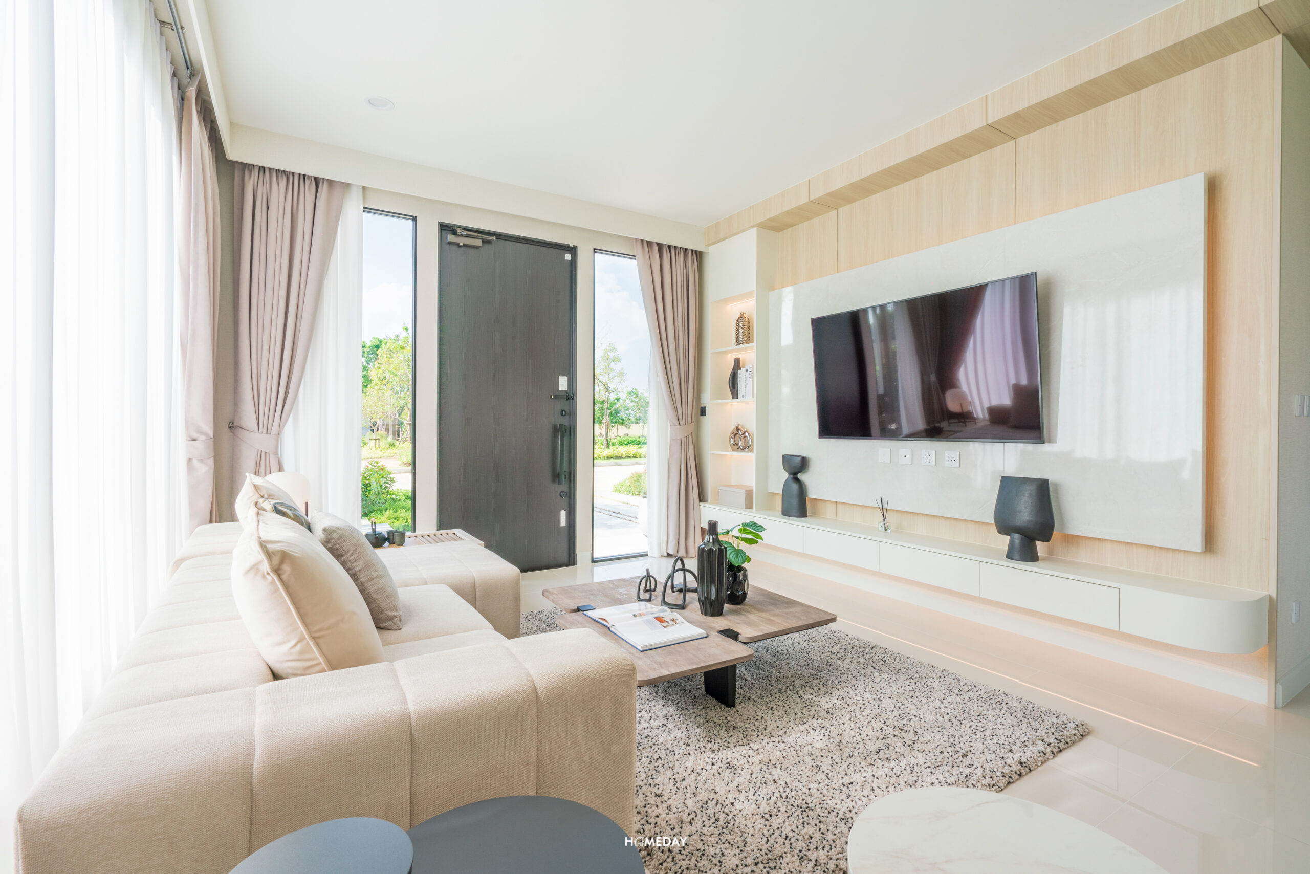 สำหรับชั้นวางทีวี ก็สามารถบิลต์อินตามแบบและดีไซน์ที่ชอบได้เลยนะครับ ตัวผนังได้พื้นที่กว้าง สามารถบิลต์อินเพื่อเพิ่มพื้นที่จัดเก็บในตัวได้เลย ส่วนขนาดของทีวีก็เลือกได้เต็มที่เลย ไม่ต้องกลัวว่าระยะการรับชมจะใกล้จนเกินไป เพราะค่อนข้างห่างกันพอสมควรเลยครับ