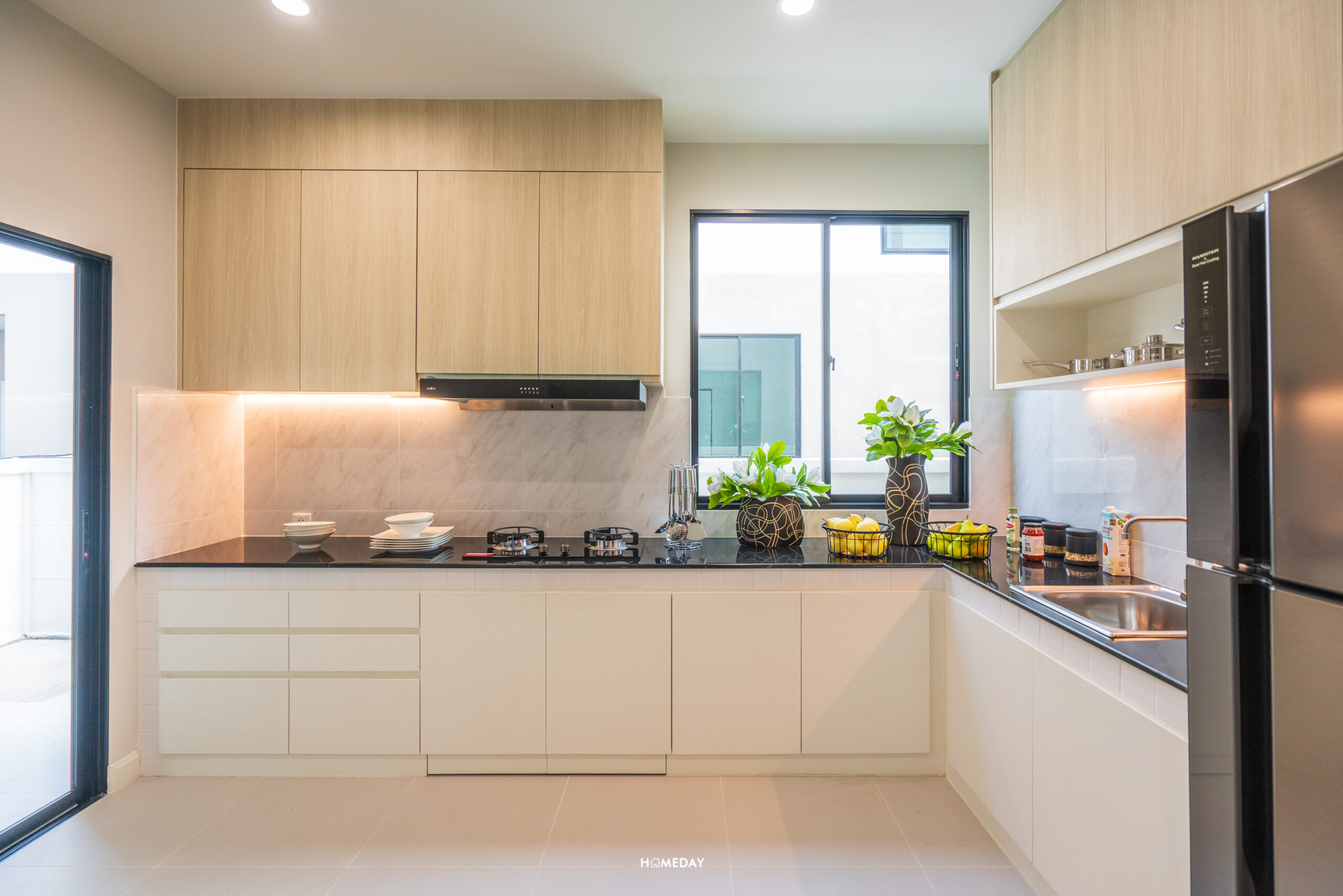 ติดกันจะเป็นส่วนของครัวปิดขนาดใหญ่ ภายในรองรับการบิลต์อินเคาน์เตอร์ครัวเข้ามุมทรงตัว L ได้เลยครับ ใส่ตู้เย็นขนาดใหญ่, เตา 4 หัว และซิงก์ล้างจานได้ โดยยังเหลือพื้นที่เตรียมอาหารให้ใช้งานได้แบบคล่องตัว แขวนตู้เก็บของเพิ่มเติมด้วยก็ยังได้ ส่วนลานซักล้างด้านนอก ก็สามารถเปิดเชื่อมจากห้องครัวได้เลยครับ