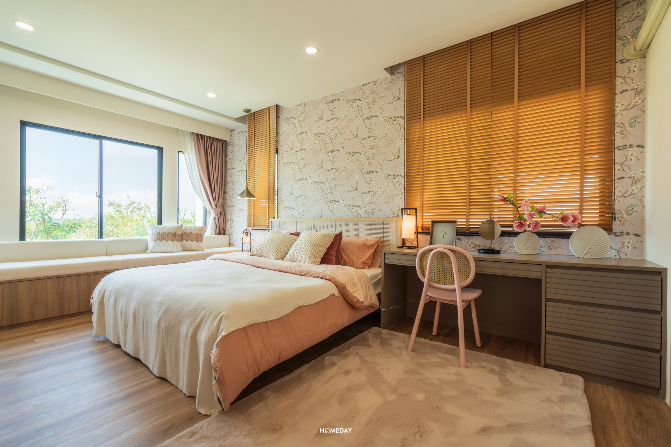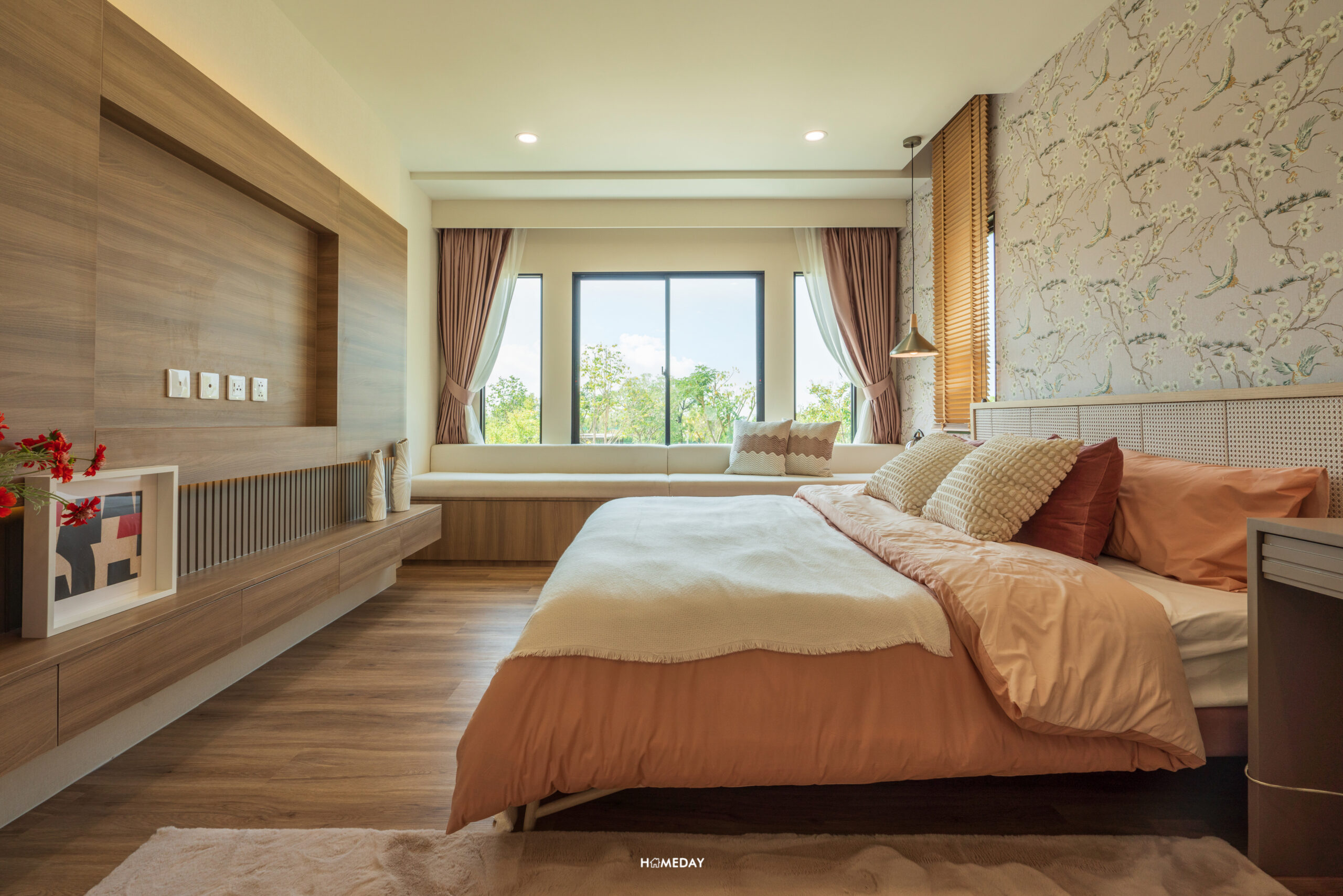 เตียงวางได้ทุกขนาดเลยครับ รองรับขนาด 6 ฟุตได้สบาย ๆ บ้านตัวอย่างโชว์ให้เห็นถึงพื้นที่รอบเตียงที่เราสามารถใส่ฟังก์ชันเพิ่มเติมเข้าไปได้หลากหลาย ทั้งชั้นวางทีวีบิลต์อินปลายเตียง, ม้านั่งตัวยาวข้างหน้าต่าง, โต๊ะหัวเตียง และโต๊ะนั่งทำงาน โดยยังเหลือพื้นที่รอบ ๆ ให้สามารถเดินเชื่อมต่อแต่ละพื้นที่ได้อย่างคล่องตัว สำหรับพื้นทั้งหมดของชั้นนี้ จะใช้เป็นพื้นไม้สำเร็จรูป SPC (Stone Plastic Composite) หนา 4 มิลลิเมตร ชั้น 2 ของทุกแบบบ้านก็จะได้มาตรฐานเดียวกันนี้เหมือนกันทั้งหมดครับ