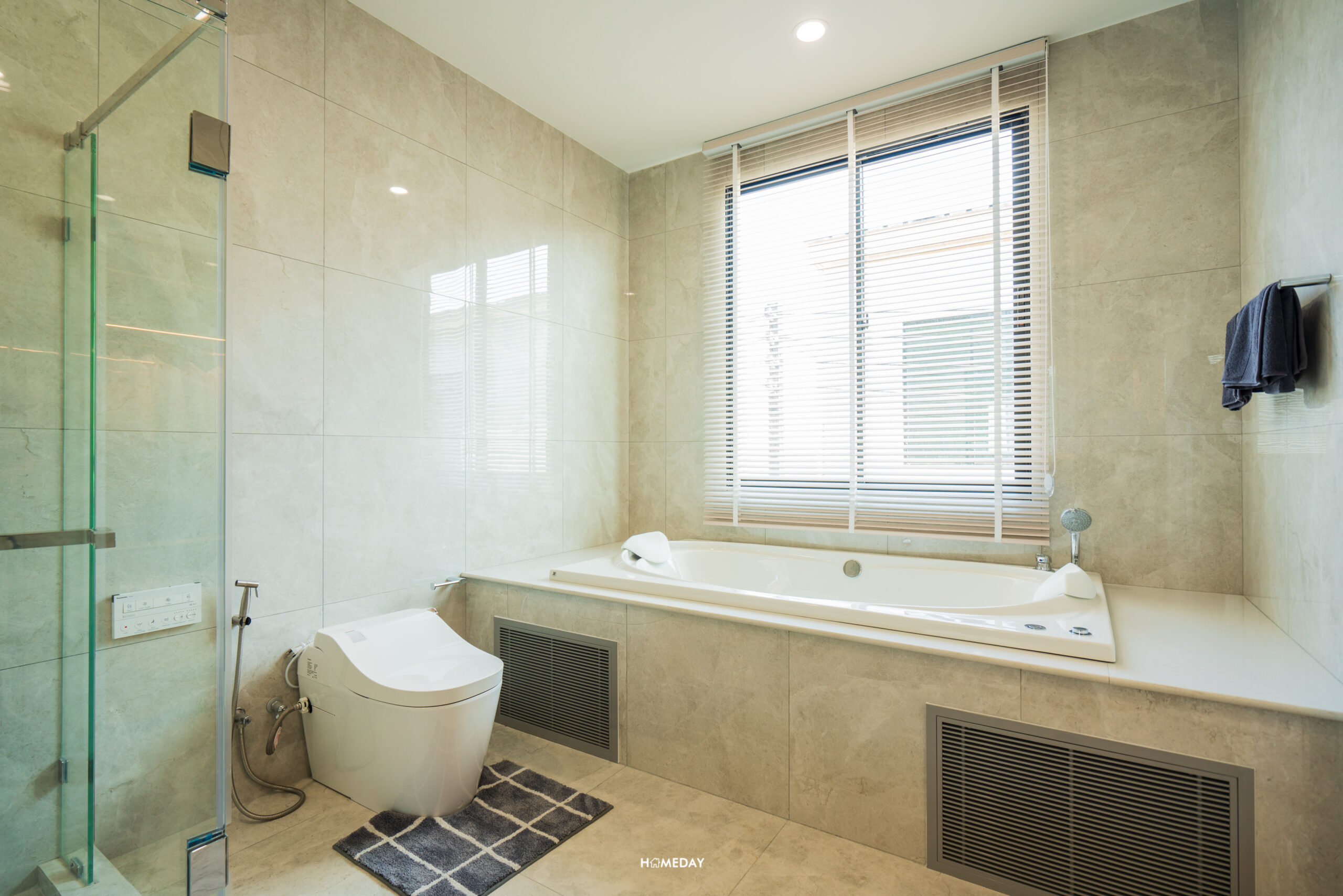 Master Bathroom ของแบบบ้านนี้ พิเศษกว่าทุกไทป์เลยครับ โดยตัวโถสุขภัณฑ์จะได้เป็นระบบไฟฟ้าจากแบรนด์ Panasonic ชำระล้างอัตโนมัติด้วยน้ำอุ่นในตัว และมีอ่างอาบน้ำจาก I-SPA มาให้ด้วยครับ ระบบน้ำวน พร้อมชุดก๊อก อยู่ติดริมหน้าต่าง นอนแช่น้ำพักผ่อนหลังเลิกงานคลายความเหนื่อยล้าได้แน่นอน