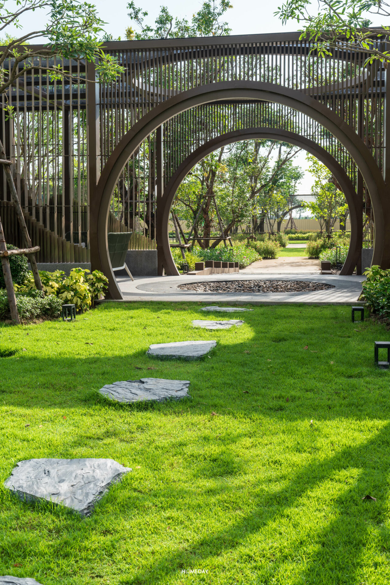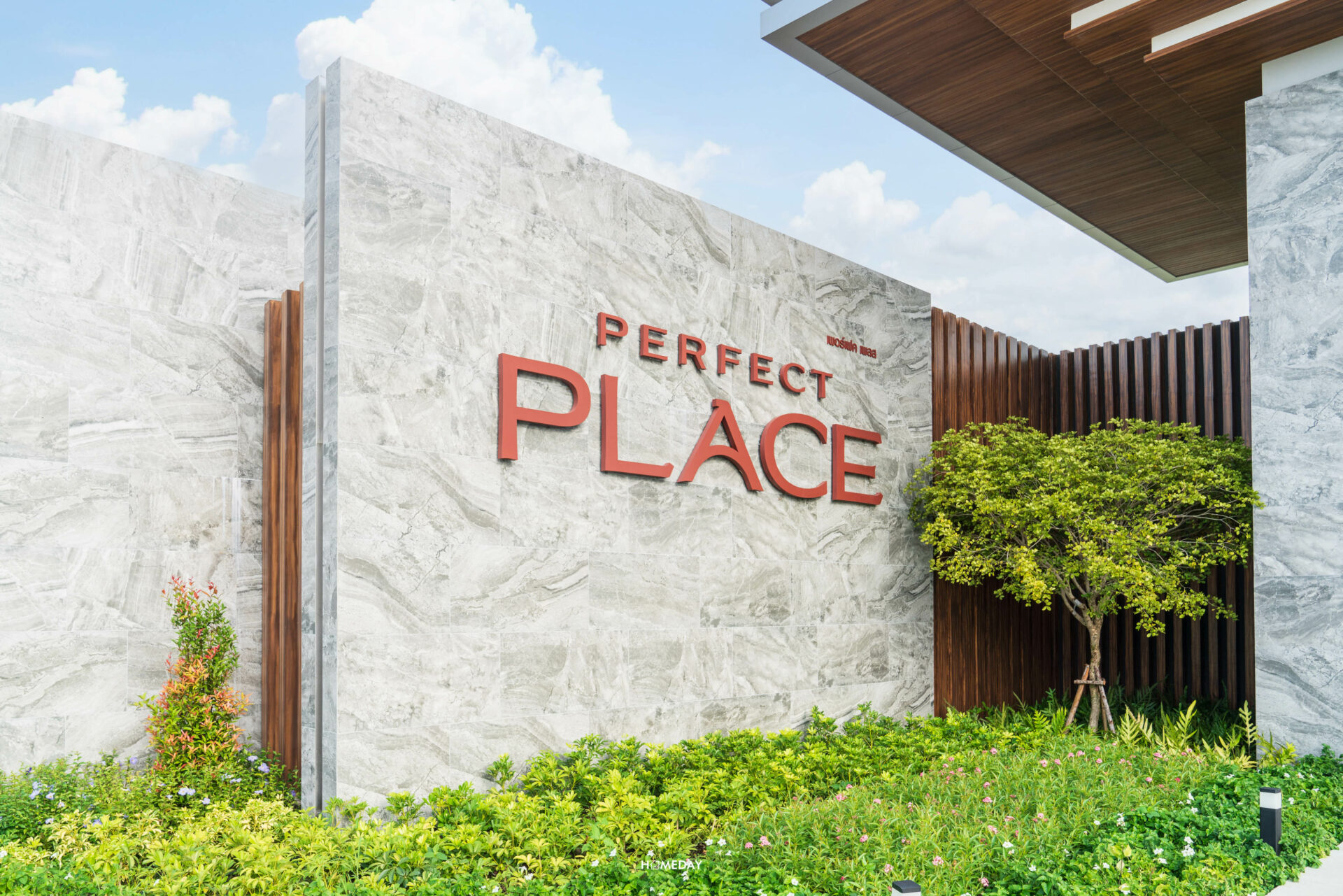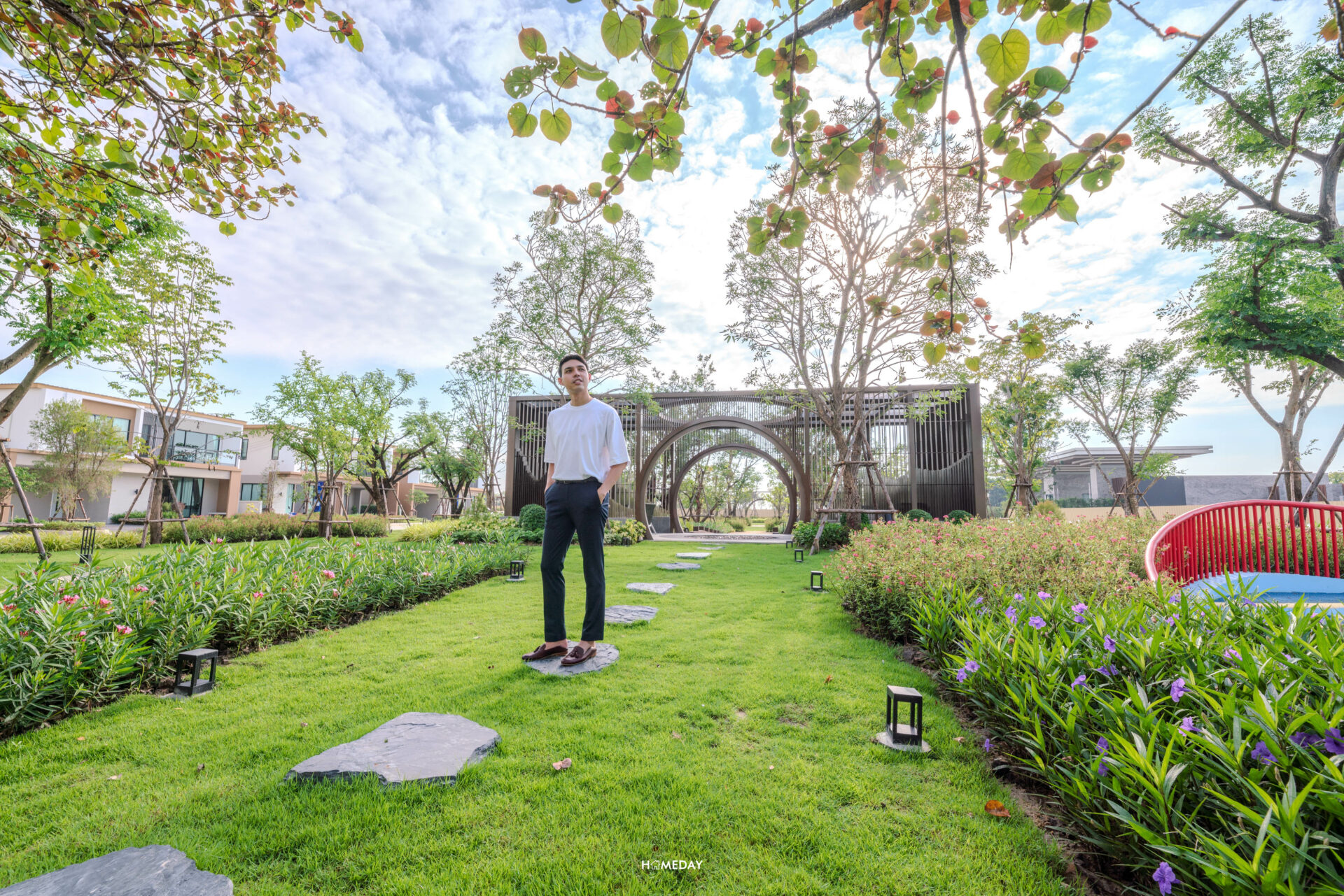 มาดูต่อกันที่ส่วนกลางภายในโครงการ Perfect Place กันบ้างครับ พื้นที่จะตั้งอยู่ติดกับ Gate ทางเข้าของทางโครงการ ขับรถเข้ามาสวนจะตั้งอยู่ทางด้านซ้ายมือของเราครับ ตัวสวนจัดตกแต่งประดับพันธุ์ไม้ออกมาได้อย่างสวยงาม ประกอบไปด้วย Walkway, Pavilion สําหรับการพักผ่อนท่ามกลางธรรมชาติ และสนามเด็กเล่นครับ