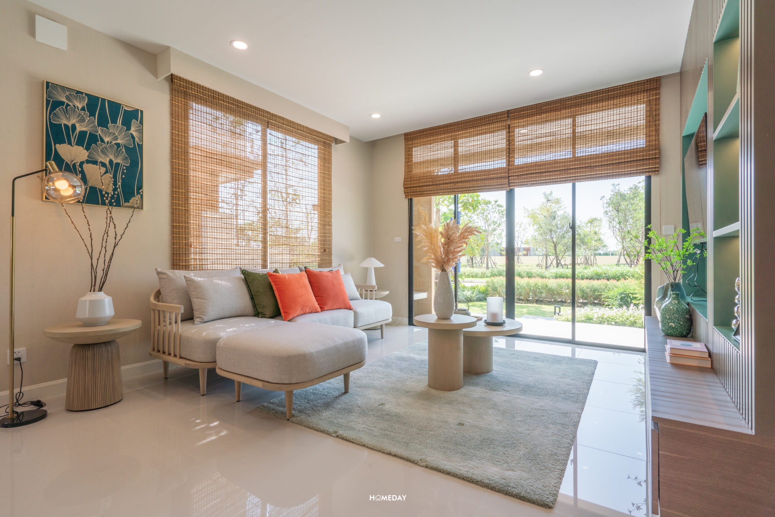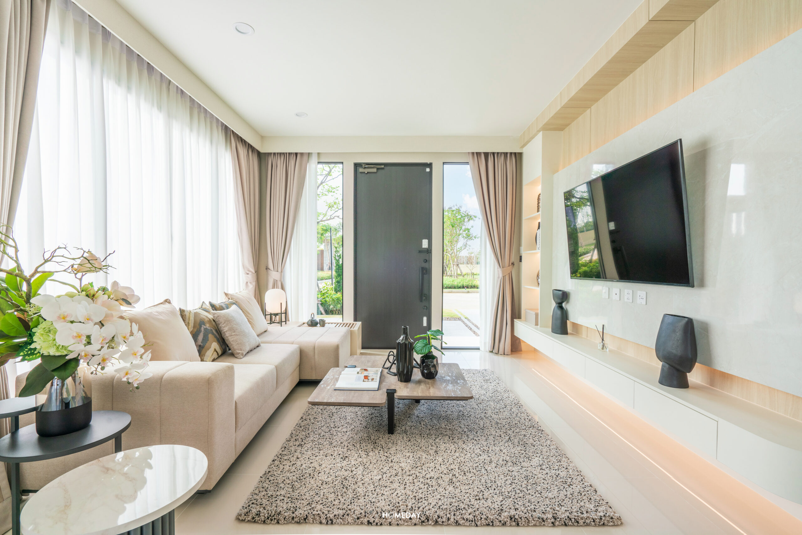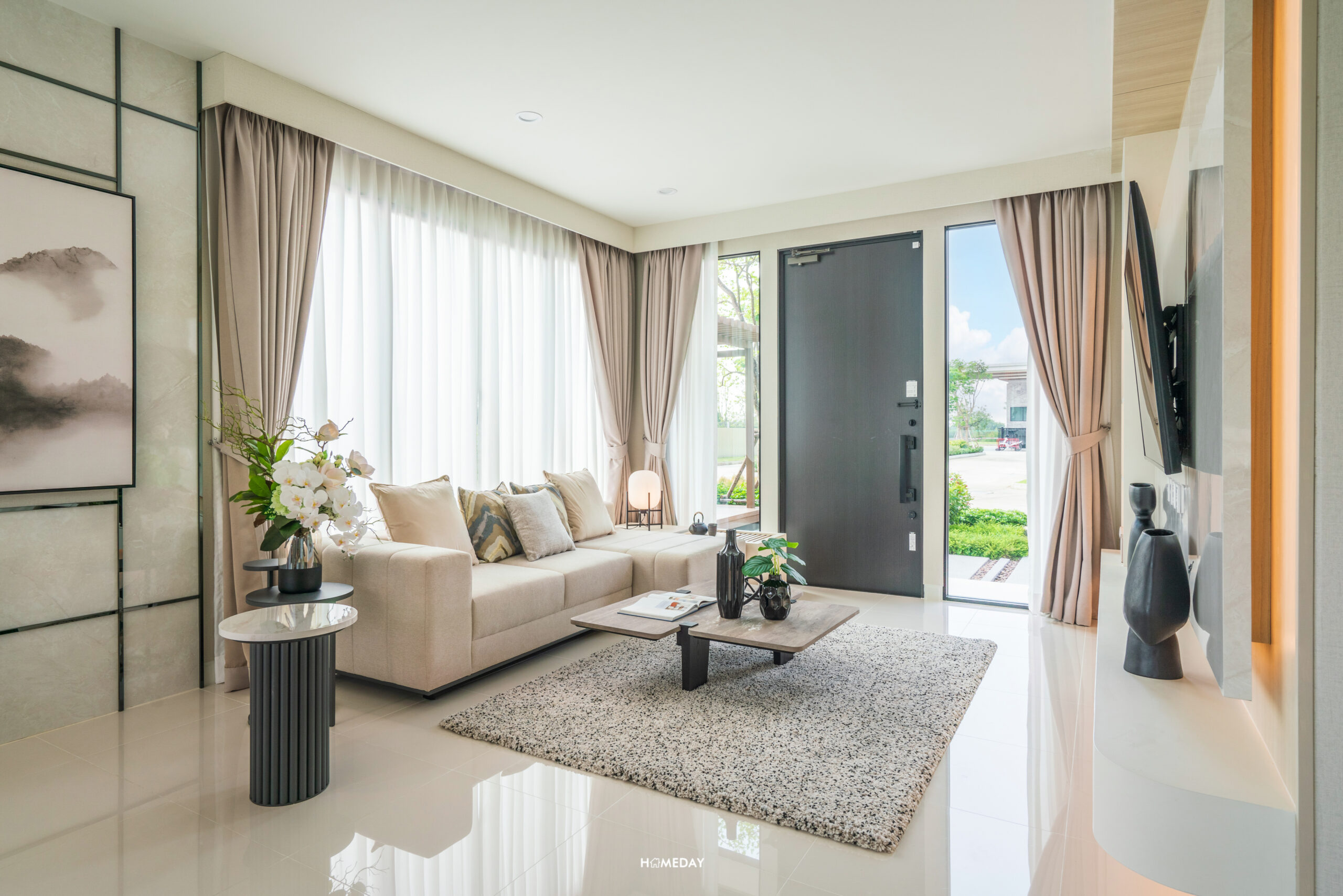 เปิดเข้ามาถึง ก็จะเจอกับมุม Living ของตัวบ้านก่อนเป็นลำดับแรก ขนาดพื้นที่ใหญ่จุใจ ใส่โซฟาเข้ามุมขนาด 4-5 ที่นั่งได้สบาย ๆ ครับ โต๊ะกลางเลือกวางได้ทุกขนาด เหลือพื้นที่ให้บิลต์อินชั้นวางทีวีขนาดใหญ่ได้ โดยไม่ต้องกังวลเรื่องทางเดินเข้า-ออก