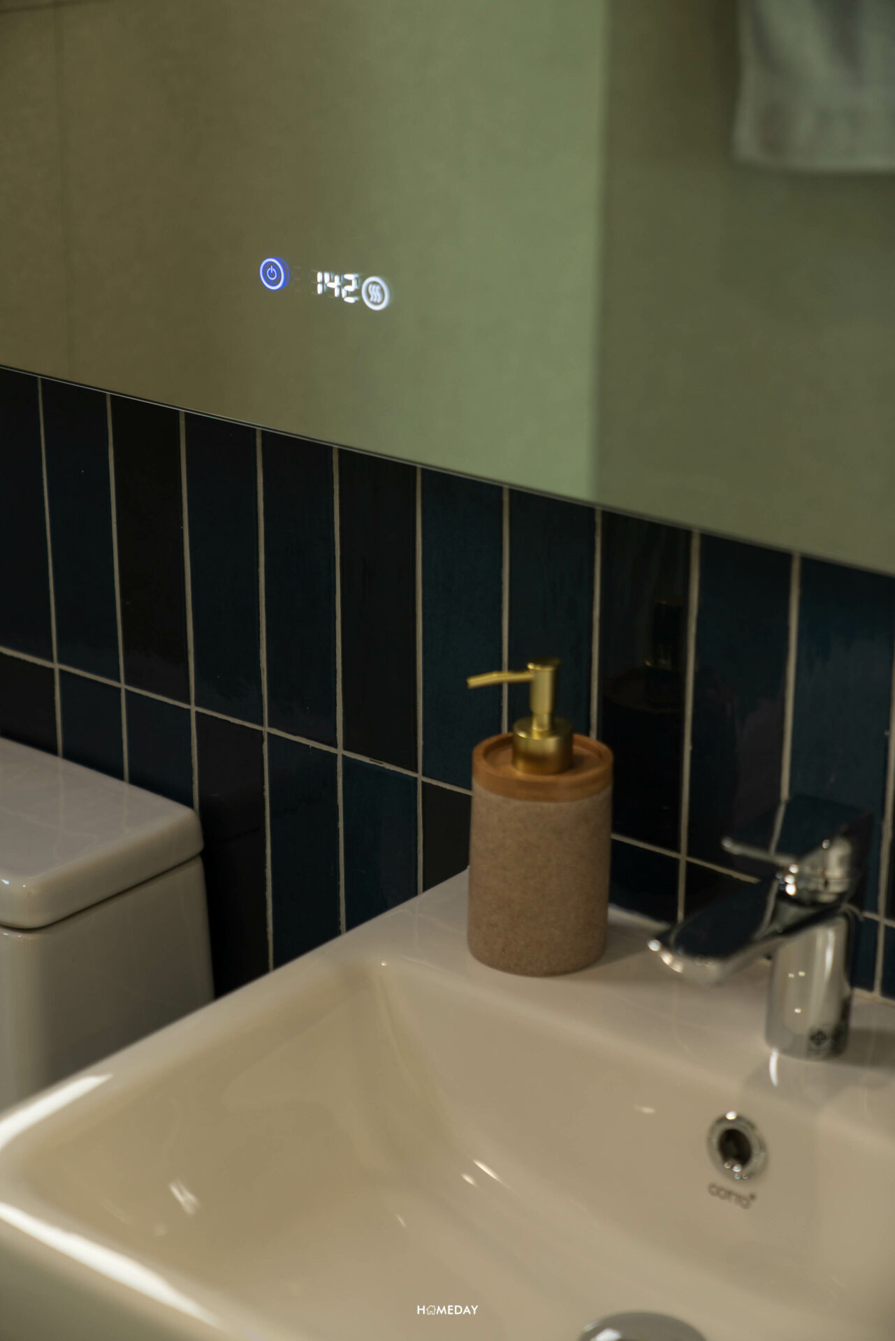 ตัวกระจกเงามีความพิเศษ มีไฟ LED ส่องสว่าง เลือกแสงได้ 3 สี มาพร้อมคุณสมบัติกันฝ้า และตั้งเวลาได้ด้วยครับ ใช้งานระบบสัมผัสได้เลย สำหรับโถสุขภัณ์ ได้เป็น COTTO ระบบ Touchless กดน้ำได้เพียงใช้มือผ่าน หรือสามารถกดมือได้ในกรณีที่แบตฯ หมด โซนเปียก Shower ให้ Hand Shower มาพร้อมบานกระทุ้งสำหรับระบายอากาศครับ