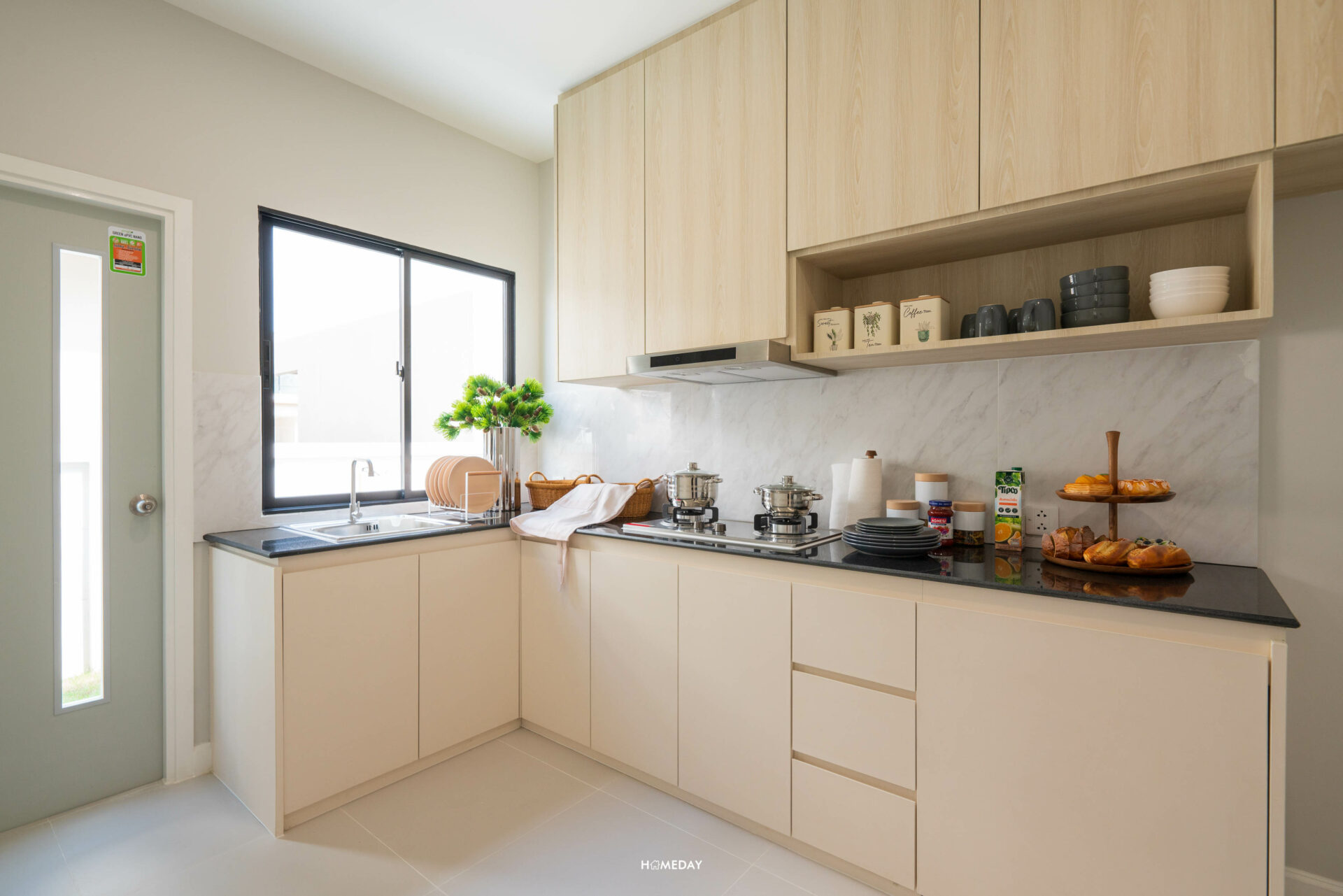พื้นที่ของห้องครัวถือว่าใหญ่เลยครับ ตอบโจทย์ครอบครัวที่ทำอาหารทานเองเป็นประจำได้อย่างแน่นอน ตัวห้องเป็นครัวปิด มาพร้อมบานหน้าต่างระบายอากาศและประตูเชื่อมออกไปยังลานซักล้าง สามารถบิลต์อินเคาน์เตอร์ครัวเข้ามุมรูปทรง L ได้เลยครับ ด้วยขนาดพื้นที่แล้ว ใส่บานตู้จัดเก็บได้เยอะ เพียงพอต่อความต้องการแน่นอนครับ