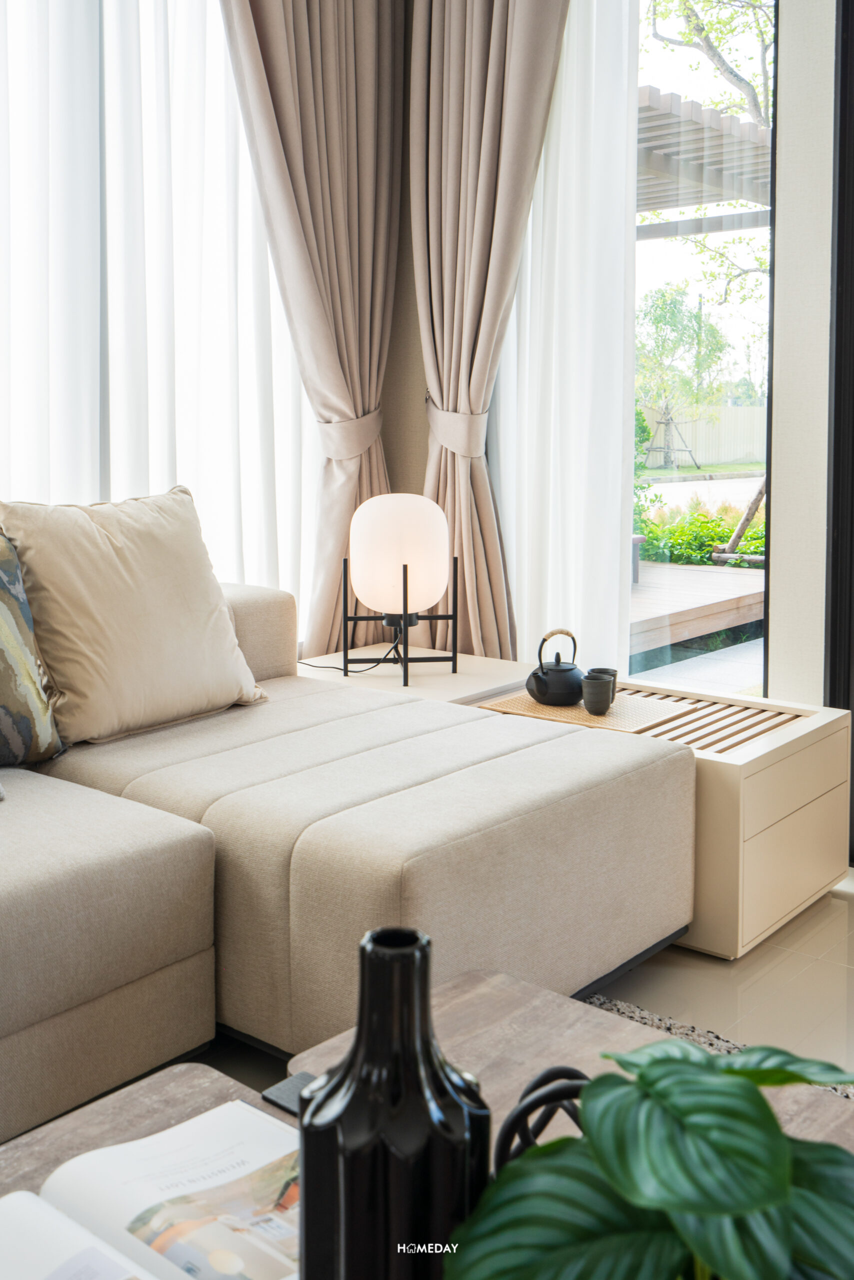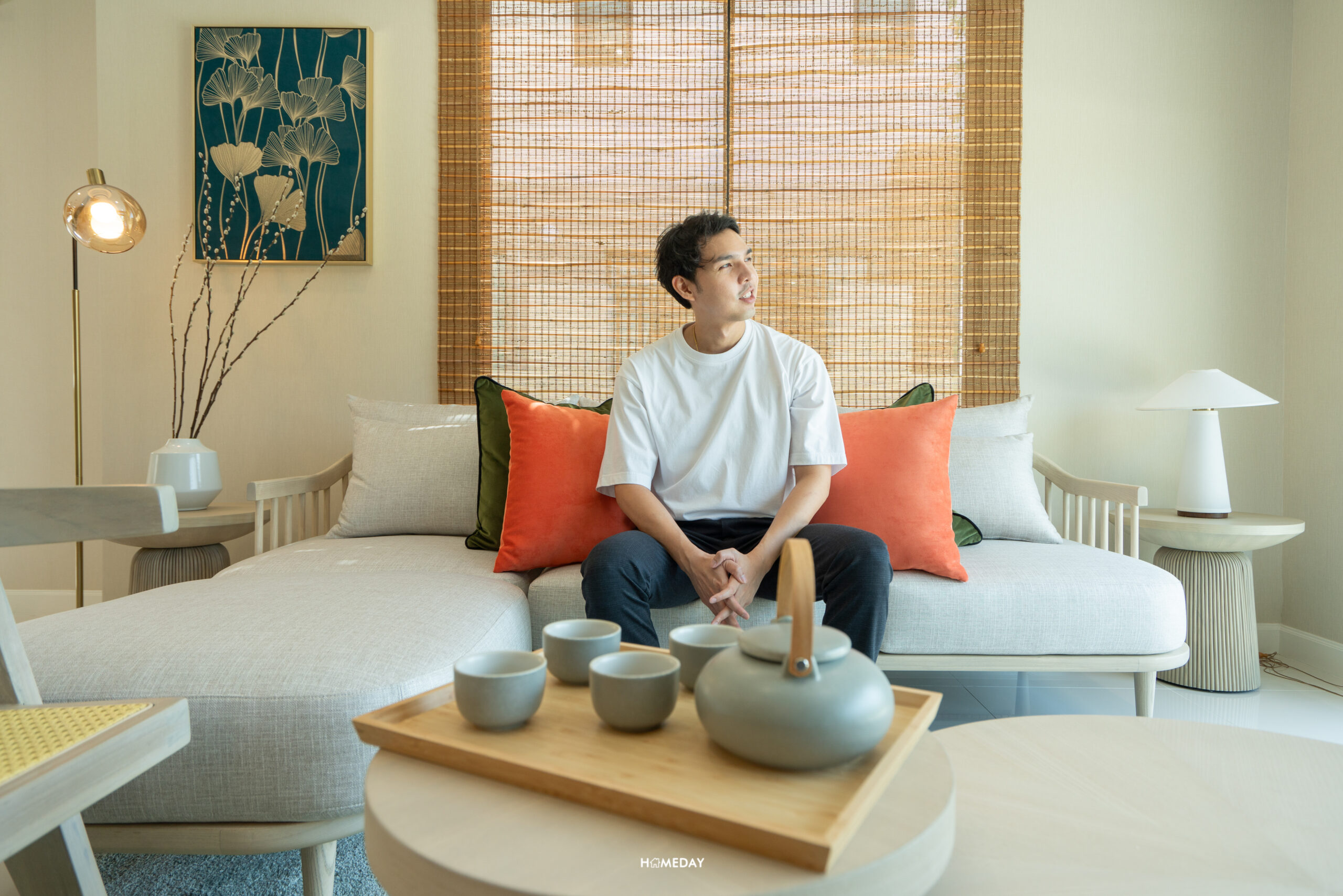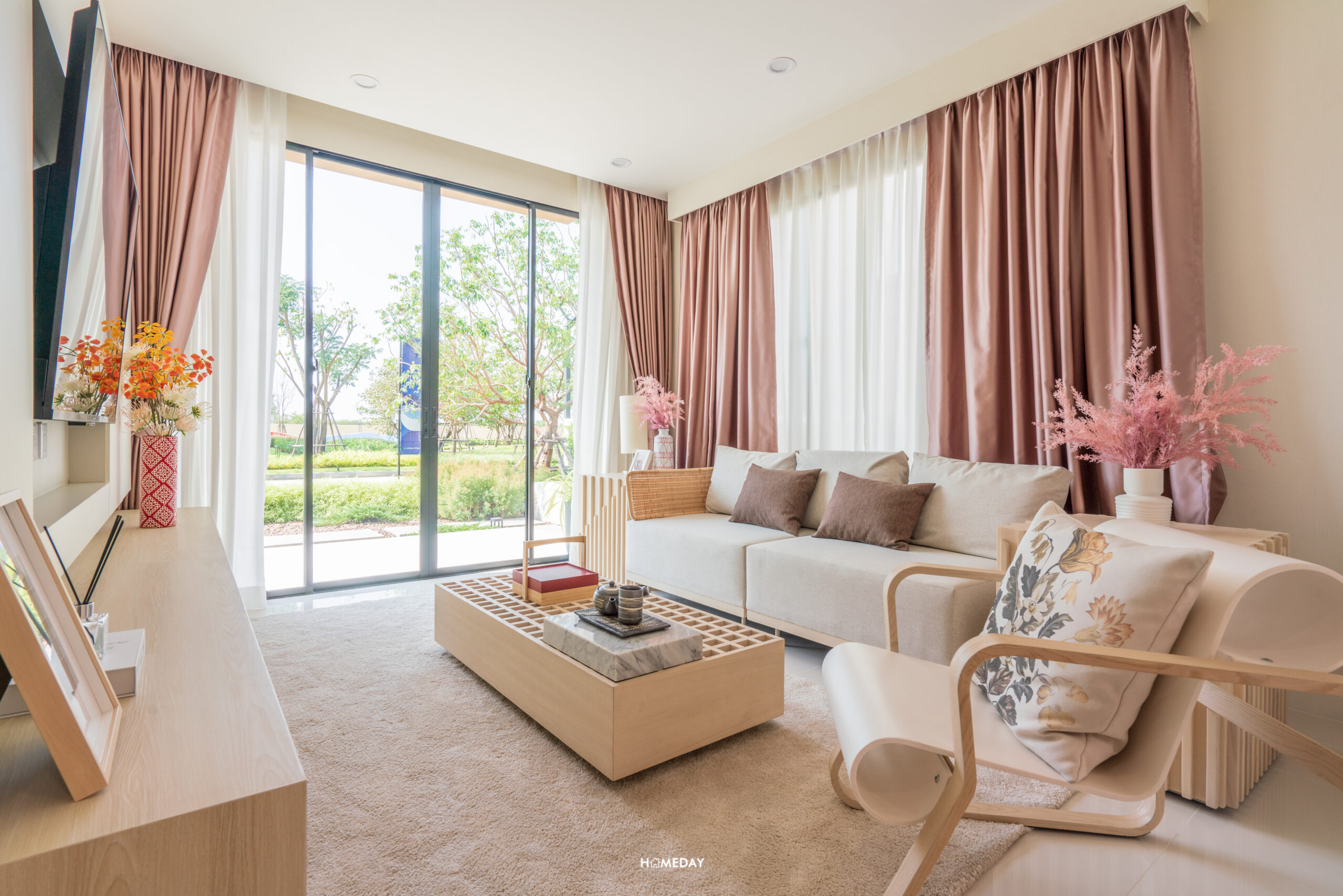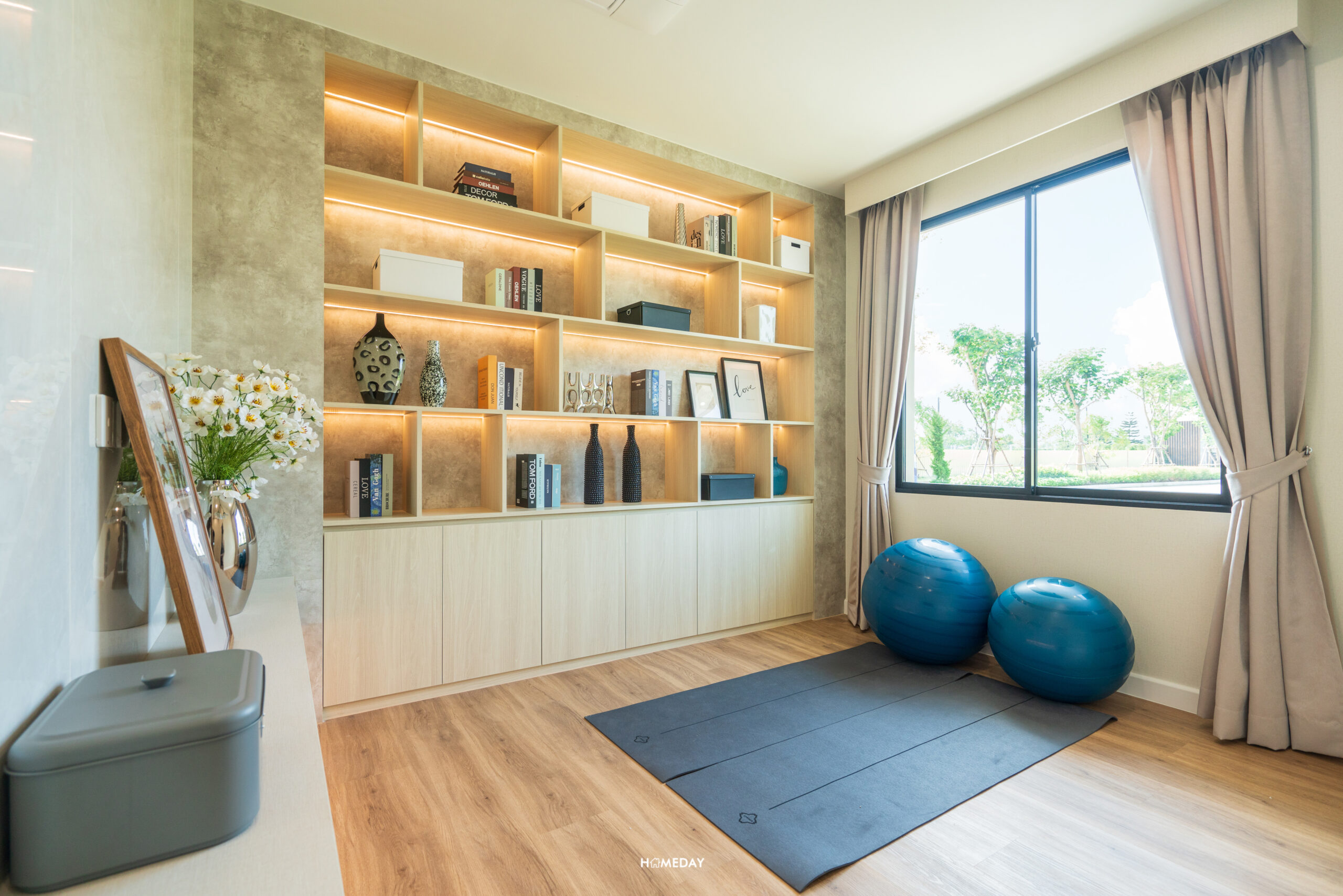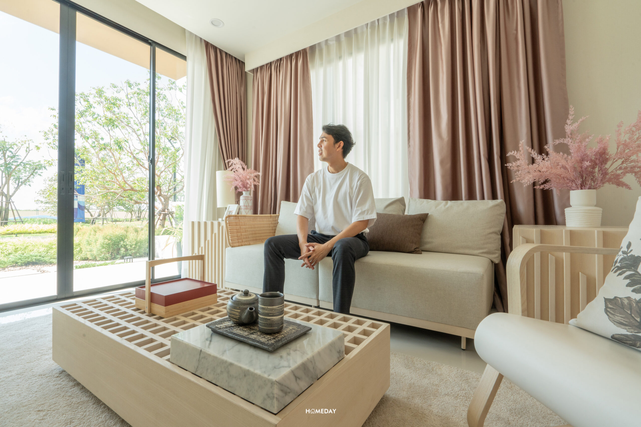 พื้นที่ปลายเตียงเหลือให้ใช้งานได้เยอะมาก ๆ ทำเป็นมุมนั่งเล่นได้เลยครับ บ้านตัวอย่างเลือกวางให้ดูเป็นม้านั่งปลายเตียงพร้อมด้วยโต๊ะกลางสไตล์ญี่ปุ่น ฝั่งผนังบิลต์อินชั้นทีวีขนาดใหญ่ ด้านในสุดติดระเบียงทำเป็นมุมโต๊ะทำงาน ยังเหลือพื้นที่ให้สามารถใช้งานเดินเข้า-ออกได้คล่องตัวครับ