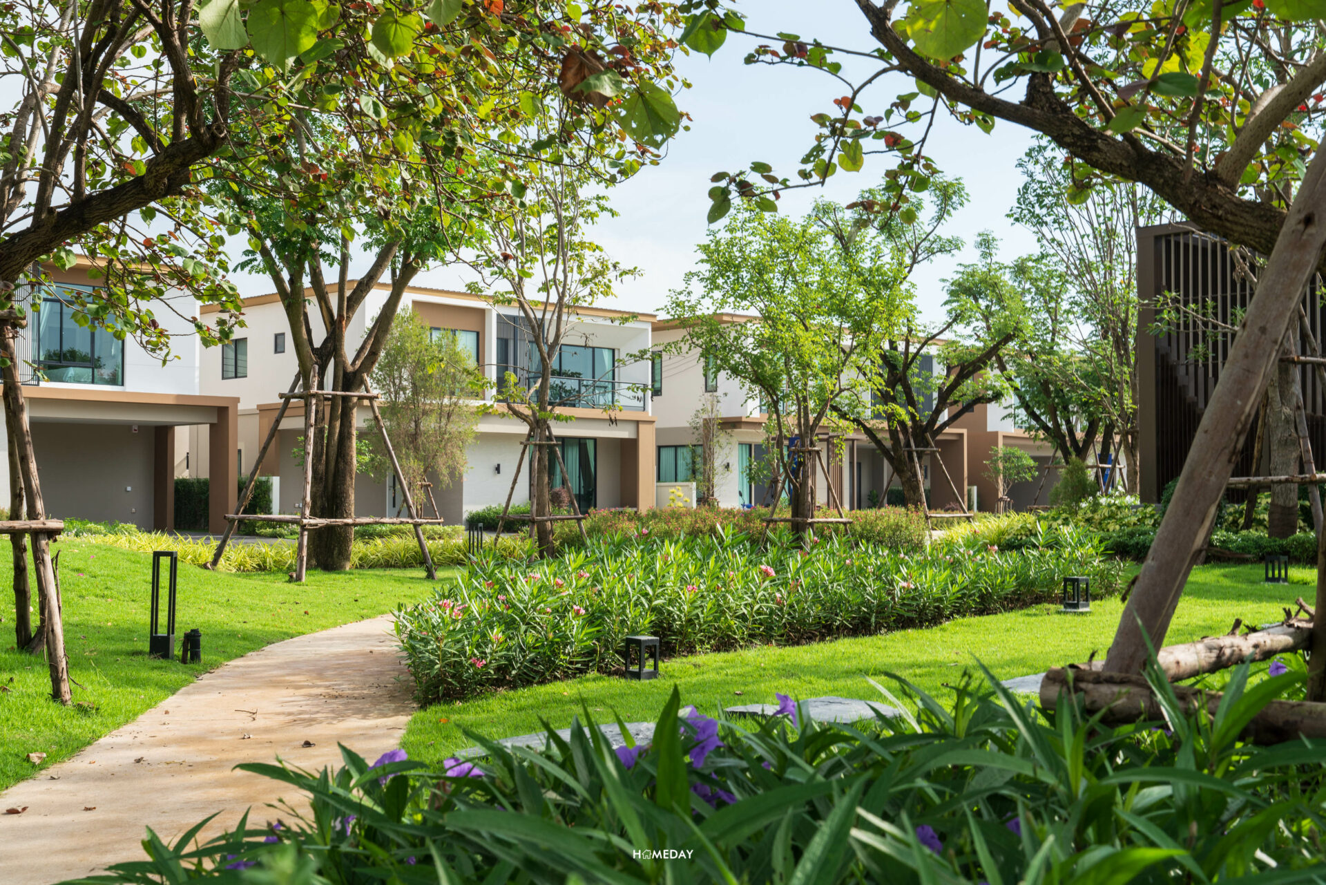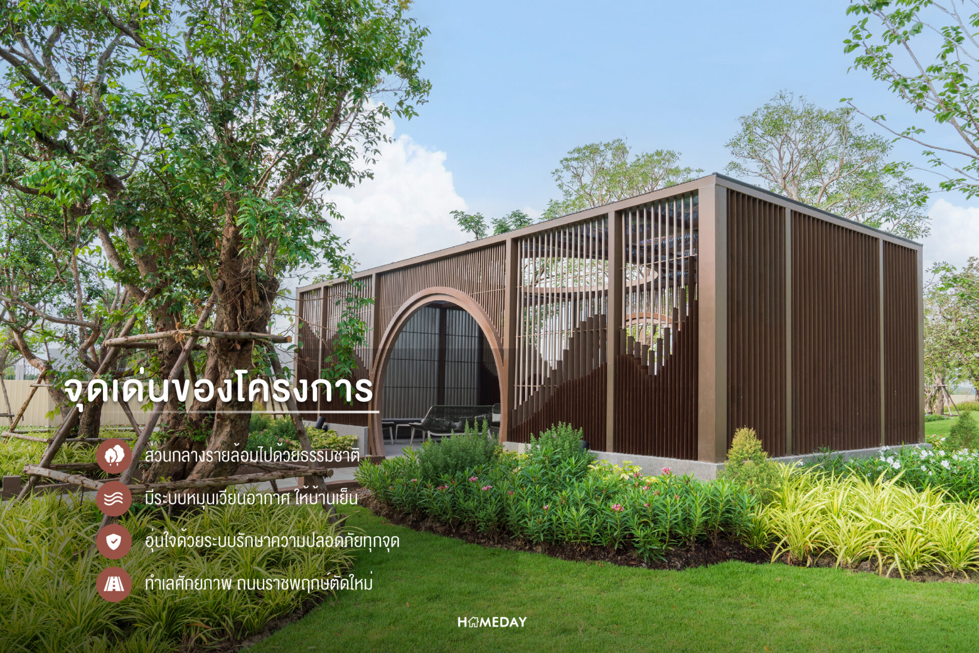 เติมเต็มทุกการอยู่อาศัยให้ใกล้ชิดธรรมชาติมากขึ้น กับสวนส่วนกลางขนาดใหญ่ที่ใส่ใจในการออกแบบโดยให้ความสาคัญกับการสร้างบรรยากาศอันร่มรื่น ความสวยงาม ของพรรณไม้ต่าง ๆ รวมถึงพื้นที่ทํากิจกรรมที่รองรับทุกการใช้งาน เพื่อตอบโจทย์การอยู่อาศัยและพักผ่อนของทุกครอบครัว