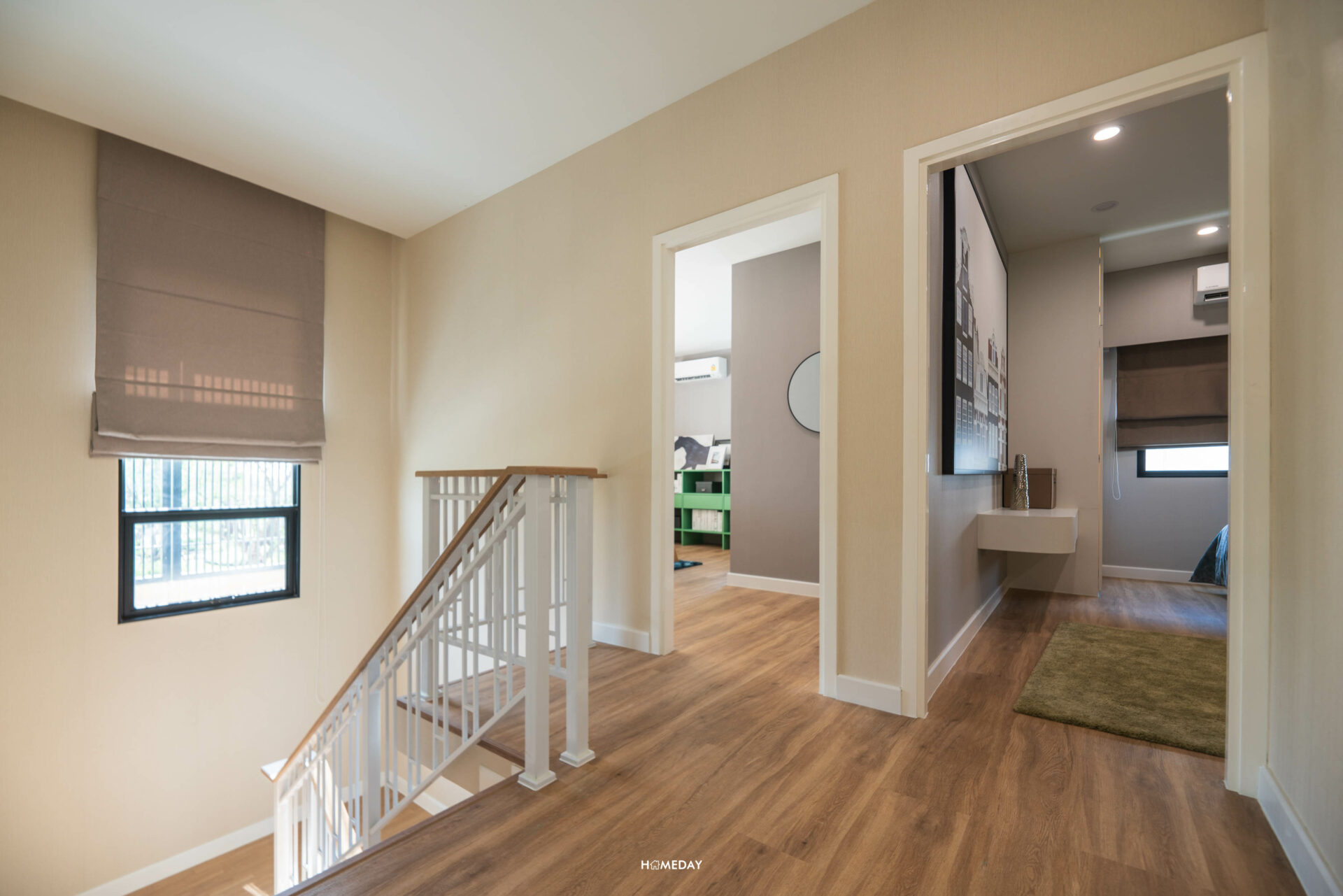 พาสำรวจห้องแรกของชั้น 2 กับ Bedroom 2 ห้องติดบันไดกันก่อนเลย ห้องนี้ภายในได้พื้นที่ใช้สอยขนาดใหญ่ รองรับเตียงขนาด 6 ฟุตและเฟอร์นิเจอร์พื้นฐานได้ครบครัน แต่บ้านตัวอย่างออกแบบมาให้ดูเป็นพื้นที่ห้องทำงานส่วนตัว เป็นไอเดียสำหรับคนที่ทำงานที่บ้านหรือทำธุรกิจส่วนตัวครับ