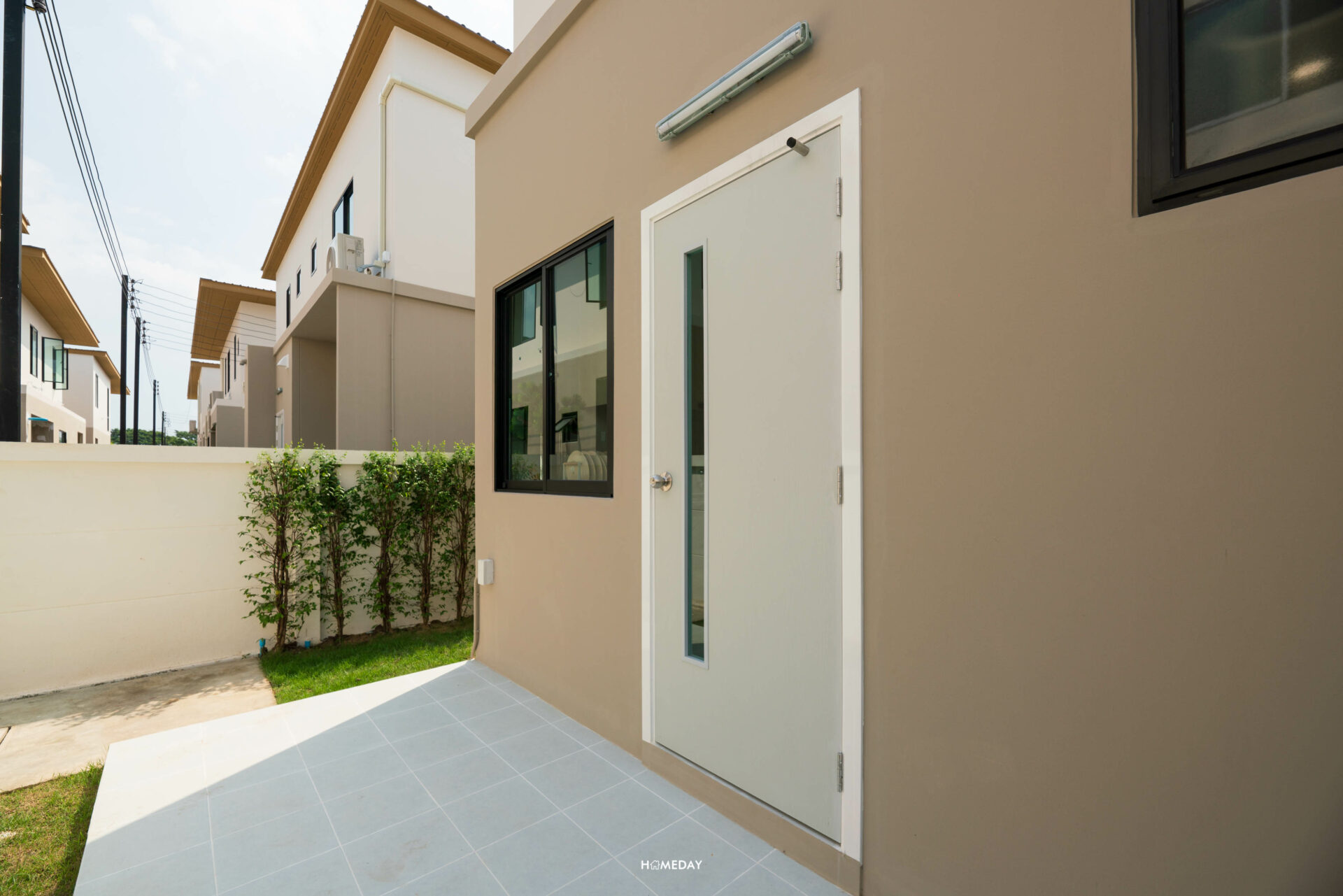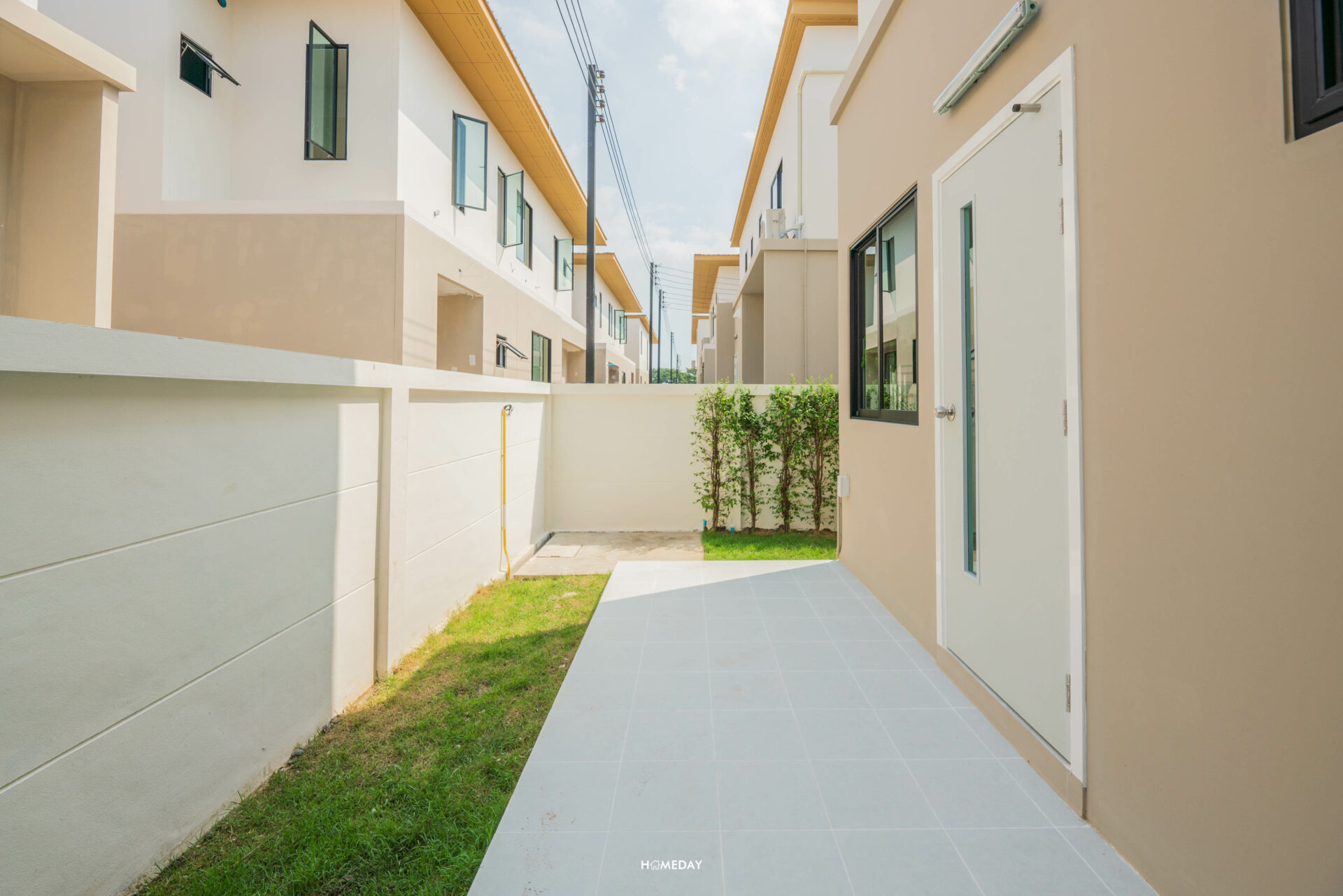 แวะออกมาดูที่ลานซักล้างด้านนอกกันสักเล็กน้อย พื้นที่ด้านนอกโซนนี้ ทางโครงการปูพื้นมาให้ด้วยครับ เป็นกระเบื้องเซรามิค ได้แบบนี้เหมือนกันทุกหลังเลยครับ มาตรฐานเดียวกันเลย