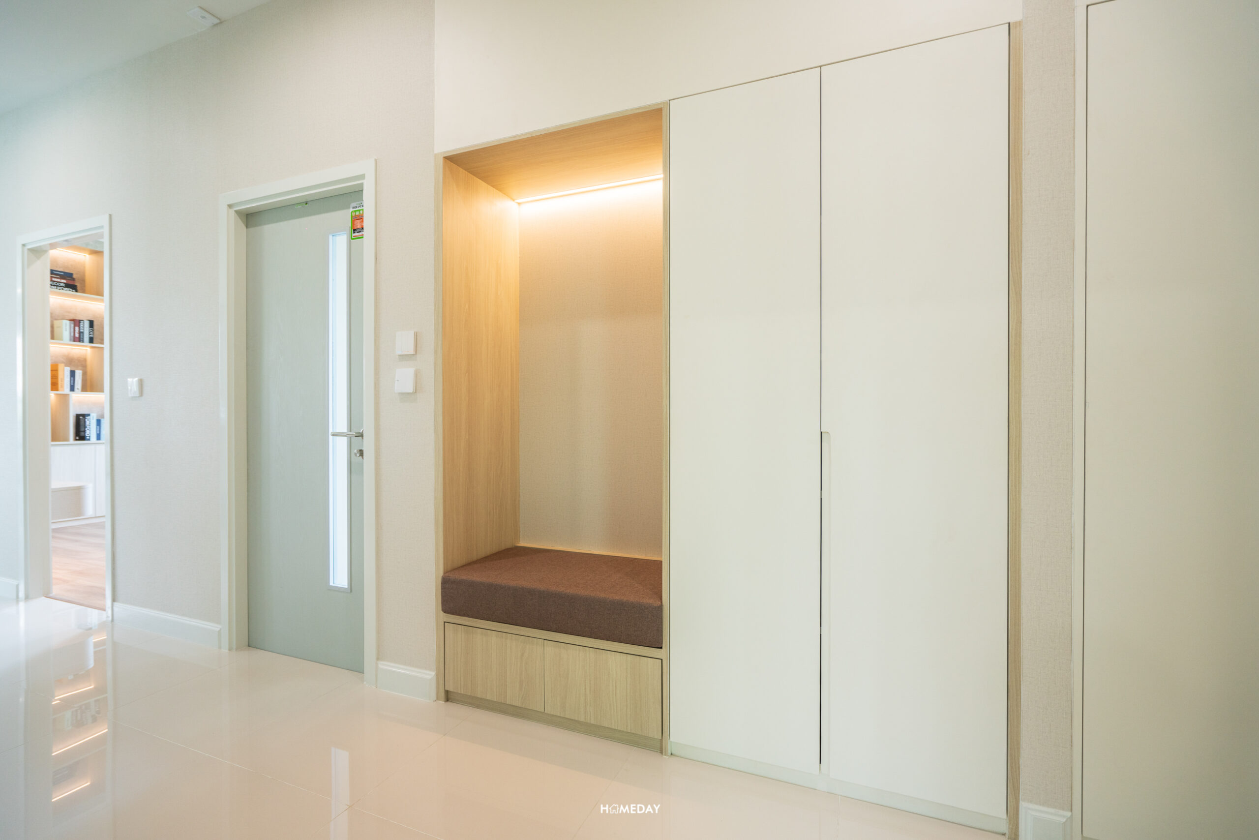 ติดกันกับ Bedroom 4 จะเป็นประตูทางเข้าเชื่อมลานจอดรถครับ ผนังฝั่งนี้มีพื้นที่เหลือให้สามารถบิลต์อินตู้เก็บของเพิ่มพื้นที่จัดเก็บได้ บ้านตัวอย่างเลยออกแบบให้ดูเป็นตู้ใส่รองเท้าพร้อมม้านั่งครับ เป็นการใช้พื้นที่ให้เกิดประโยชน์สูงสุดได้ลงตัวมาก ๆ