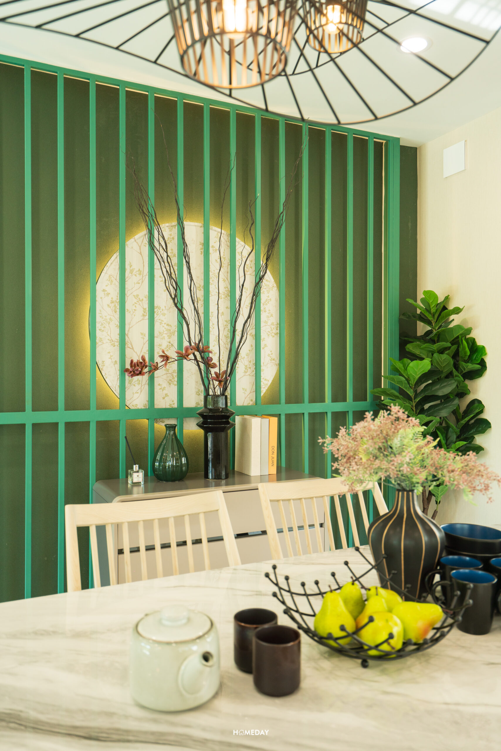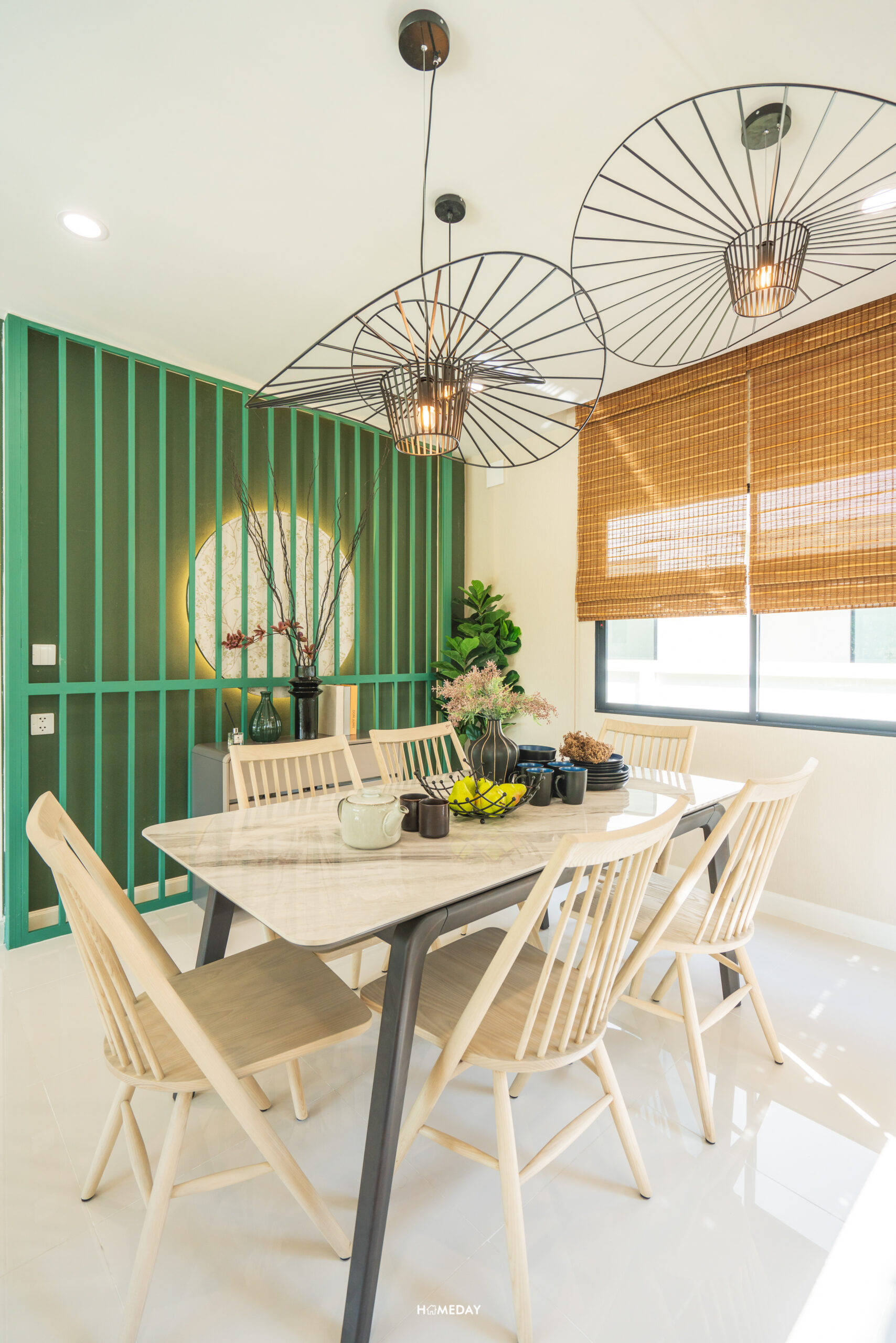 บ้านตัวอย่างเลือกออกแบบเป็นพื้นที่นั่งรับประทานอาหารและทำเป็น Pantry ไปในตัว โดยเลือกวางโต๊ะตัวยาวพร้อมด้วยเก้าอี้นั่งรับประทานอาหาร 6 ที่นั่ง ส่วน Pantry ออกแบบให้มีทั้งเคาน์เตอร์และไอส์แลนด์ครัว ทำเป็นบาร์เครื่องดื่ม เป็นมุมทำอาหารเช้าง่าย ๆ หรือจะใช้เป็นพื้นที่อบขนมก็เหมาะลงตัวครับ