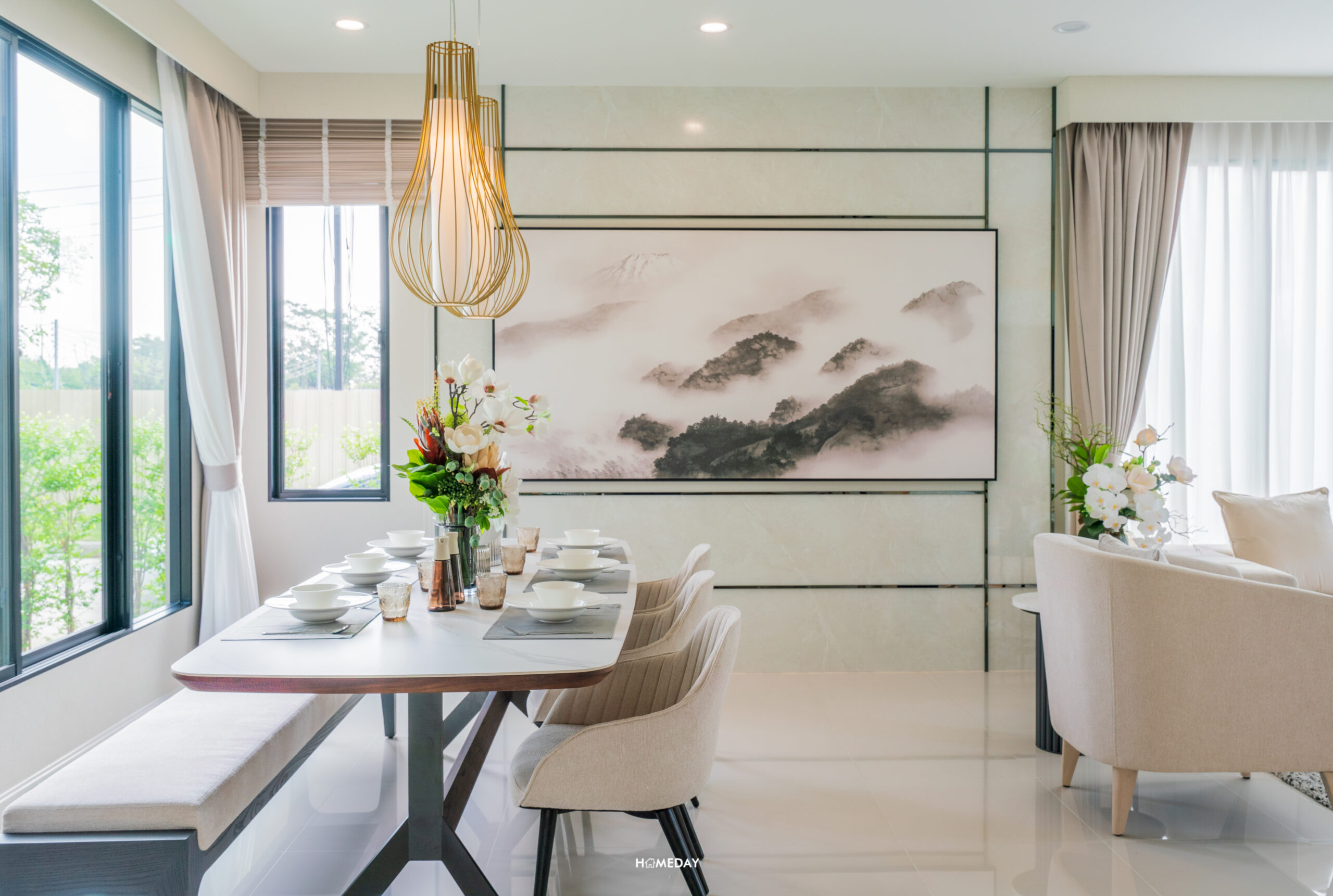 ส่วนของพื้นที่ Dining ก็อยู่เชื่อมต่อกับ Living เลยครับ ขนาดถือว่าใหญ่เลยทีเดียว สามารถวางโต๊ะตัวยาวพร้อมด้วยเก้าอี้นั่งรับประทานอาหารสำหรับ 6 ที่นั่งได้เลย จากบ้านตัวอย่างจะเห็นได้เลยว่าพื้นที่รอบโต๊ะยังเหลือให้ใช้งานได้อีกพอสมควร จะวางชั้นวางของ ตู้โชว์ หรือทำเป็น Pantry ก็ได้เหมือนกันครับ