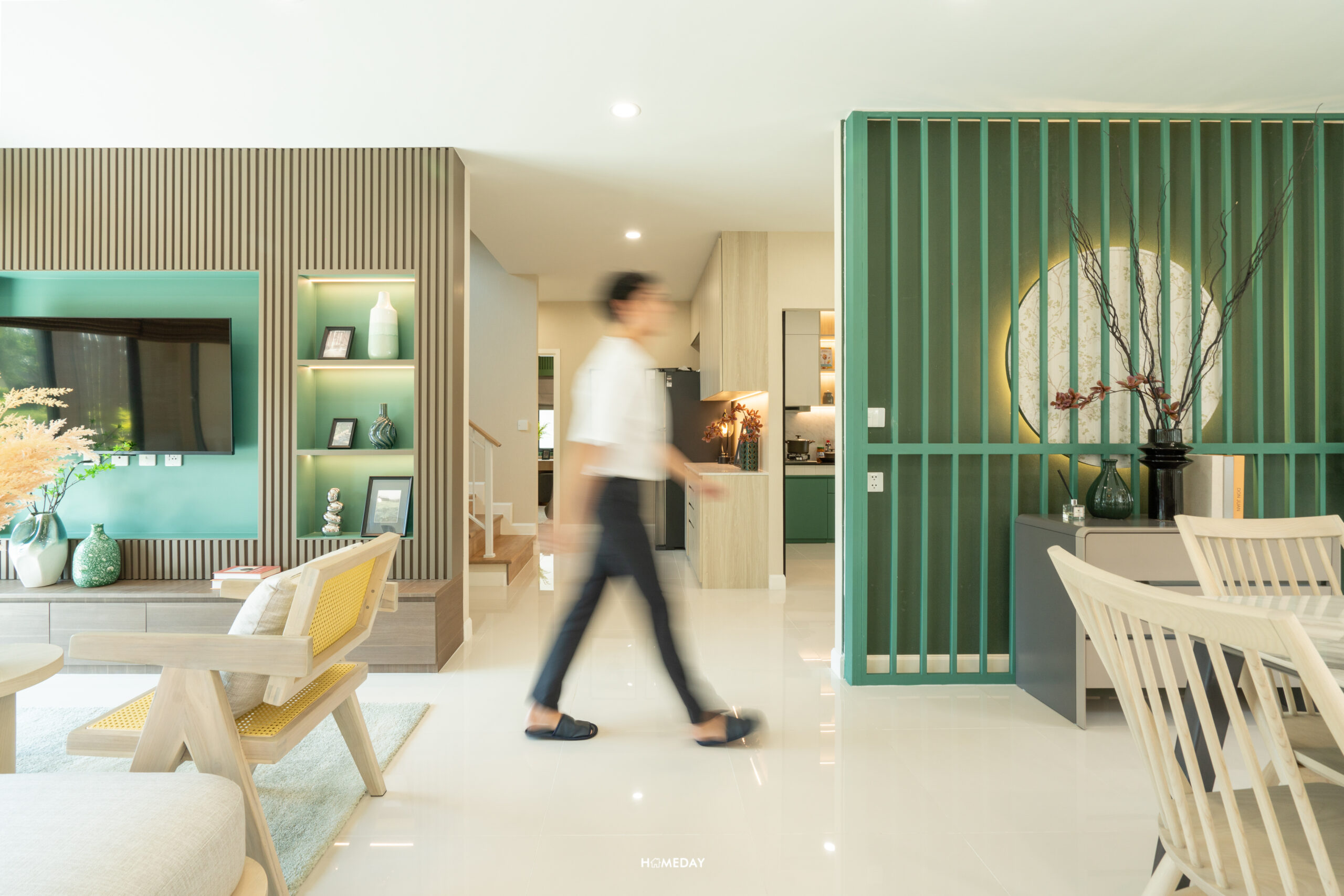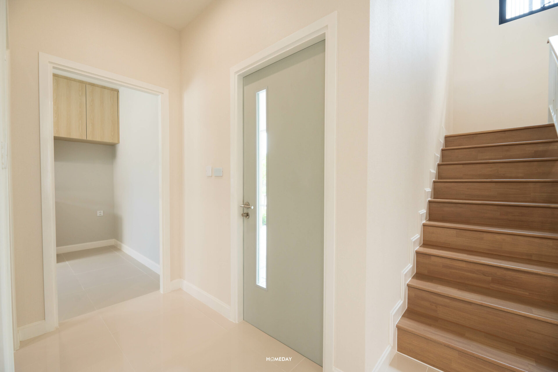 ซ้ายมือจากทางเข้าหลัก พื้นที่ระหว่าง Living และ Dining จะเป็นโถงทางเดินที่เชื่อมไปยังห้องน้ำ, ห้องครัว, ลานซักล้าง, ห้องเก็บของใต้บันได, บันได ประตูเชื่อมลานจอดรถ และห้องนอนชั้นล่าง ซึ่งพื้นที่ด้านหน้าบันไดตรงนี้ มีเหลือให้ใช้งานได้ค่อนข้างเยอะเลยครับ สามารถบิลต์อินตู้จัดเก็บของขนาดใหญ่เพิ่มพื้นที่จัดเก็บได้เลย