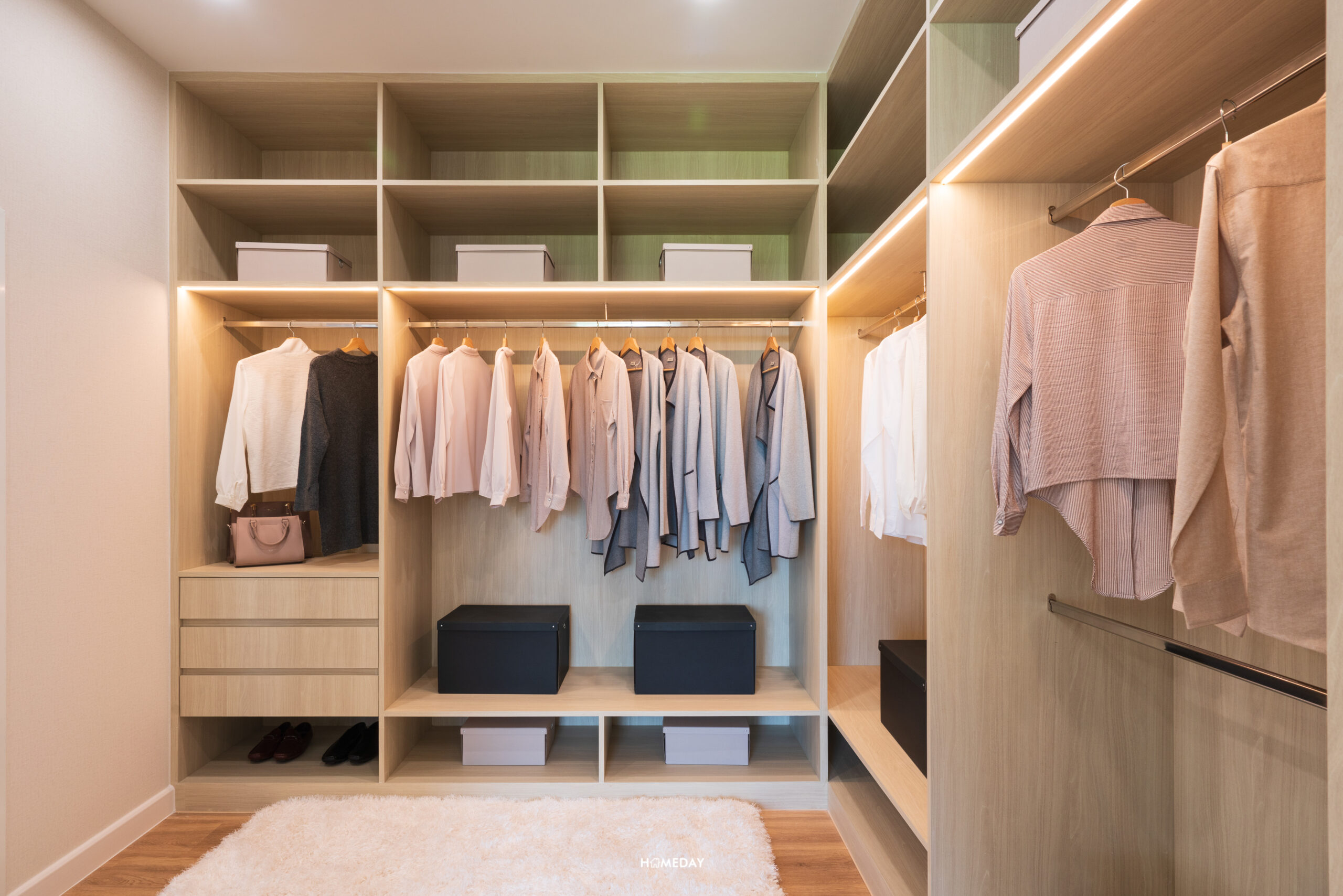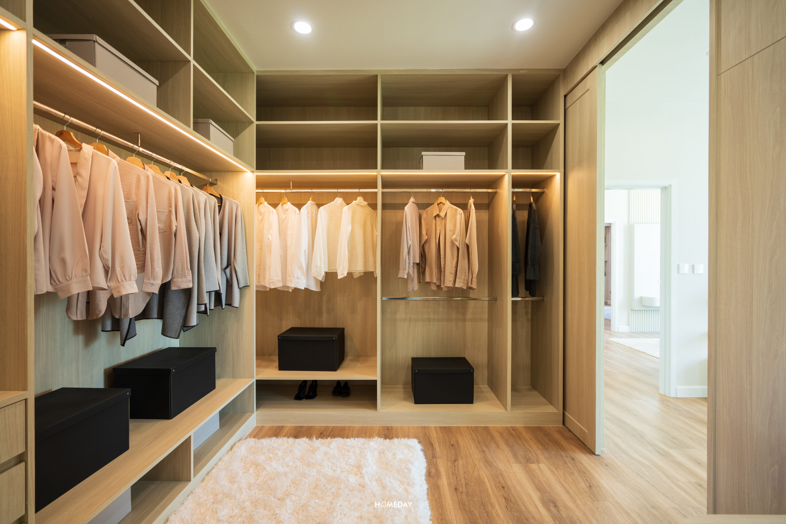 ฝั่งขวาจากทางเข้า เป็นโซนสำหรับแต่งตัวครับ ด้านในได้ Walk-in Closet ขนาดใหญ่ อยู่เชื่อมกับห้องน้ำอย่างเป็นสัดส่วนและเป็นส่วนตัว สามารถบิลต์อินตู้ขนาดใหญ่สำหรับแบ่งจัดเก็บ 2 ท่านและโต๊ะเครื่องแป้งได้ภายในพื้นที่เดียว
