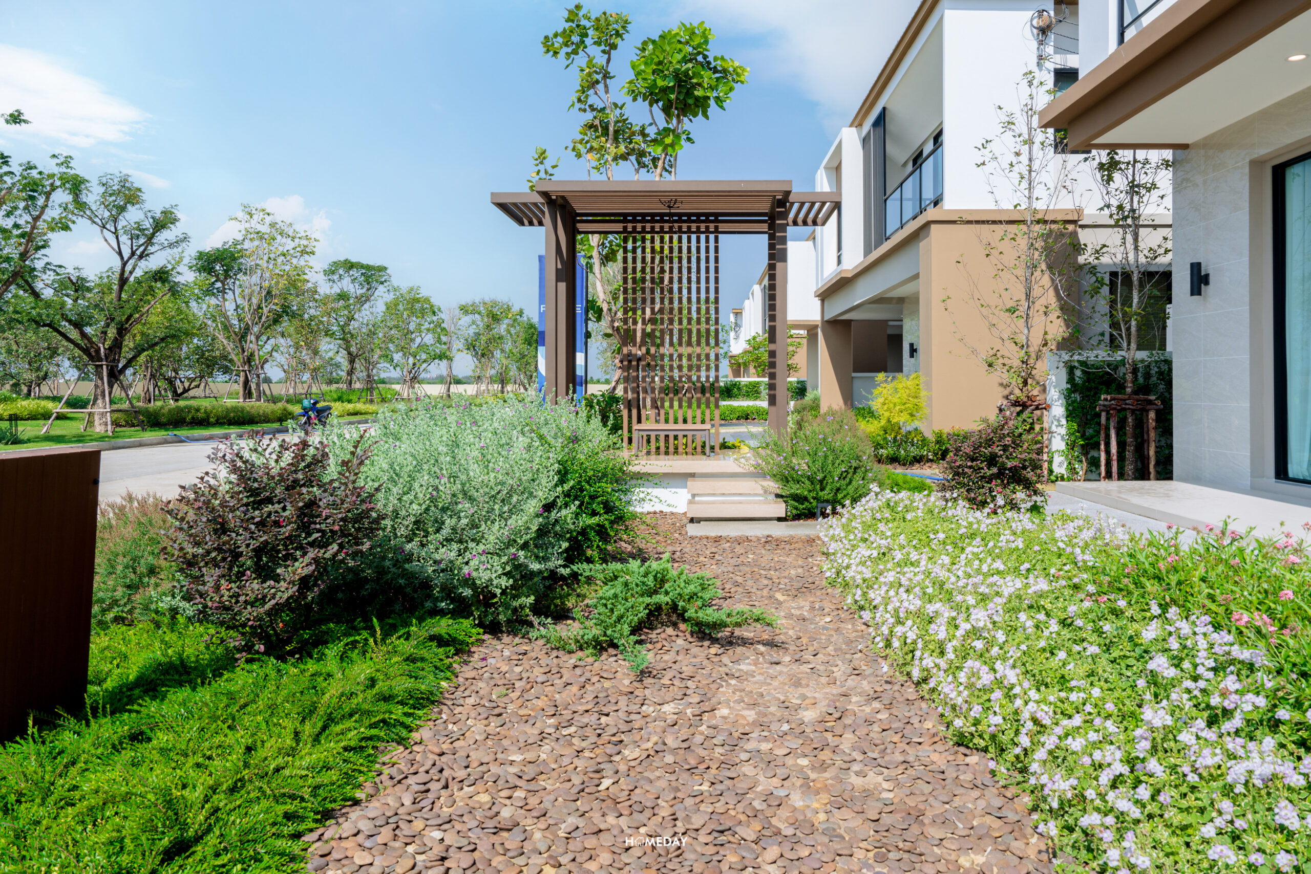 พื้นที่ทั้งหน้าบ้านและข้างตัวบ้าน สามารถออกแบบตกแต่ง จัดสวนส่วนตัวได้ทั้ง 2 จุด ให้มีมุมชิล ๆ ไว้นั่งเล่นได้ หรือจะใช้งานเป็นมุมทานข้าวนอกบ้านก็ดีไปอีกแบบ