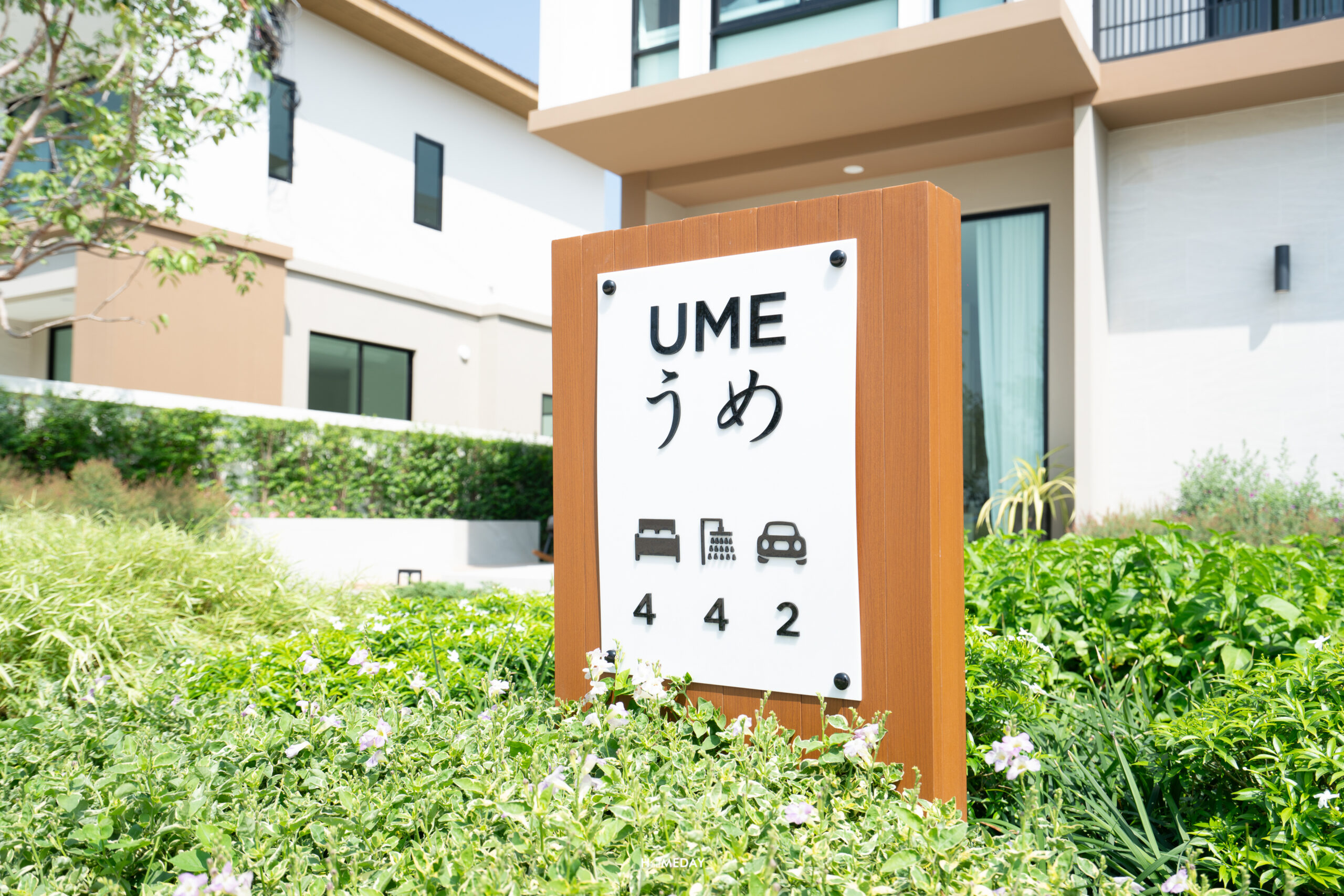 เริ่มต้น พาทุกท่านมาดูกันที่แบบบ้านขนาดเริ่มต้น UME กันก่อนเลยครับ หลังนี้พื้นที่ใช้สอยทั้งหมด 185 ตารางเมตร มาพร้อมฟังก์ชัน 4 ห้องนอน 4 ห้องน้ำ 2 ที่จอดรถ เป็นบ้านขนาดเริ่มต้นที่ให้จำนวนห้องนอนมาเยอะมากครับ ดีไซน์บ้านทั้งหมดของโครงการออกแบบมาในสไตล์ Modern Minimal Japanese ที่เรียบง่ายแต่ให้ความรู้สึกอบอุ่น
