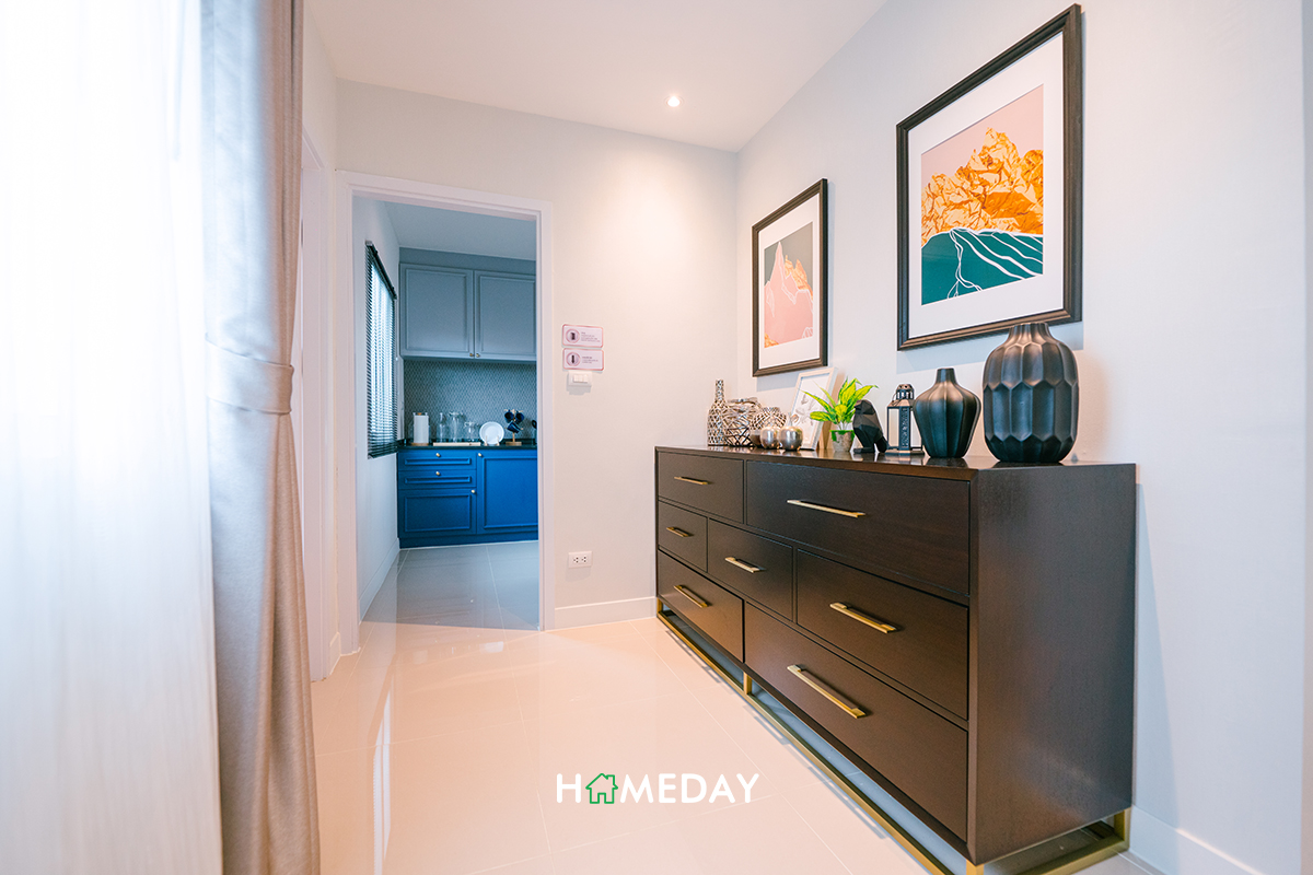 โถงทางเดินเล็ก ๆ ก่อนถึงครัว ก็มีเนื้อที่เหลือนะคะ สามารถบิลต์ชั้นวางของหรือตู้ลิ้นชักแบบในบ้านตัวอย่างได้เลย เพิ่มพื้นที่เก็บของให้บ้านได้อีกเยอะเลยค่ะ