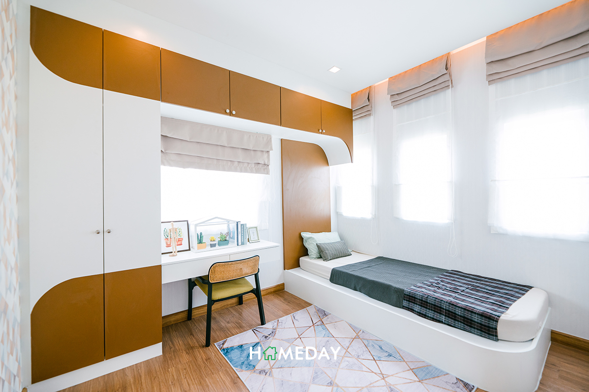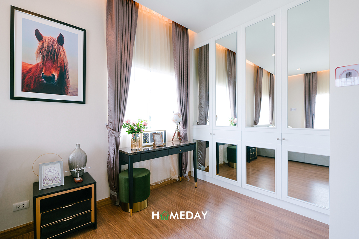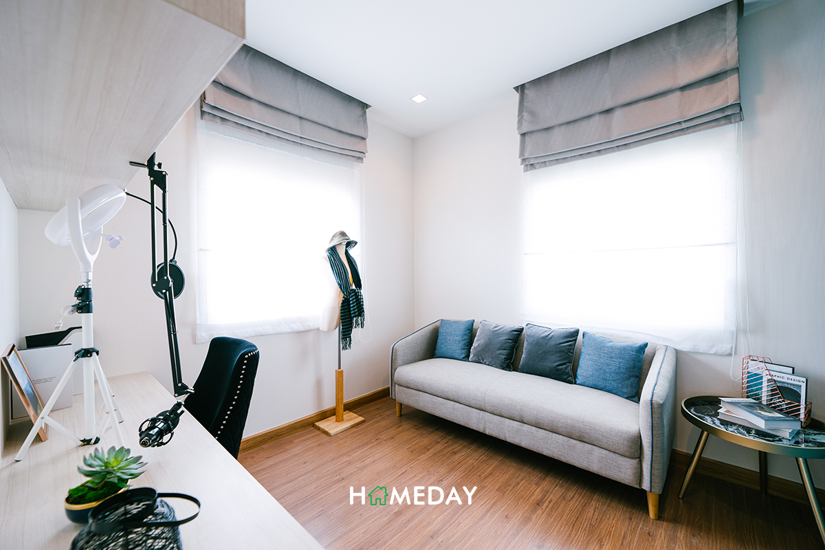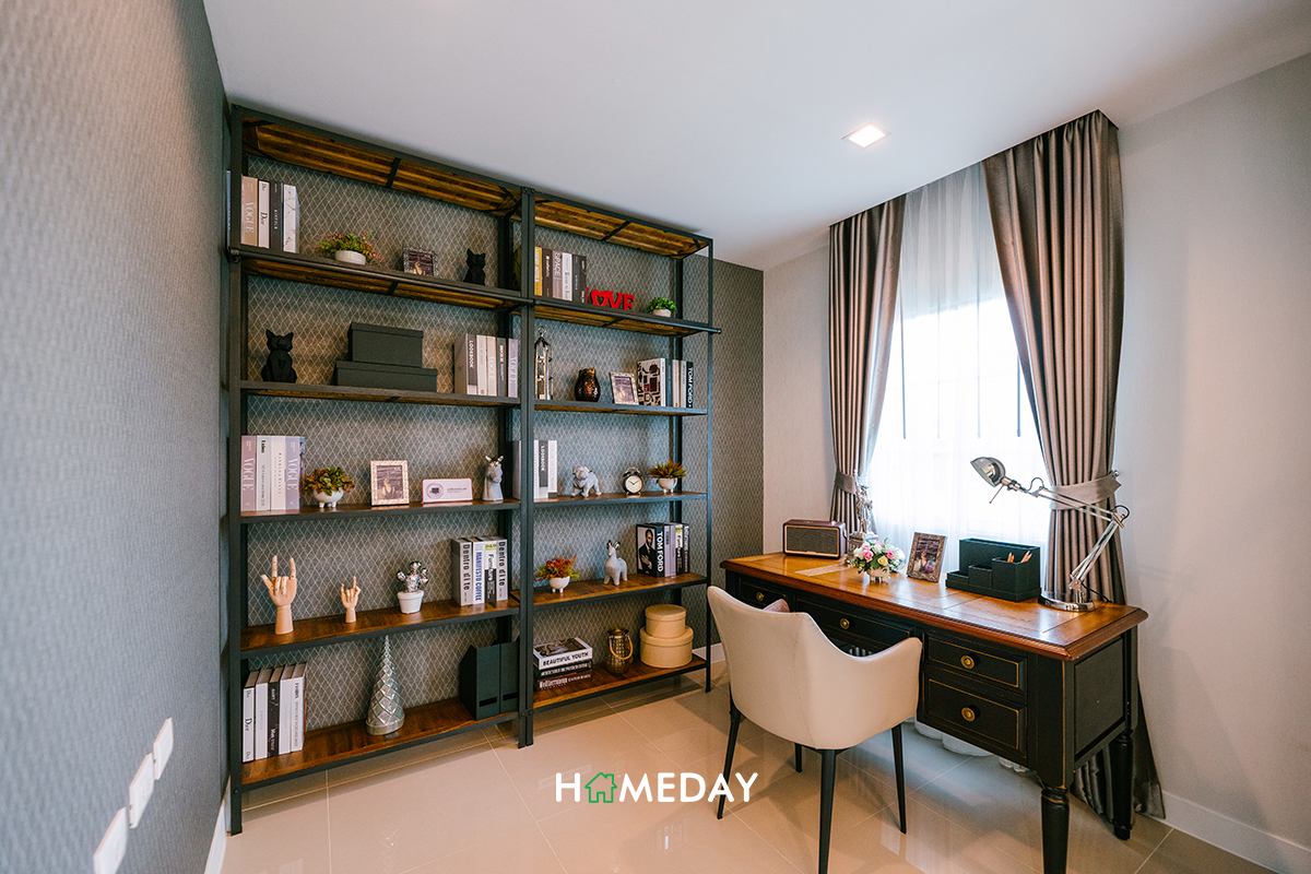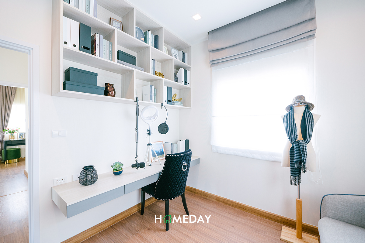 ส่วนตัว Bedroom 3 ขนาดก็ไม่ได้ต่างกันค่ะ หากไม่ได้ใช้งานเป็นห้องนอนก็สามารถปรับเป็นห้องอื่น ๆ ตามความเหมาะสมและความต้องการในการใช้งานของผู้อยู่อาศัยได้เลยค่ะ อย่างบ้านตัวอย่างนี้ก็ตกแต่งให้ดูเป็นลักษณะของห้องทำงานค่ะ