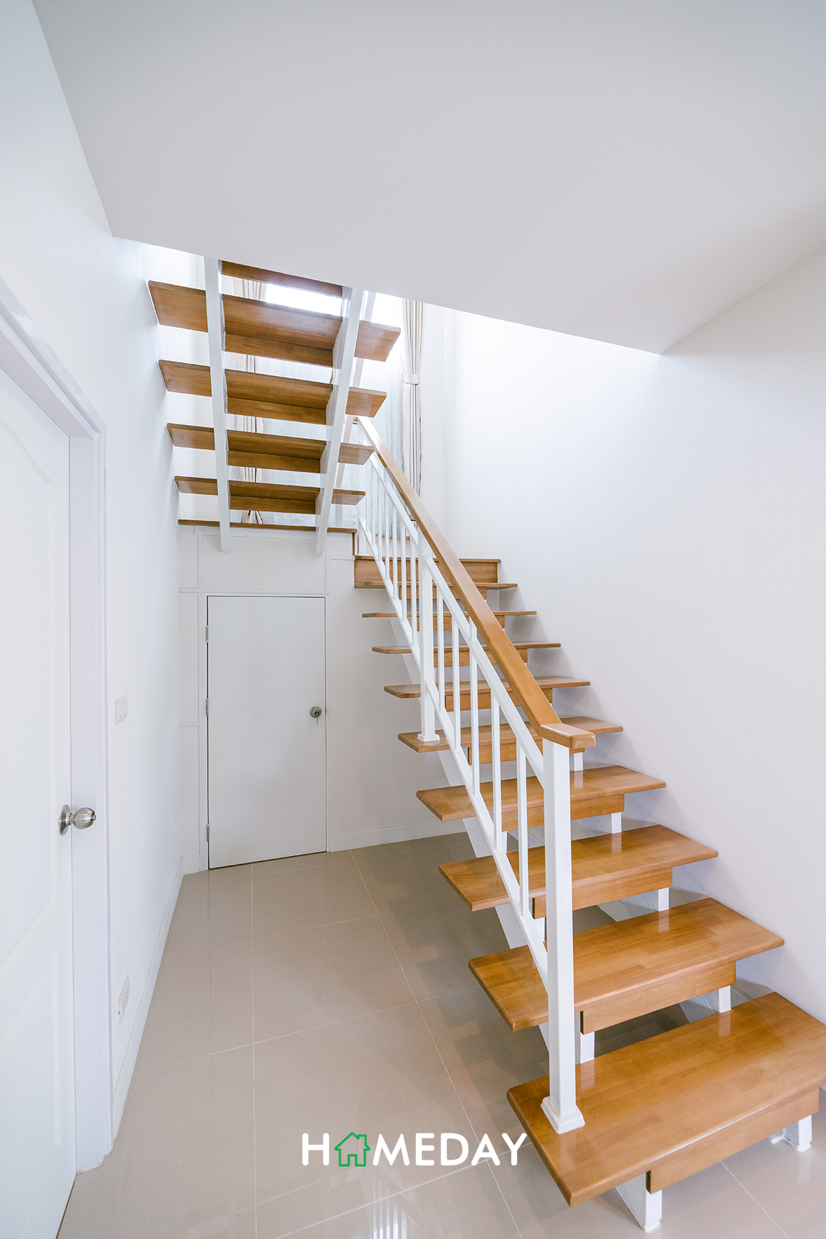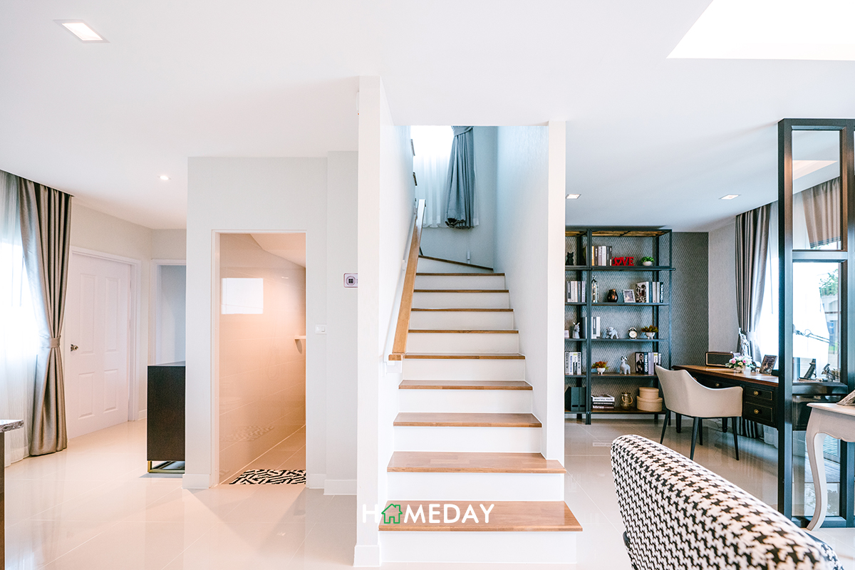 ใต้บันไดได้ห้องเก็บของมาด้วยนะคะ สามารถเก็บพวกของที่ไม่ค่อยได้หยิบใช้ได้เลย จะได้ดูแลทำความสะอาดบ้านได้ง่ายขึ้นค่ะ ตัวบันไดของบ้านก็เป็นแบบลอย ใช้พื้นที่ด้านใต้ได้อีกพอสมควรเลยค่ะ จะแขวนจักรยาน, สกู๊ตเตอร์ไฟฟ้า หรือวางรองเท้า ก็เหมาะค่ะ