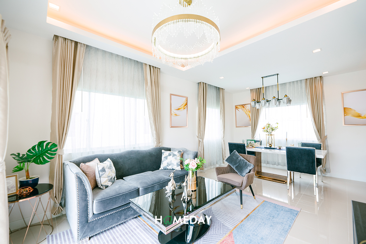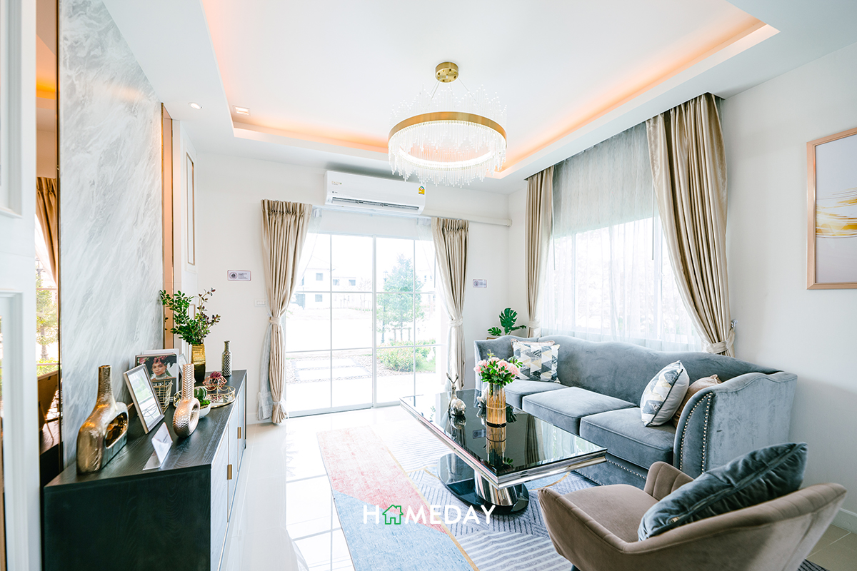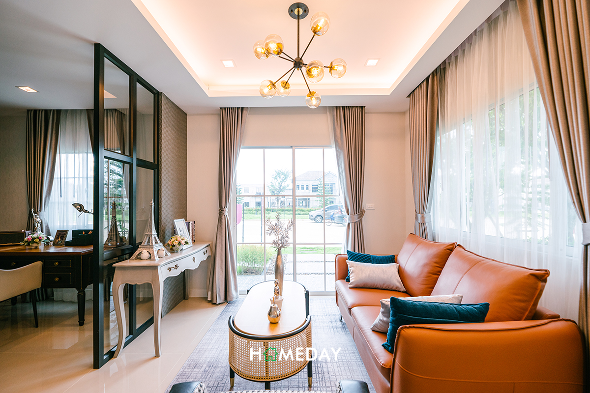 Living Area ของบ้านตัวอย่าง เนื่องจากอยู่เชื่อมกับส่วนอเนกประสงค์ที่บิลต์ Partition เพิ่ม ทำให้วางชั้นทีวีได้ไม่เต็มที่ค่ะ บ้านจริงเราสามารถจัดวางตำแหน่งต่าง ๆ ใหม่ให้เหมาะสมกับความต้องการได้ จะกั้นห้องเพิ่มตามแบบห้องตัวอย่าง หรือจะปล่อยให้พื้นที่ลิงก์ถึงกันก็ได้ค่ะ