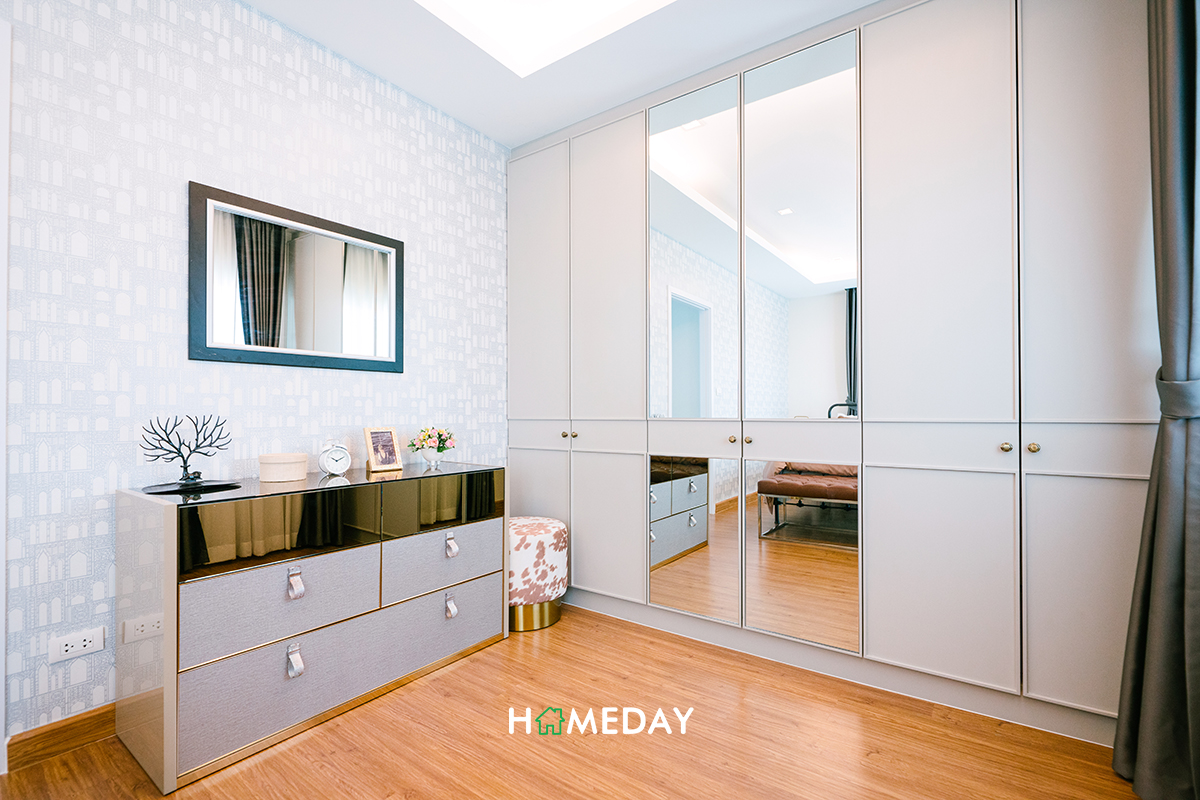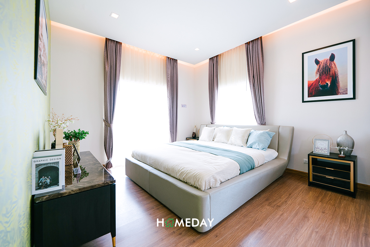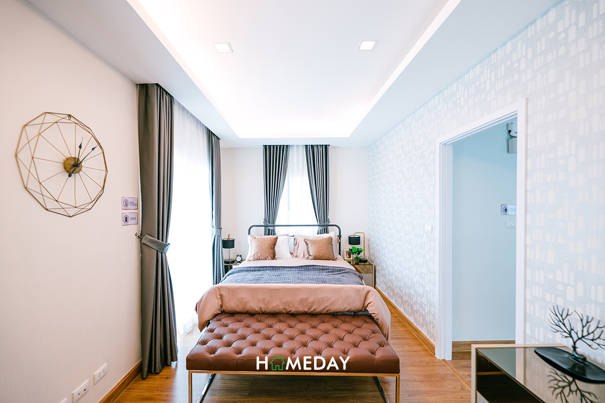 Master Bedroom ของแบบบ้านนี้ ยังคงได้แปลนแบบหน้ากว้างมาอยู่ค่ะ ข้อดีของแปลนลักษณะนี้คือทำให้ห้องดูกว้างและโอ่โถงมากขึ้นนั่นเอง ภายในห้องเมื่อเข้าไป ด้านขวามือจะเป็นพื้นที่วางเตียงติดระเบียงค่ะ สามารถวางเตียงขนาดใหญ่พร้อมโต๊ะหัวเตียงได้ทั้ง 2 ฝั่งเหมือนเช่นเคย ซ้ายมือของห้องเป็นพื้นที่โล่ง ๆ เราสามารถแบ่งสัดส่วนการใช้งานได้เอง หรือจะทำเป็น Walk-in Closet เหมือนกับบ้านตัวอย่างก็ได้ค่ะ