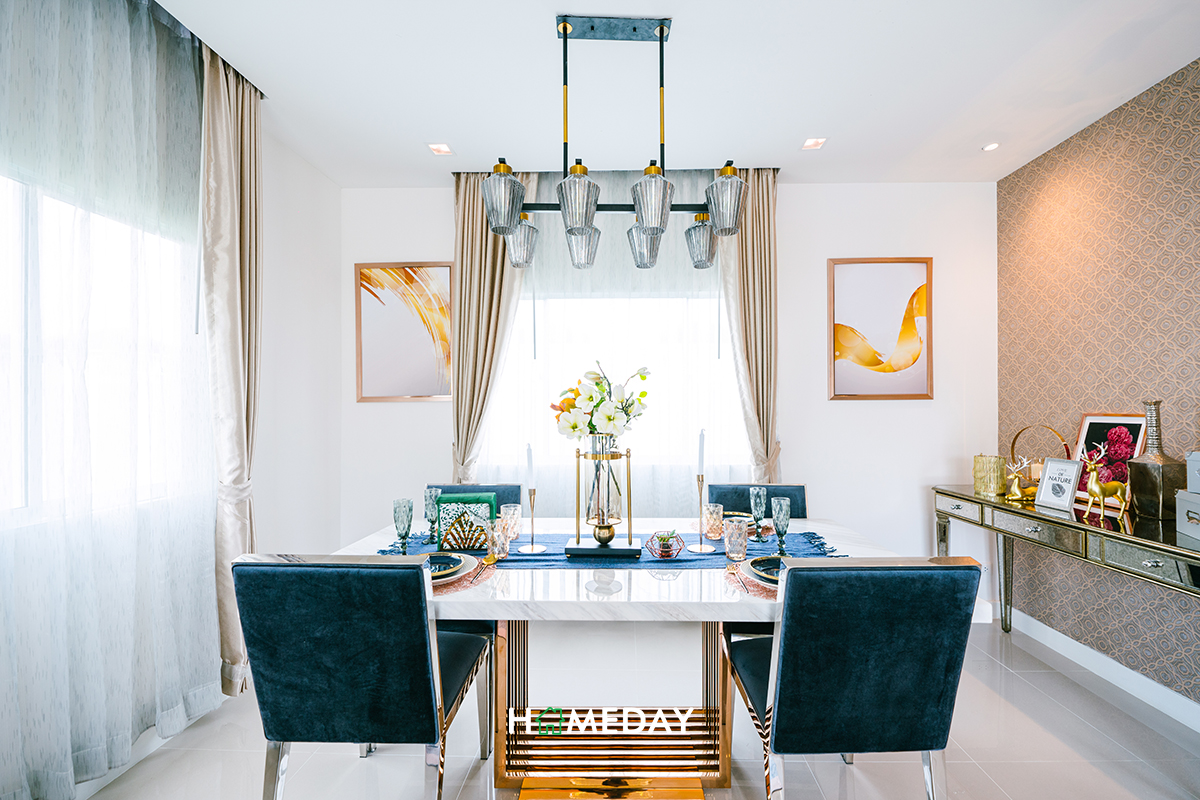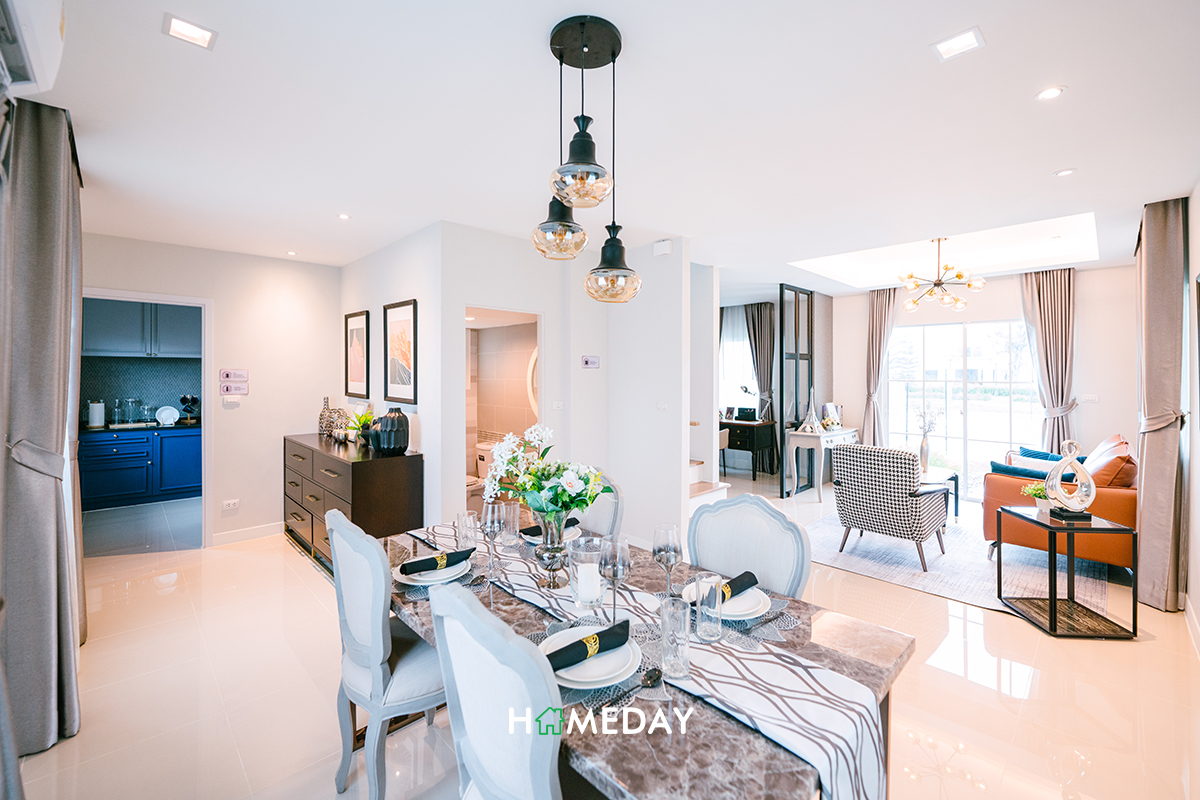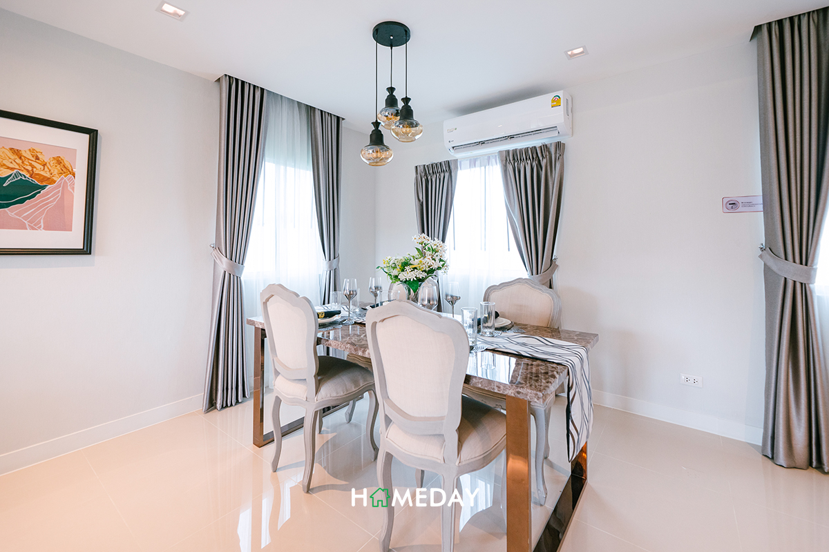 ในส่วนของ Dining Area ก็กว้างขวางมาก สามารถวางชุดโต๊ะเก้าอี้ขนาด 4-6 ที่นั่งได้สบาย ๆ เลย แถมยังเหลือเนื้อที่รอบ ๆ ให้วางชั้นเพิ่มเติมได้ด้วยค่ะ เดินเข้า-ออกได้สบายอีกด้วย