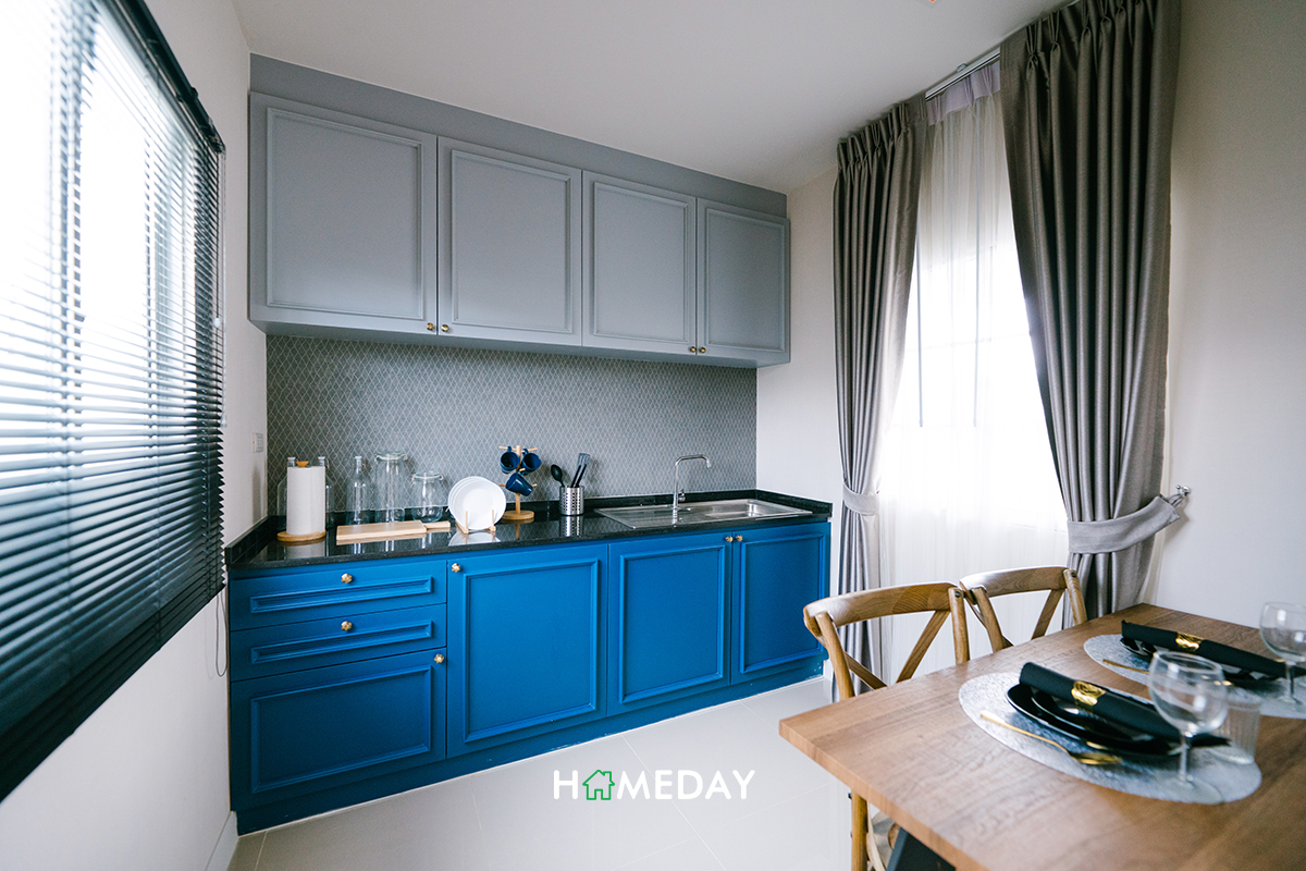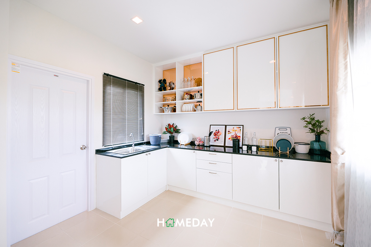 ครัวของแบบบ้านนี้เป็นครัวปิด ภายในได้กระจกมา 2 บาน และมีทางเชื่อมออกไปยังลานซักล้างที่ห้องนี้ด้วยค่ะ สามารถเปิดบานหน้าต่างออกเวลาทำอาหารเพื่อช่วยระบายอากาศและความชื้นได้ หรือจะติดตั้ง Hood ดูดควันเพื่อช่วยระบายกลิ่นเพิ่มเติมก็ได้ค่ะ