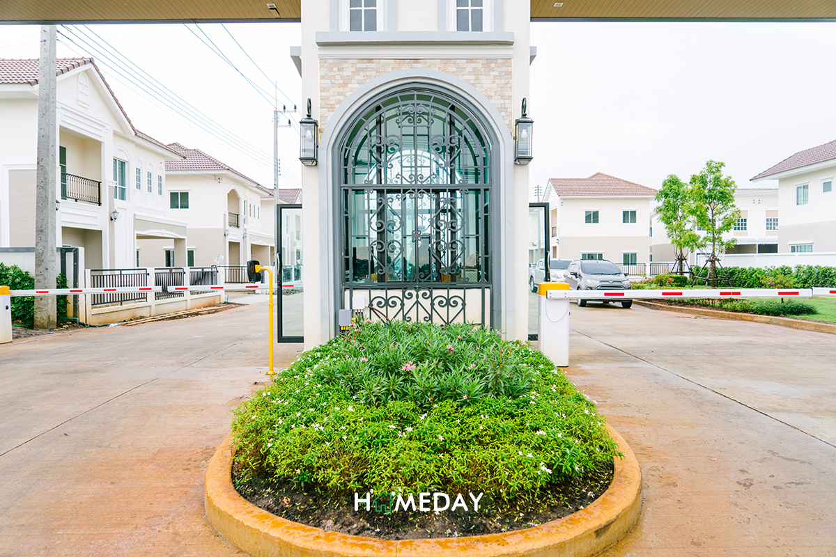 ซุ้มทางเข้าโครงการดีไซน์แบบ French Colonial Style ดูคลาสสิค แยกทางเข้า-ออกเป็น 2 ฝั่ง มีป้อมของพี่ ๆ รปภ. อยู่บริเวณกลางซุ้มค่ะ ตัวโครงการกั้นออกจากพื้นที่ด้านนอกด้วยไม้กระดกตามมาตรฐาน และมีกล้อง CCTV คอยจับภาพการเข้า-ออกของบุคคลภายนอกตลอด 24 ชั่วโมงด้วยค่ะ