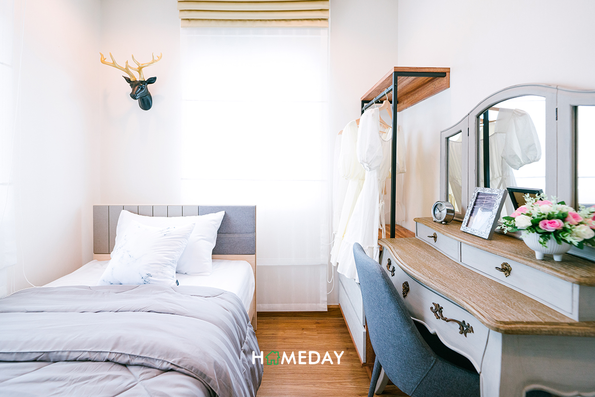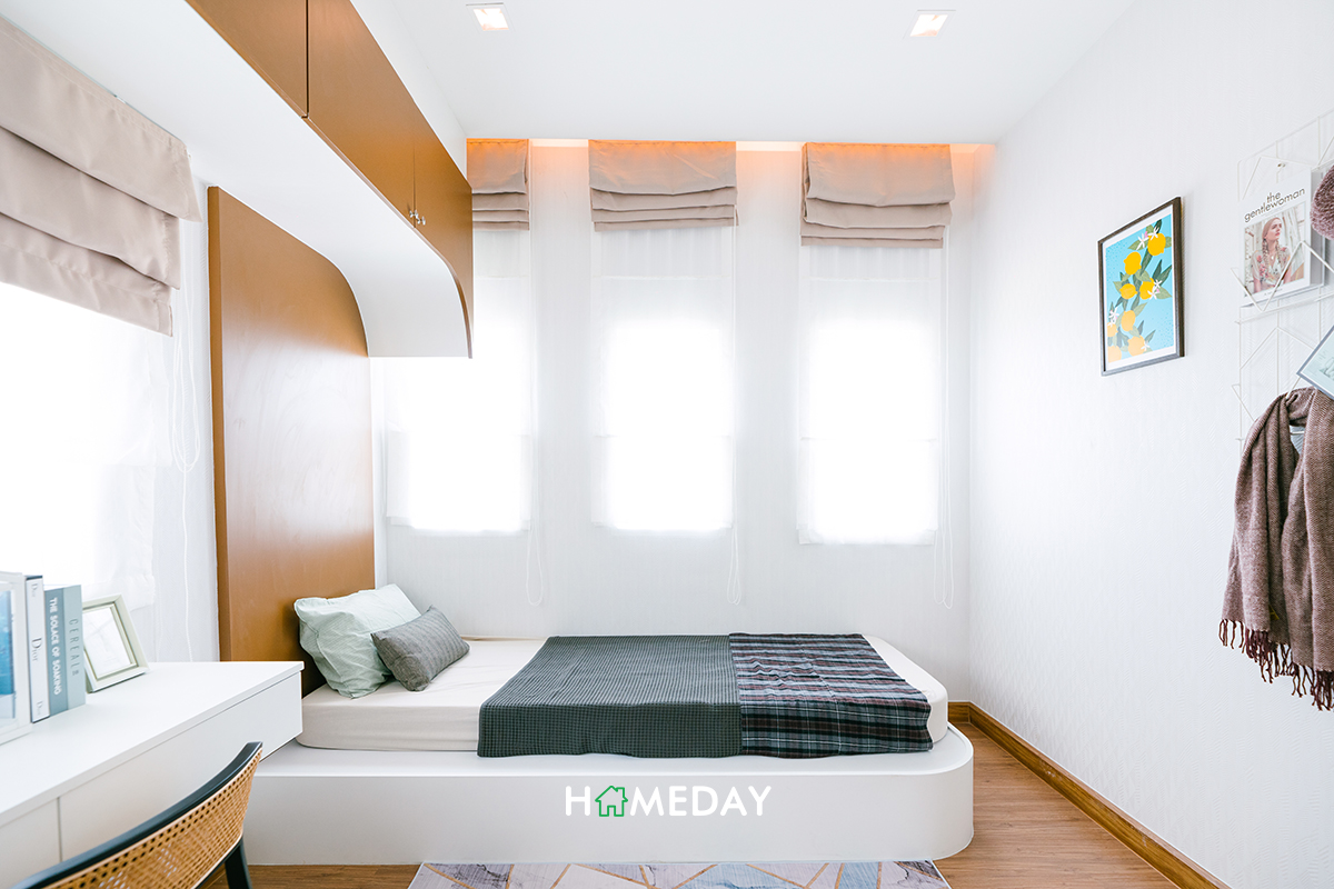 มาถึงทางด้านของ Bedroom 2 กันบ้างค่ะ ภายในใหญ่พอสำหรับวางเตียงขนาด 5 ฟุตได้เลย แต่ทางบ้านตัวอย่างวางให้ดูเป็นเตียงเล็กขนาด 3.5 ฟุต เพื่อให้เห็นว่าเนื้อที่ของห้องยังเหลือเยอะให้สามารถวางเฟอร์นิเจอร์ต่าง ๆ ที่ต้องการได้อีกเยอะเลยค่ะ