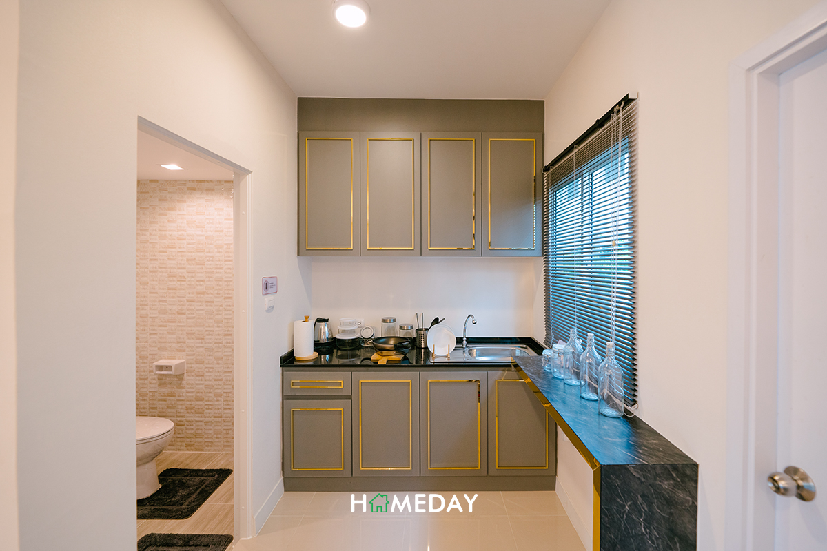 ซ้ายมือถัดเข้าไป จะเป็นพื้นที่ว่างอีก 1 จุด ที่อยู่เชื่อมต่อกับห้องน้ำชั้นล่าง ซึ่งทางโครงการก็ได้ตกแต่งให้ดูเป็นลักษณะของครัวเปิดเล็ก ๆ ที่ไม่เน้นการใช้งานที่หนักมากนัก สามารถบิลต์เคาน์เตอร์วางซิงค์ล้างจานและเตาไฟฟ้าขนาด 2 หัวได้อย่างลงตัว แต่ถ้าใครที่อยากใช้งานครัวหนัก ๆ ก็อาจจะต่อเติมครัวนอกบริเวณลานซักล้างแทน แล้วปรับบริเวณนี้เป็นพื้นที่เก็บของก็ได้นะคะ