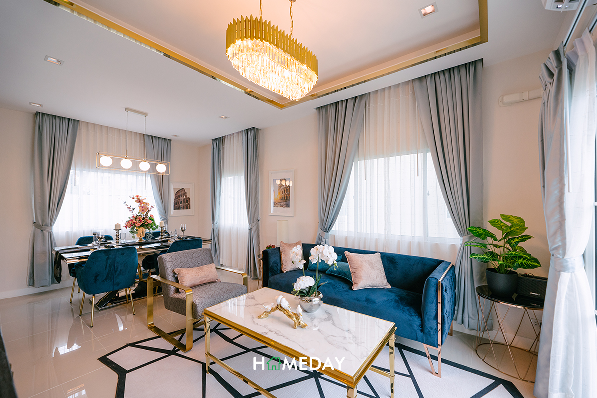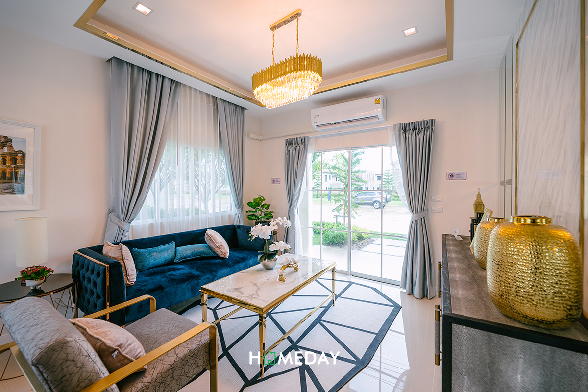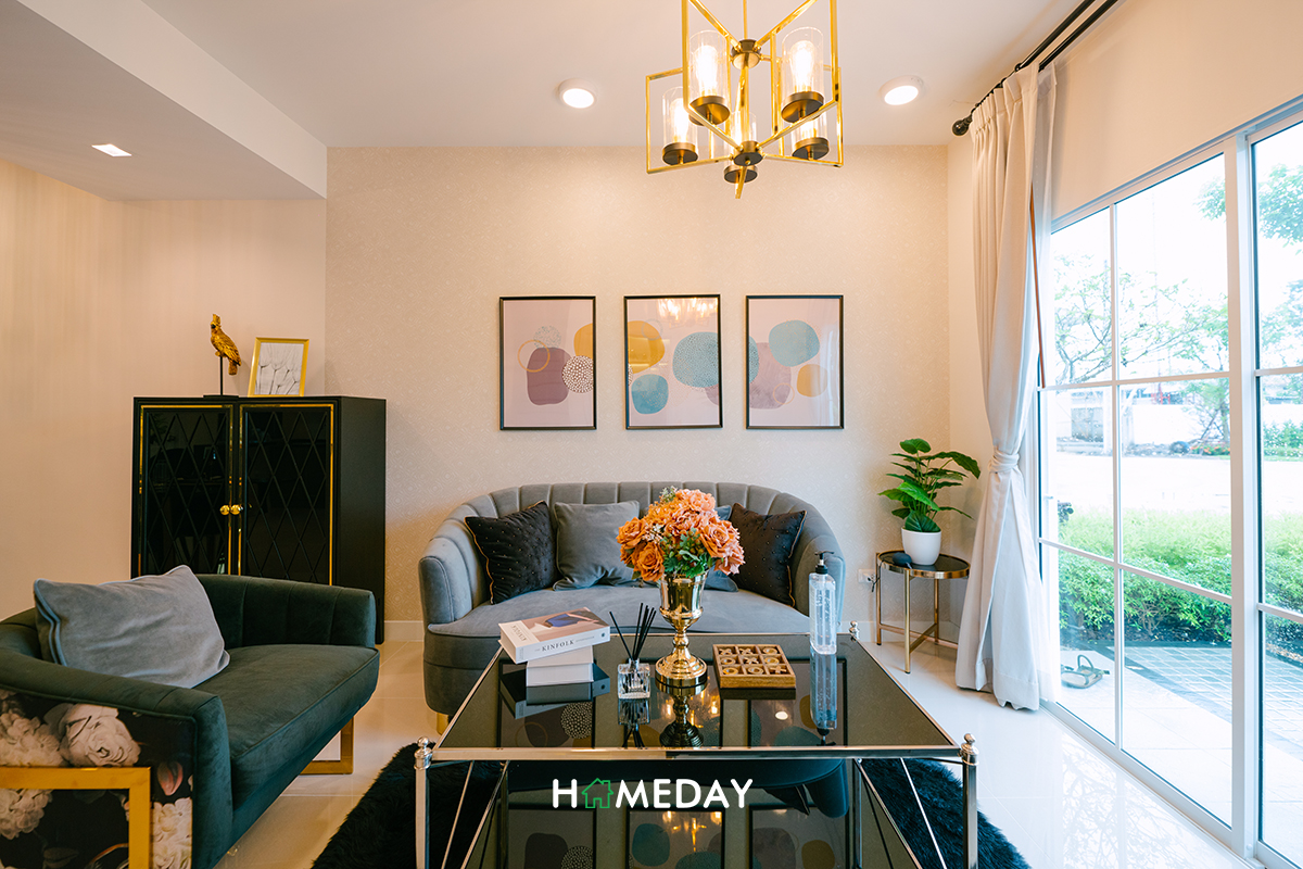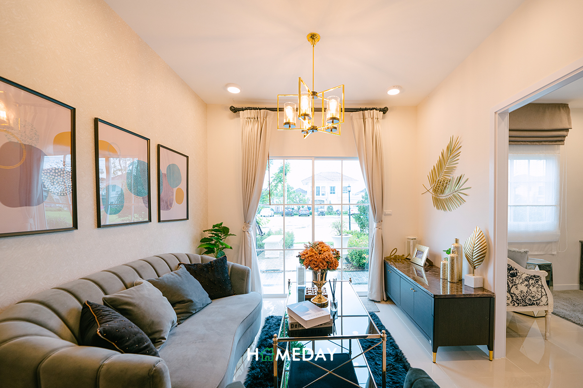 โซฟาเหมาะจะวางขนาด 3-4 ที่นั่งค่ะ หรือจะวางแยกเป็น 2 ที่นั่ง 1 ตัว พร้อมอาร์มแชร์อีก 1 ตัวเหมือนกับบ้านตัวอย่างก็ได้นะคะ รอบข้างยังเหลือเนื้อที่ให้สามารถวางตู้และโต๊ะเล็ก ๆ สำหรับวางต้นไม้, โคมไฟ หรือของตกแต่งอื่น ๆ ได้อีกค่ะ