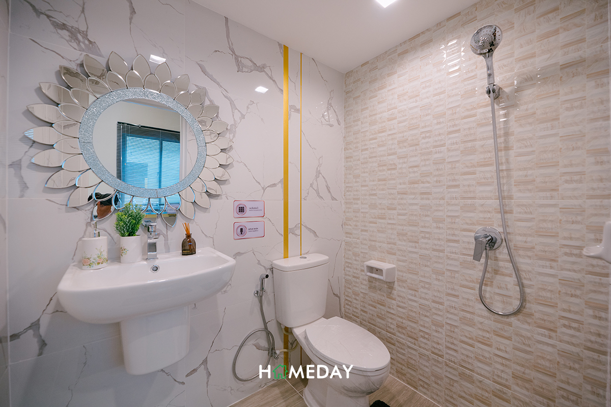 ห้องน้ำชั้นล่างให้ชุดสุขภัณฑ์มาครบค่ะ ทั้งอ่างล้างหน้า, บานกระจกเงา, โถสุขภัณฑ์, สายชำระ, ที่ใส่กระดาษทิชชู่, ฝักบัวอาบน้ำ และที่วางสบู่ ซึ่งก็สามารถใช้งานได้ทั้งการทำธุระส่วนตัวและการอาบน้ำค่ะ