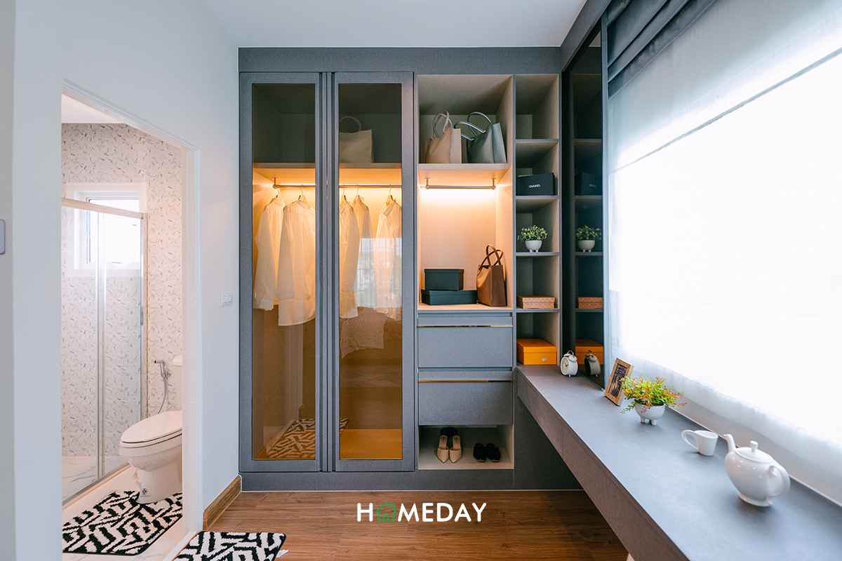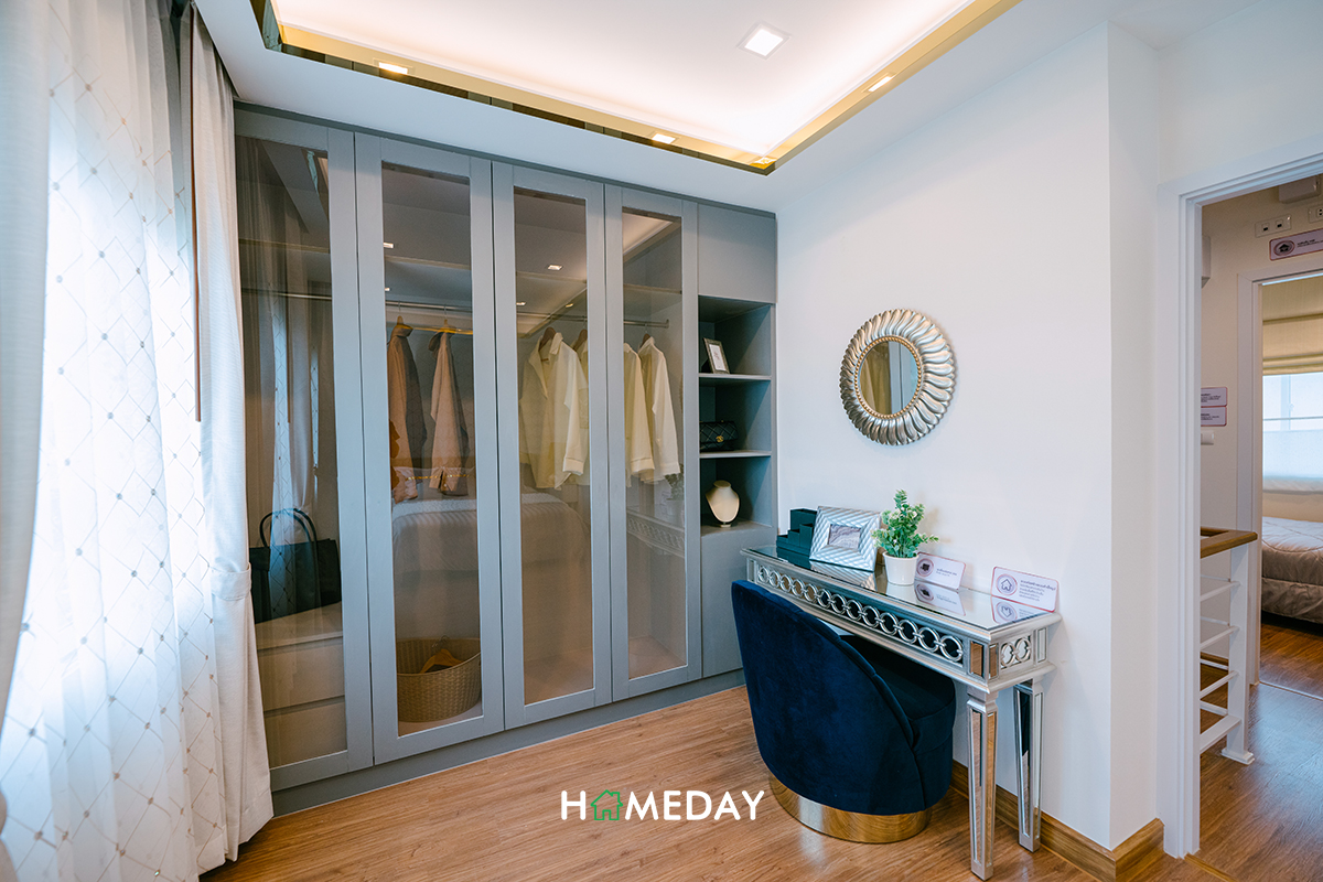 ส่วนทางฝั่งซ้ายจะเป็นมุมสำหรับวางตู้เสื้อผ้าและโต๊ะเครื่องแป้ง แนะนำให้บิลต์ตู้ความสูงเต็มพื้นที่ Floor to ceiling เลยนะคะ จะได้มีพื้นที่จัดเก็บได้เต็มที่มากขึ้นค่ะ และมุมนี้ก็จะมีประตูทางเชื่อมไปยังห้องน้ำของชั้น 2 ด้วย ไม่ต้องเดินออกมานอกห้องเพื่อเข้าเลยค่ะ เชื่อมจากในตัวห้องได้เลย สะดวกและเป็นส่วนตัวทีเดียวค่ะ