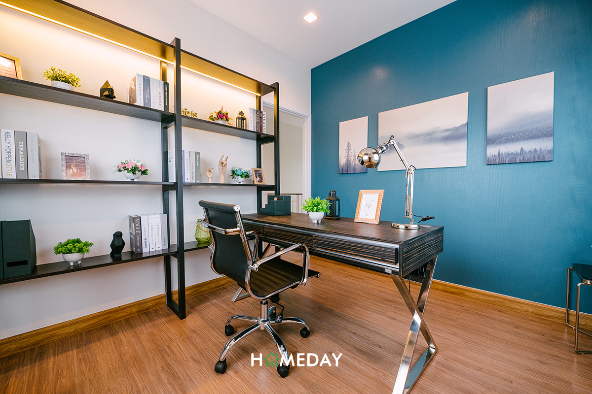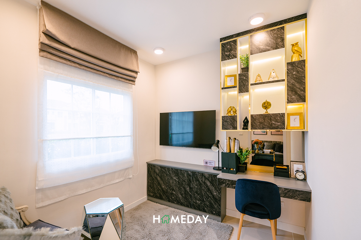 Bedroom 3 ก็ได้พื้นที่มาใกล้เคียงกับ Bedroom 2 เลยค่ะ แต่ทางโครงการตกแต่งเอาไว้ให้ดูเป็นห้องทำงานส่วนตัว หากใครสนใจจะปรับพื้นที่ห้องเป็นห้องอเนกประสงค์อื่น ๆ ก็สามารถทำได้ตามความต้องการของเราเลย