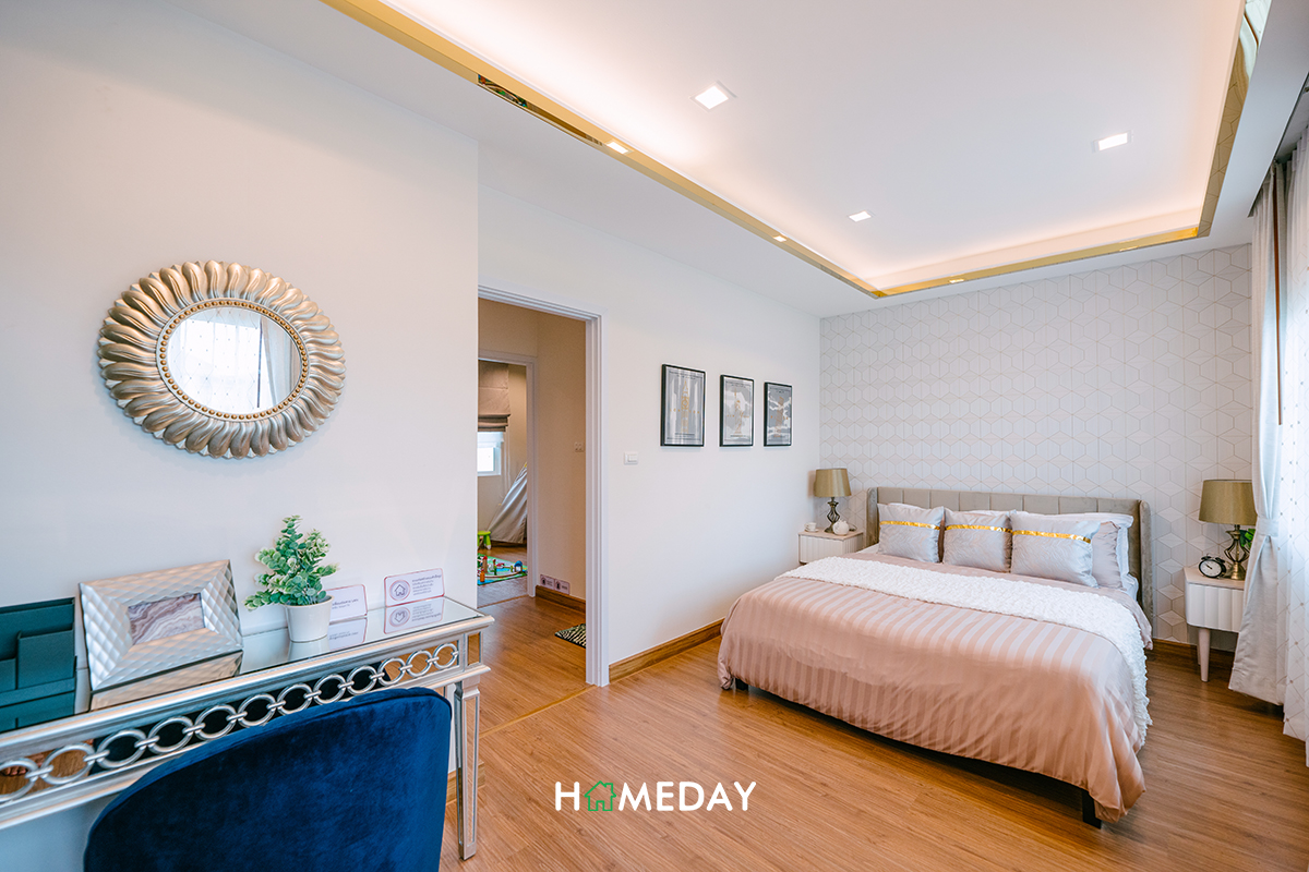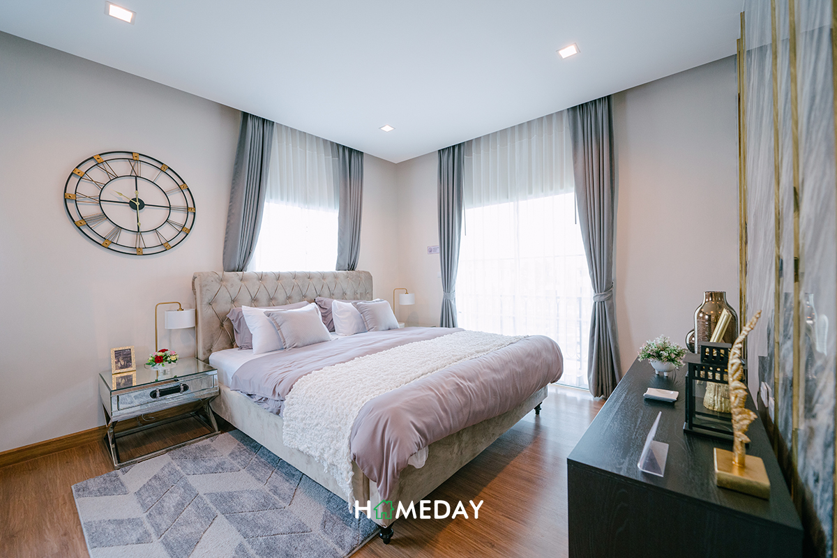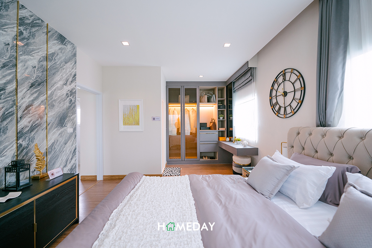 Master Bedroom เปิดเข้าไป ด้านขวามือจะเป็นพื้นที่วางเตียงขนาดใหญ่เลยค่ะ สามารถวางเตียง 5 ฟุตได้ รอบเตียงสามารถวางโต๊ะหัวเตียงสำหรับวางโคมไฟและเพิ่มพื้นที่จัดเก็บได้ทั้ง 2 ฝั่งค่ะ ปลายเตียงสามารถวางตู้ลิ้นชักหรือชั้นวางทีวีก็ได้ค่ะ เหลือพื้นที่รอบเตียงให้เดินได้คล่องอยู่ ไม่มีปัญหาเลยค่ะ