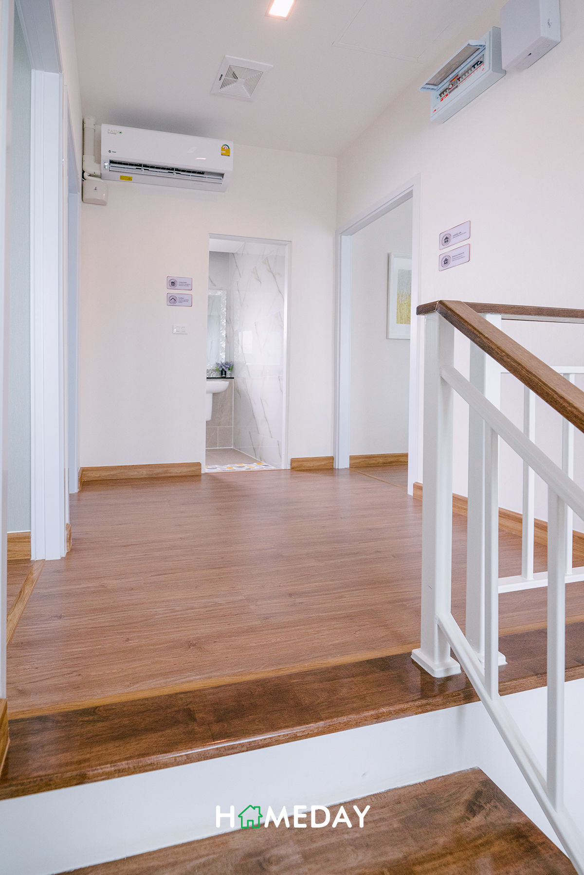 มาถึงชั้น 2 กันบ้างนะคะ เมื่อเดินขึ้นมาถึง ตรงหน้าเราจะเจอกับห้องน้ำของชั้นนี้กันก่อนเลยค่ะ ขวามือจะเป็น Master Bedroom ส่วนซ้ายมือจะเป็นทางเข้าของ Bedroom 2 และ Bedroom 3 นั่นเองค่ะ