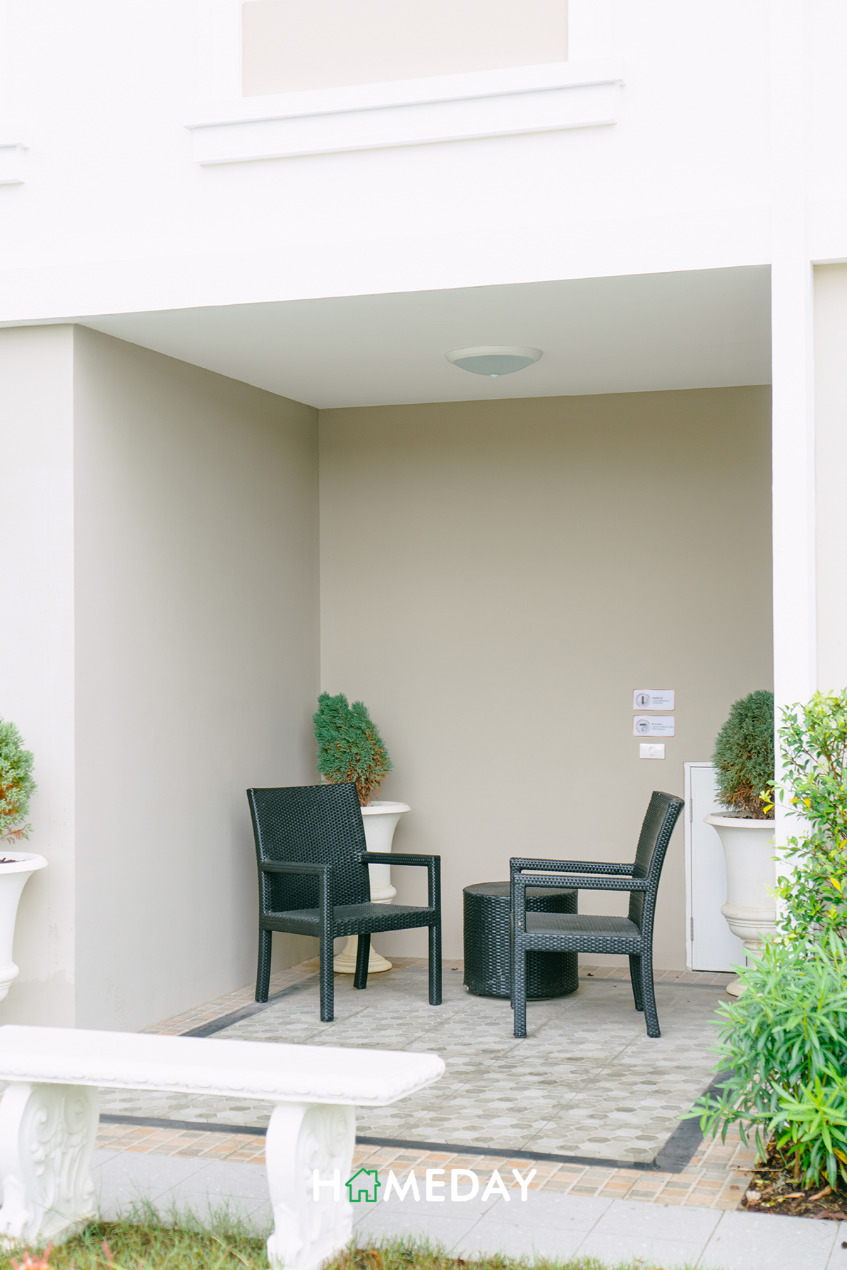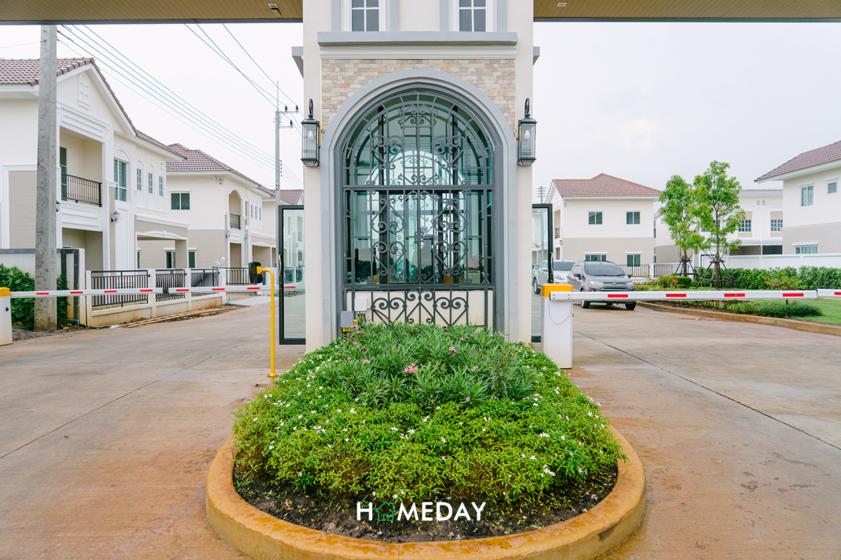 ซุ้มทางเข้าโครงการดีไซน์แบบ French Colonial Style ดูคลาสสิค แยกทางเข้า-ออกเป็น 2 ฝั่ง มีป้อมของพี่ ๆ รปภ. อยู่บริเวณกลางซุ้มค่ะ ตัวโครงการกั้นออกจากพื้นที่ด้านนอกด้วยไม้กระดกตามมาตรฐาน และมีกล้อง CCTV คอยจับภาพการเข้า-ออกของบุคคลภายนอกตลอด 24 ชั่วโมงด้วยค่ะ