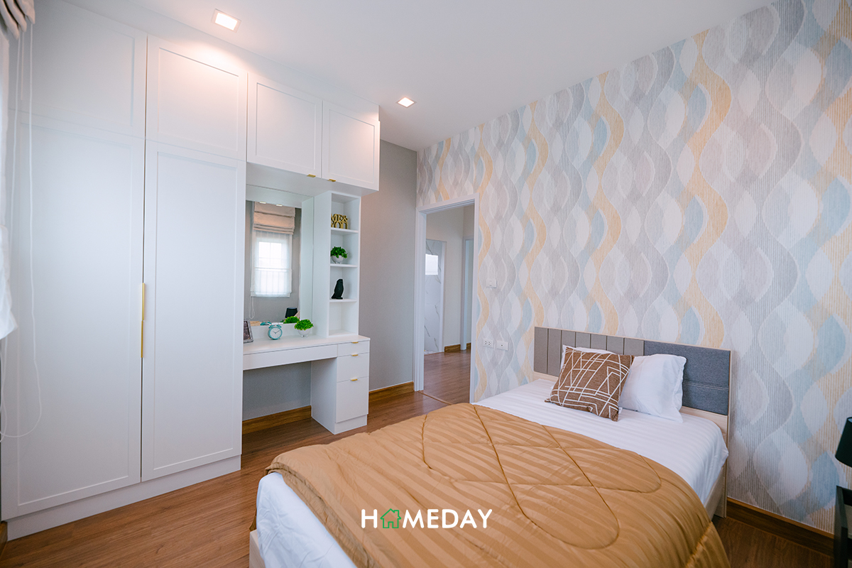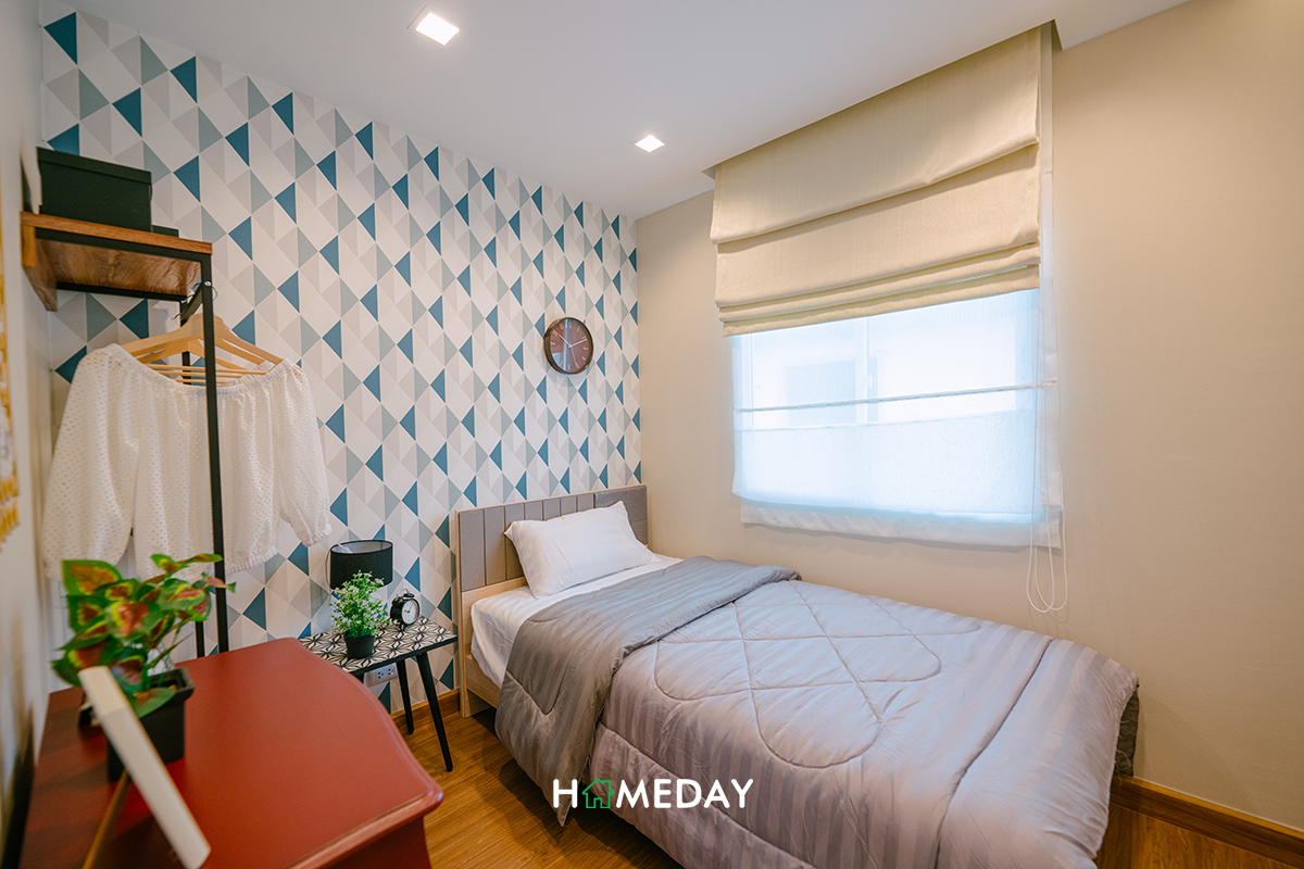 Bedroom 2 ได้พื้นที่มาลงตัวสำหรับเตียง 3.5 ฟุตค่ะ ภายในยังเหลือพื้นที่ให้วางเฟอร์นิเจอร์พื้นฐานได้ครบ ทั้งตู้เสื้อผ้า, โต๊ะเครื่องแป้ง และโต๊ะหัวเตียง จะแขวนโต๊ะอ่านหนังสือเล็ก ๆ ริมหน้าต่างเพิ่มก็ลงตัวนะคะ