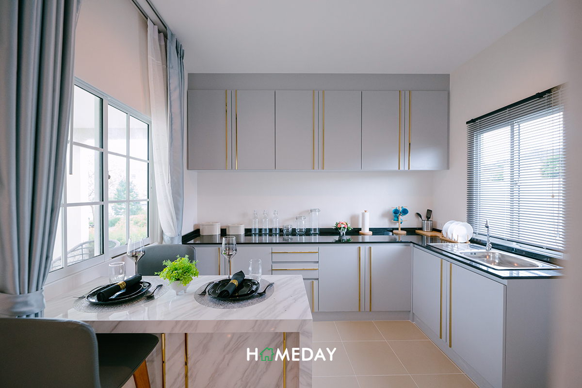 ติดกันกับ Dining ก็จะเป็นพื้นที่ส่วนครัวเปิดที่สามารถวางเคาน์เตอร์แบบเข้ามุมได้เลยค่ะ พื้นที่นี้ได้บานหน้าต่างมา 2 บาน 2 ฝั่งเลย เปิดระบายความชื้นและระบายกลิ่นอาหารได้เป็นอย่างดีค่ะ หรือจะติดตั้ง Hood ดูดควันเพิ่มเติมก็ได้นะคะ แต่ถ้าอยากได้เป็นครัวปิด 100% ก็แนะนำให้ติดตั้ง Partiton เพิ่มเติมค่ะ ช่วยให้บ้านเป็นสัดส่วนได้มากขึ้นทีเดียว