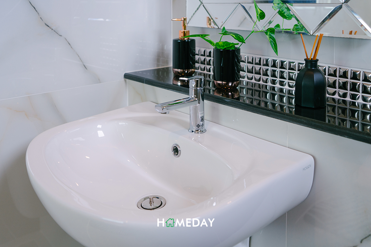 ฝั่งตรงข้ามกับบันไดจะเป็นห้องน้ำชั้นล่างของตัวบ้านค่ะ ภายในเมื่อเดินเข้าไป ขวามือจะเจอกับโถสุขภัณฑ์ก่อนค่ะ ตัวโถมาพร้อมที่ใส่กระดาษทิชชู่และสายชำระ ด้านในสุดซ้ายมือจะเป็นอ่างล้างหน้าพร้อมบานกระจกและ Low Wall สำหรับวางขวดสบู่ต่าง ๆ และมีราวแขวนผ้าขนหนูมาให้ด้วยค่ะ ส่วนด้านในสุดขวามือจะเป็น Hand Shower มาพร้อมที่วางสบู่ และมีหน้าต่างบานกระทุ้งสำหรับระบายกาอาศและความชื้นมาให้อีก 1 บานค่ะ