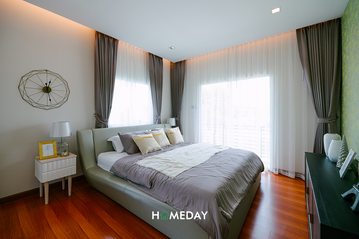 มาถึงชั้น 2 กันบ้างค่ะ ตัวห้อง Master Bedroom ภายในจะแบ่งโซนพื้นที่การใช้งานออกเป็น 2 ฝั่ง ลักษณะเป็นห้องหน้ากว้าง มีห้องน้ำภายในตัวค่ะ บานกระจกภายในห้องได้มามากถึง 3 บาน ช่วยรับแสงและส่องสว่างทำให้ห้องยิ่งมีความโปร่งโล่งสบายได้มากขึ้นไปอีกค่ะ