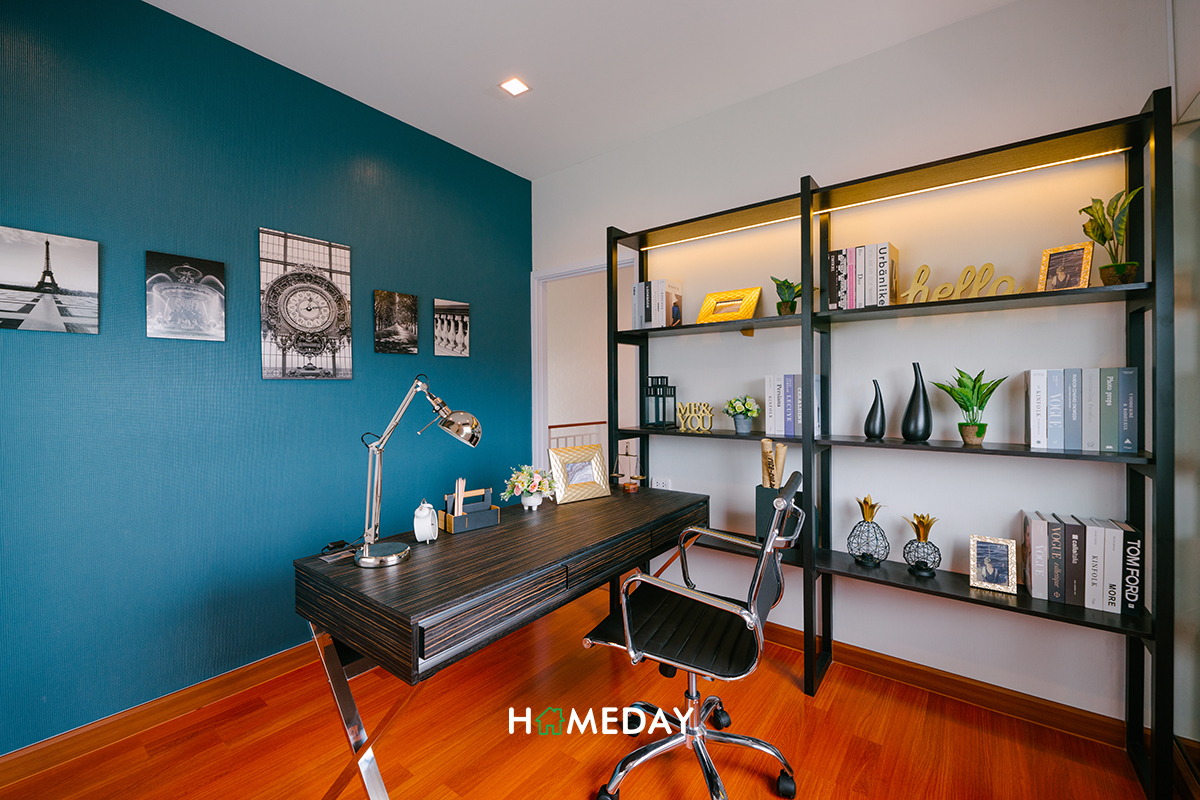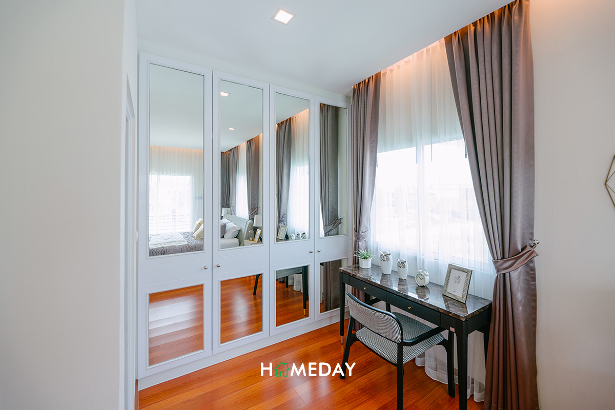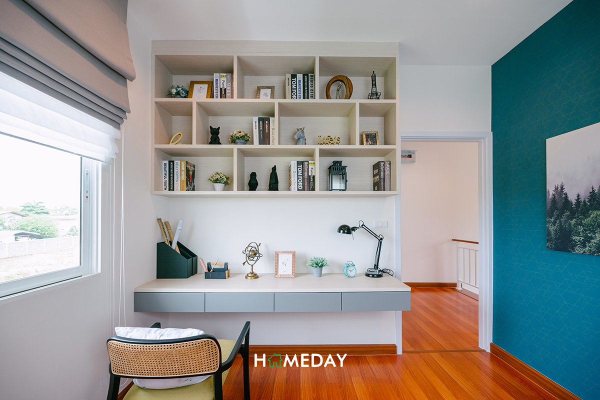 ส่วนทางด้านของ Bedroom 3 ทางบ้านตัวอย่างตกแต่งไว้ให้ดูเป็นห้องทำงานส่วนตัวนั่นเองค่ะ สำหรับใครที่ไม่ได้ใช้งานห้องนอน ก็สามารถออกแบบเป็นห้องอื่น ๆ ได้ตามความต้องการเลยค่ะ หรือถ้าใครเสื้อผ้าเยอะมาก ๆ จะทำห้องนี้เป็น Walk-in Closet ทั้งห้องไปเลยก็สามารถทำได้นะคะ
