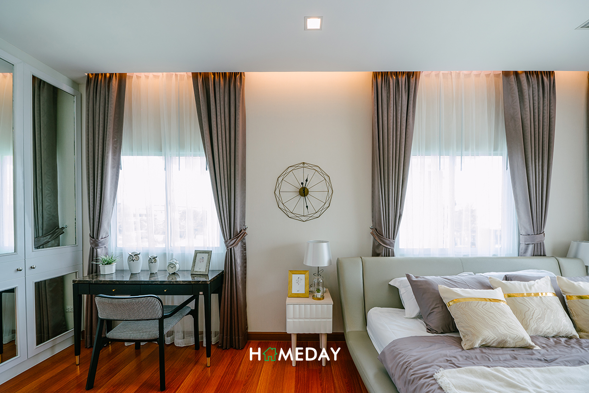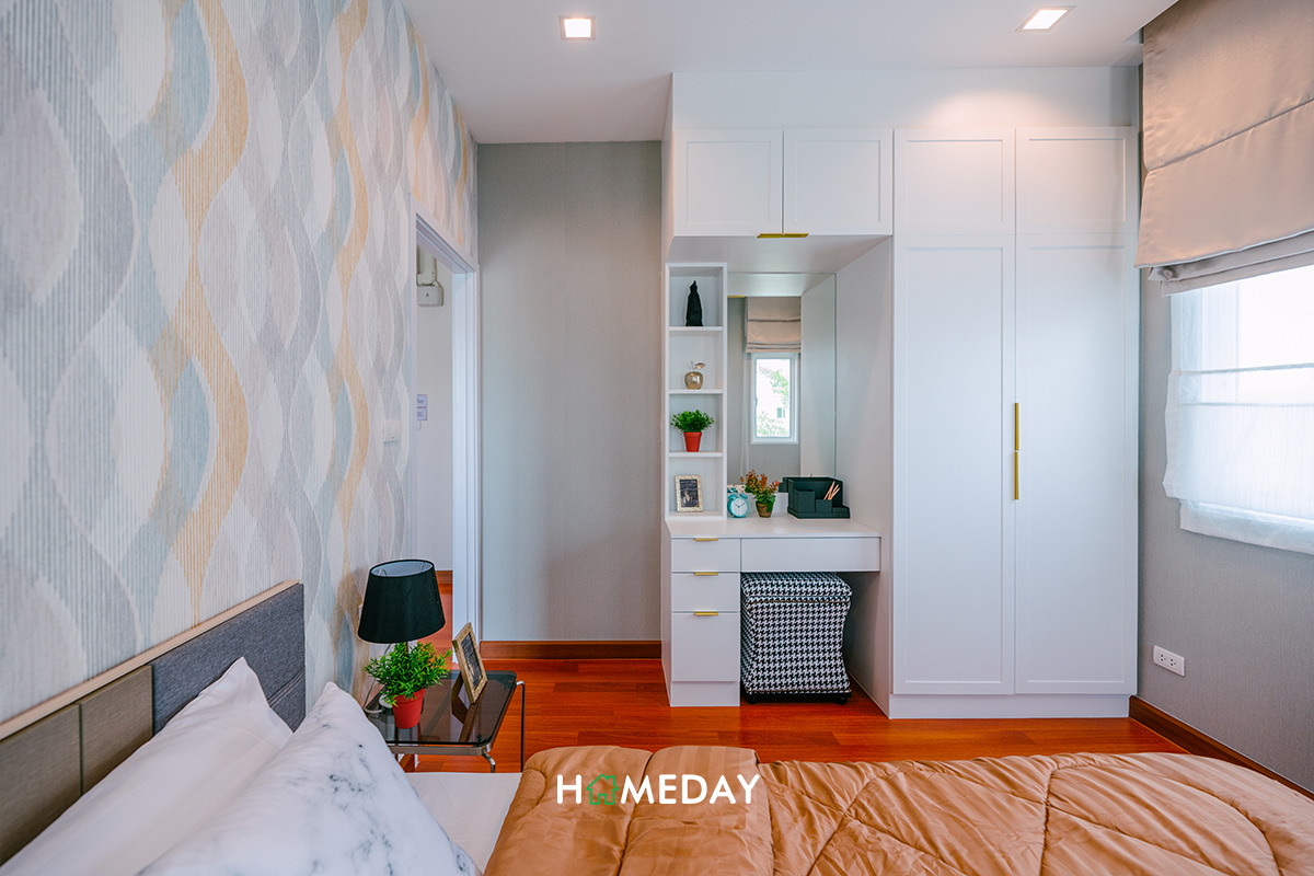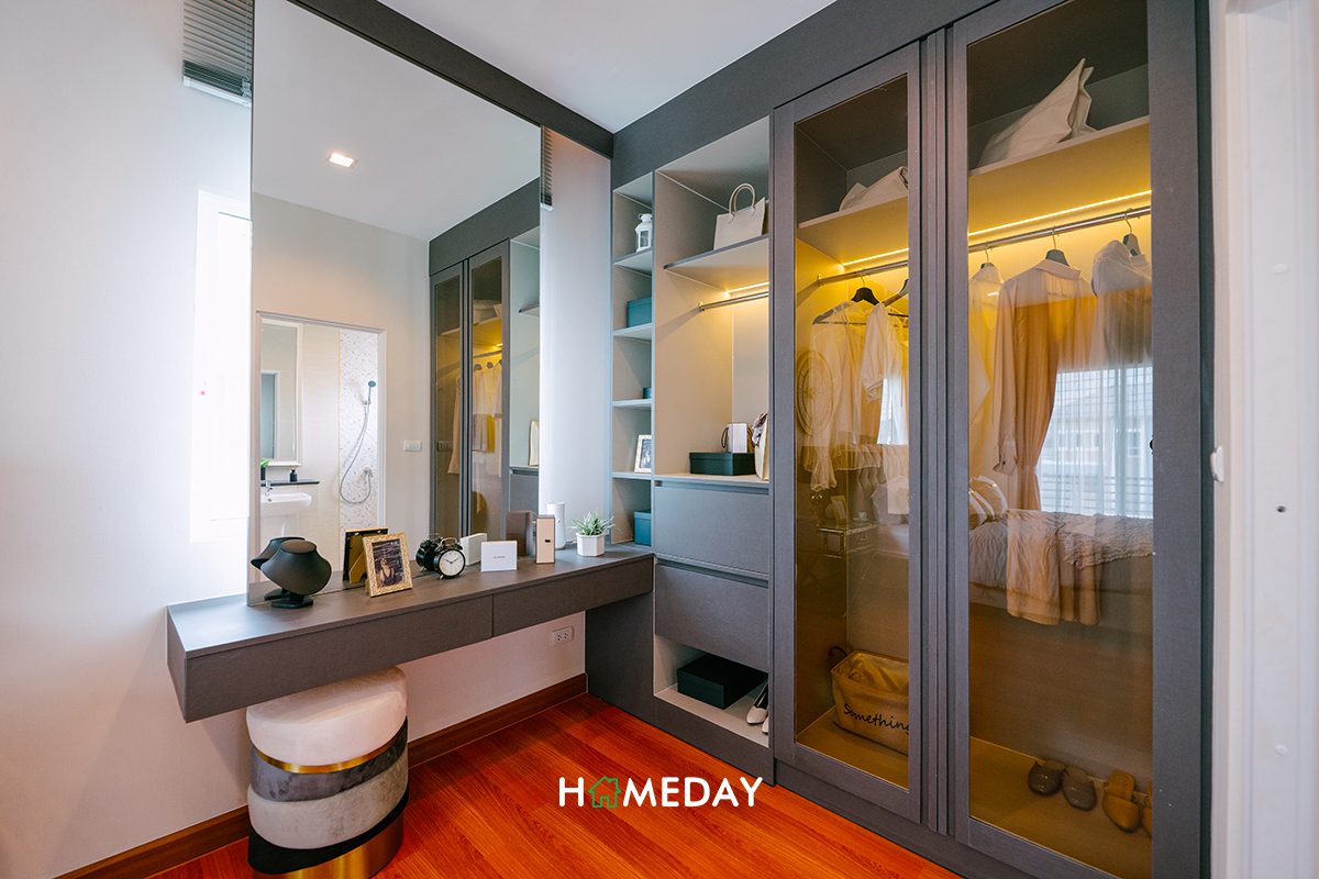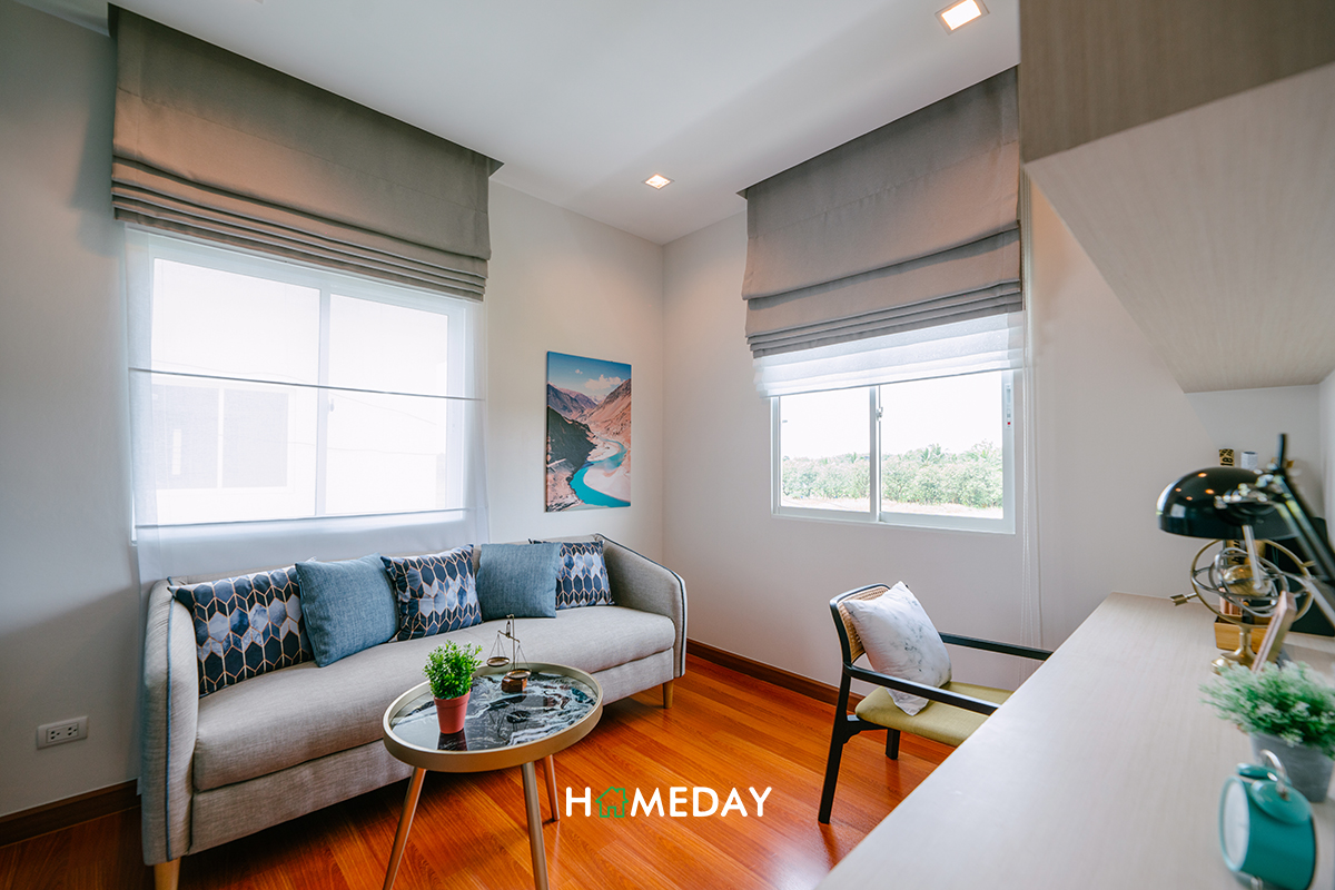 ส่วนทางด้านของ Bedroom 3 ทางบ้านตัวอย่างตกแต่งไว้ให้ดูเป็นห้องทำงานส่วนตัวนั่นเองค่ะ สำหรับใครที่ไม่ได้ใช้งานห้องนอน ก็สามารถออกแบบเป็นห้องอื่น ๆ ได้ตามความต้องการเลยค่ะ หรือถ้าใครเสื้อผ้าเยอะมาก ๆ จะทำห้องนี้เป็น Walk-in Closet ทั้งห้องไปเลยก็สามารถทำได้นะคะ