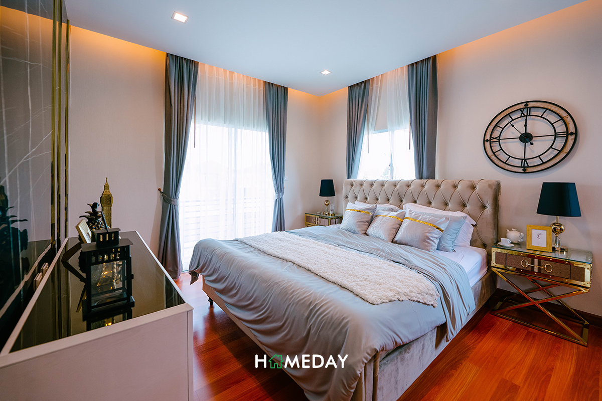 มาค่ะ มาสำรวจต่อกันที่ชั้น 2 กันเลย เริ่มต้นกันด้วย Master Bedroom ของตัวบ้านค่ะ เมื่อเปิดเข้าไป ซ้ายมือของห้องจะเป็นพื้นที่สำหรับวางเตียง อยู่ติดกับระเบียงของห้องค่ะ สามารถวางเตียงขนาดใหญ่ได้ถึง 6 ฟุตเลยนะคะ หัวเตียงทั้ง 2 ฝั่งสามารถวางโต๊ะหัวเตียงได้ค่ะ ปลายเตียงก็สามารถบิลต์ชั้นทีวี พร้อมติดตั้งทีวีสำหรับรับชมสบาย ๆ บนเตียงได้เลย
