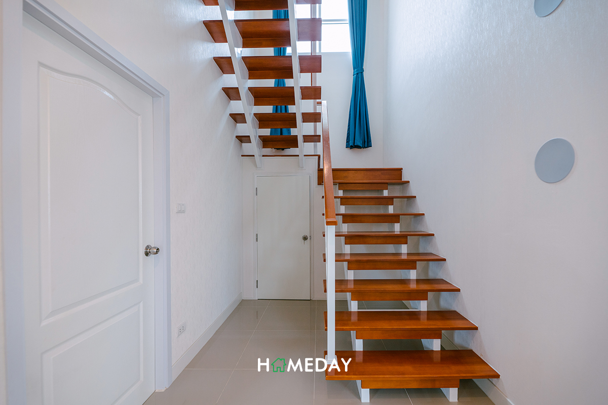 เดินมาที่โถงทางเดินกันบ้างค่ะ จุดแรกจะเป็นบันไดทางขึ้นชั้น 2 อยู่เชื่อมกับประตูสำรองบริเวณโรงจอดรถ ด้านใต้บันได้มีห้องเก็บของมาให้ด้วยค่ะ สามารถใช้จัดเก็บอุปกรณ์หรือของใช้ต่าง ๆ ที่ไม่ค่อยได้หยิบใช้งานได้เลย ส่วนตัวบันไดเอง ก็ออกแบบมาในลักษณะที่โปร่ง ทำให้สามารถใช้วางของเพิ่มเติมได้เลยค่ะ