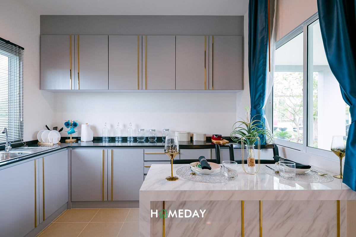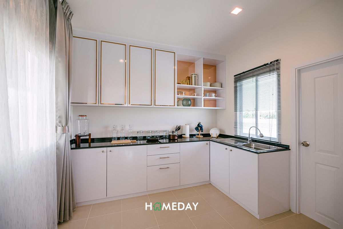 พื้นที่ครัวของบ้านนี้ก็เป็นลักษณะครัวเปิดเช่นกันค่ะ เราสามารถติดตั้ง Partition เพิ่มเติมให้กลายเป็นครัวปิดได้เองเลยค่ะ หรือถ้าอยากจะปล่อยพื้นที่ให้เชื่อมกัน หากไม่ได้ใช้งานหนักมากนักก็คงไว้เป็นครัวเปิดแบบนี้ก็ดีไปอีกแบบค่ะ หรือถ้าอยากจะทำห้องนี้เป็นห้องอื่นแทน แล้วปรับส่วนลานซักล้างเป็นครัวไทยด้านนอก ก็สามารถทำได้นะคะ