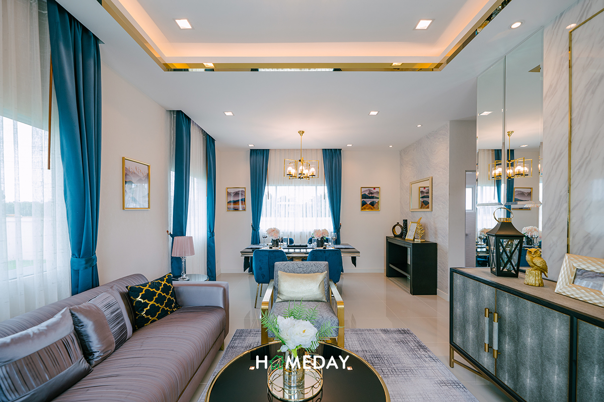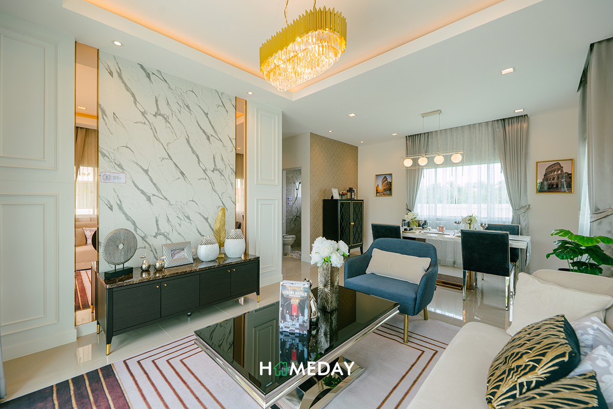 Living Area ของแบบบ้านนี้ขนาดกว้างขวางไม่แพ้กันเลยค่ะ ตัวโซฟาสามารถวางขนาดใหญ่ได้เต็มที่ 4 ที่นั่งขึ้นไปได้เลยค่ะ จะวางเป็นตัวยาวเข้ามุมรูปตัว L หรือเพิ่มอาร์มแชร์สักตัวเพื่อจัดสัดส่วนแบ่งโซนระหว่างมุม Dining ก็ดูดีค่ะ เนื้อที่เหลือเพียงพอ สามารถวางโต๊ะกลาง และชั้นวางทีวีขนาดใหญ่ได้สบาย ๆ เลยค่ะ