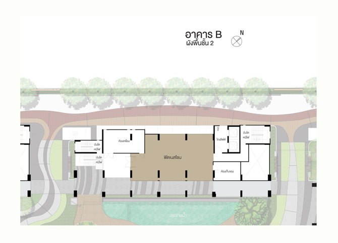 อาคารชุดพักอาศัย B ชั้นล่าง : โถงทางเข้า, กล่องรับจดหมาย, ห้องนํ้าชาย-หญิง-คนพิการ, ที่จอดรถยนต์และสระว่ายน้ำชั้น 2 : ฟิตเนสโซน, ห้องเครื่องและห้องเก็บของชั้น 3-22 : ห้องชุดพักอาศัย