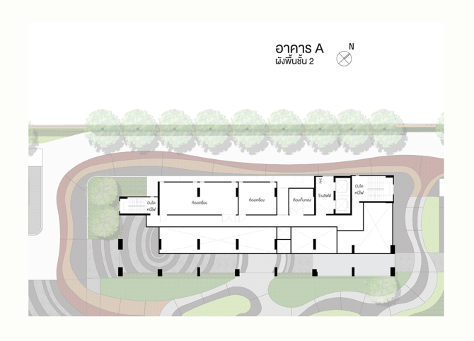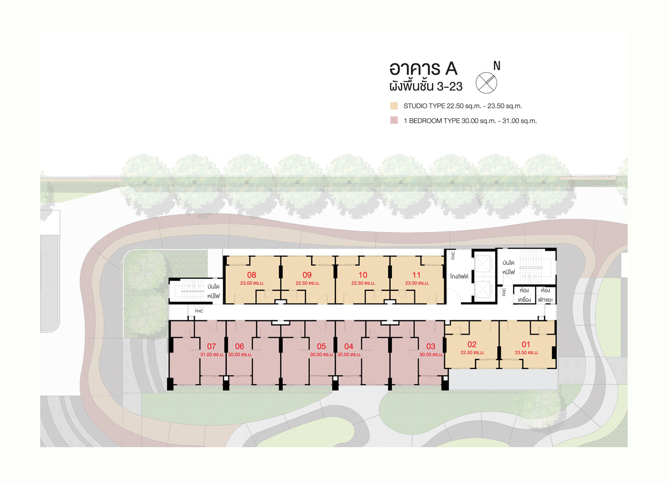 อาคารชุดพักอาศัย A ชั้นล่าง : โถงทางเข้า, กล่องรับจดหมาย, สำนักงานนิติบุคคล, ห้องบริการจัดการพัสดุ, ห้องพักช่าง, ห้องเครื่องและที่จอดรถยนต์ชั้น 2 : ห้องเครื่องและห้องเก็บของชั้น 3-23 : ห้องชุดพักอาศัย