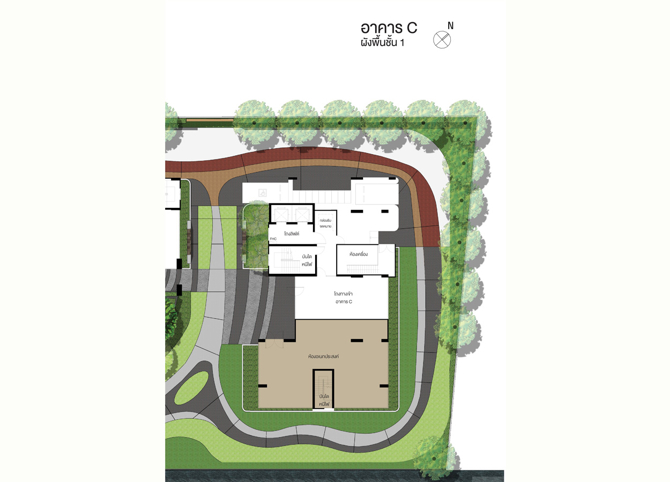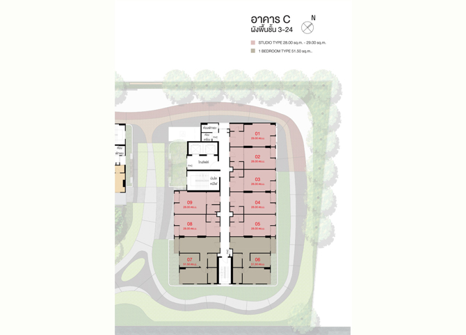 อาคารชุดพักอาศัย C ชั้นล่าง : โถงทางเข้า, กล่องรับจดหมาย, ห้องอเนกประสงค์, ห้องเครื่องและที่จอดรถยนต์ชั้น 2 : ห้องเครื่องและห้องเก็บของชั้น 3-24 : ห้องชุดพักอาศัย